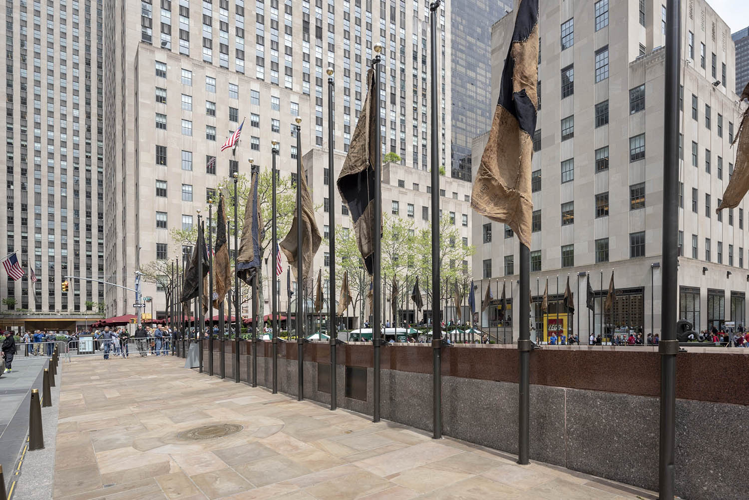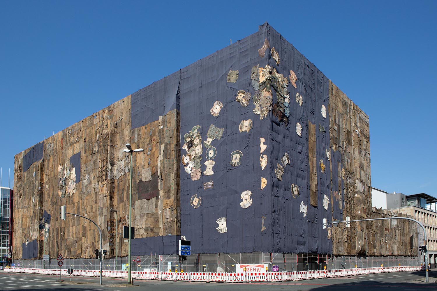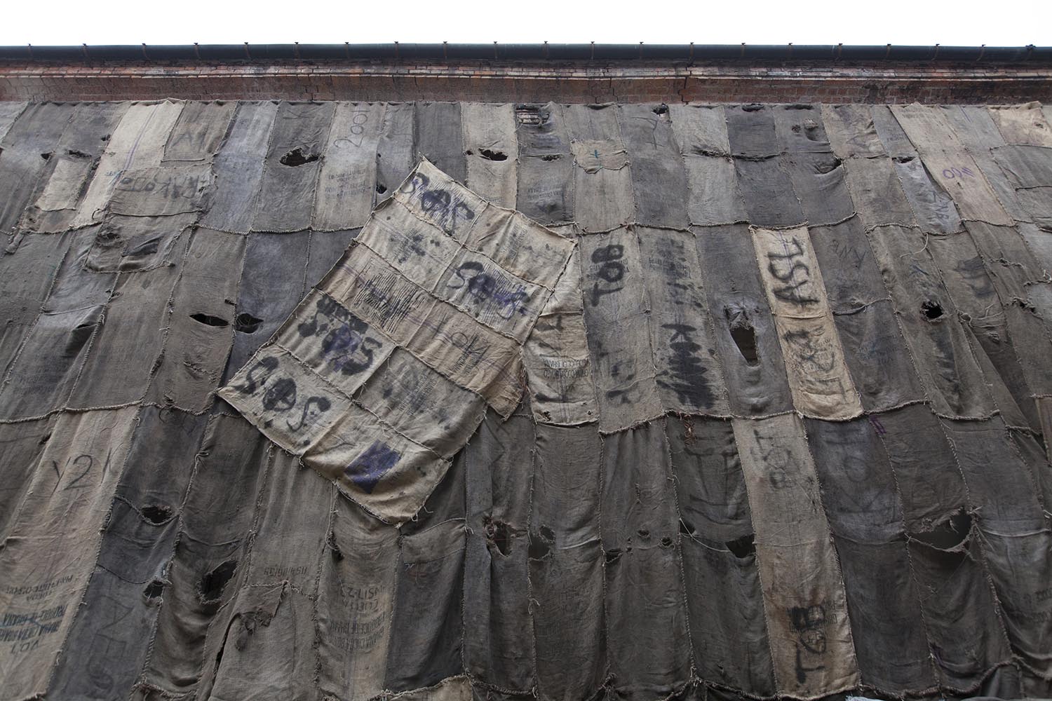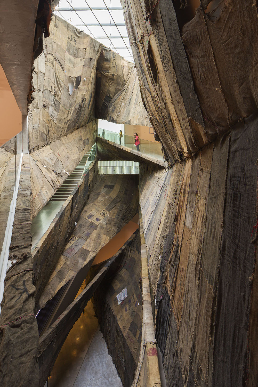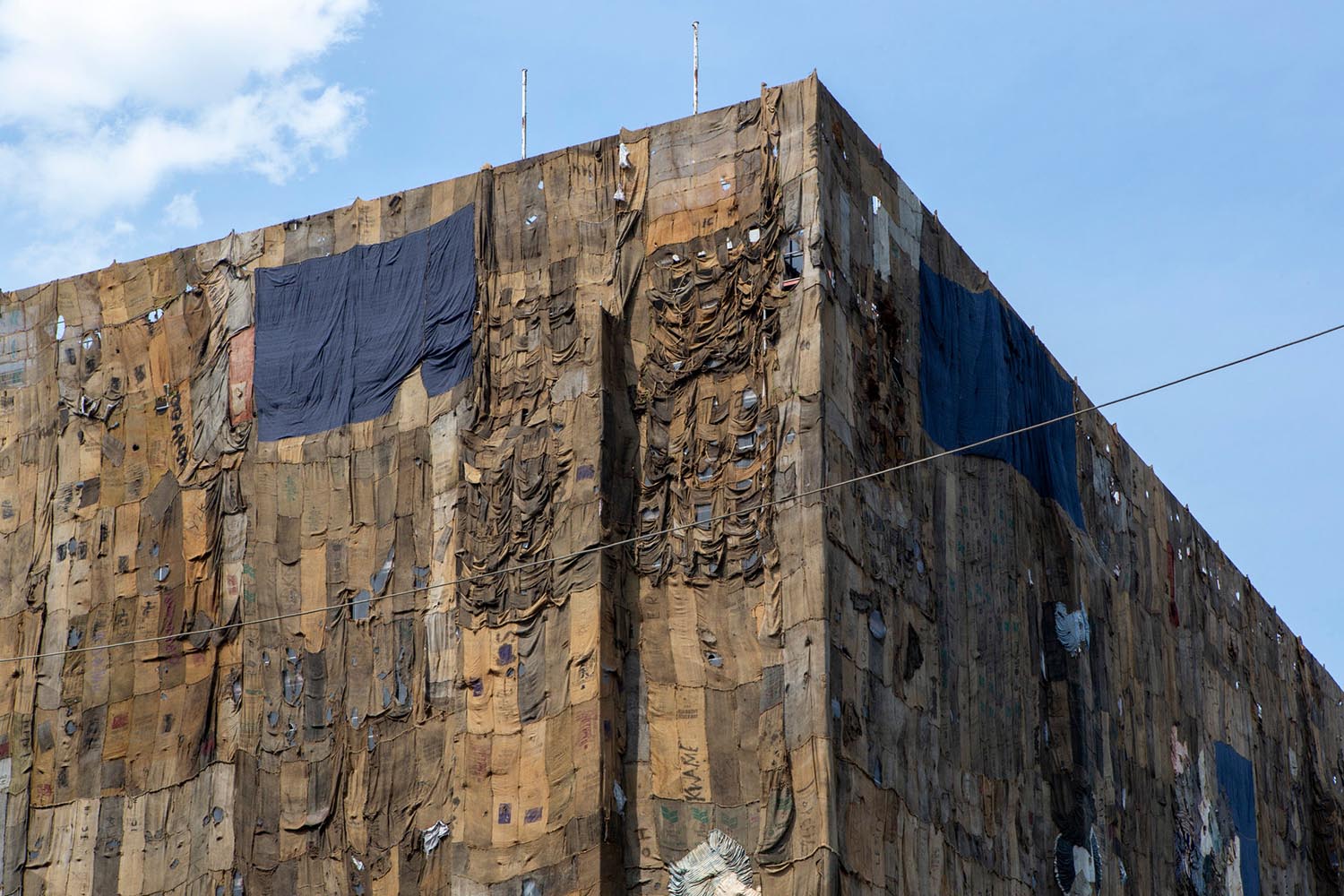 Son muchas las ocasiones en las que ha utilizado sacos remendados con residuos textiles a modo de patchwork. Con ellos ha cubierto bibliotecas, museos, puentes y aeropuertos. Destacamos Civil Aviation, Airport (2014) en Ghana, Material Effects(2014) en Michigan Art Museum, Fracture(2016) en Tel Aviv Museum (2016) o A Friend(2019) en Milán. Se trata de un archivo vivo: una nueva piel que se extiende en el paisaje urbano y que confronta los entresijos ocultos del legado imperialista y la mano de obra barata. “La esperanza es que estos sacos —manchados, rotos y abandonados, pero portadores de luz— nos conduzcan a nuevos lugares”.