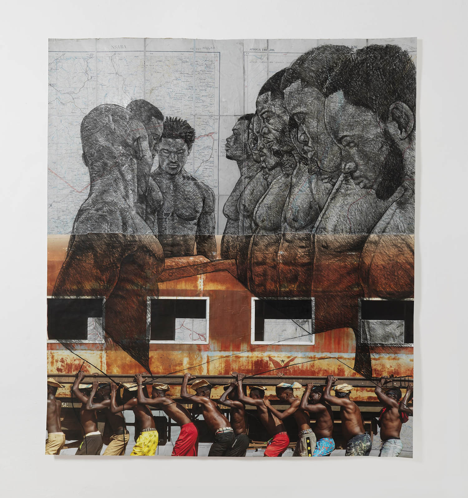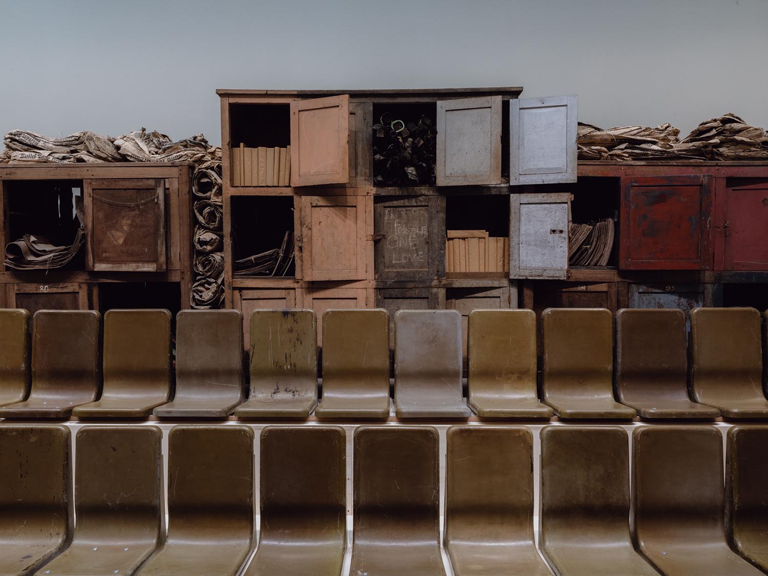 Ampliando su foco, Ibrahim Mahama también se mueve en el territorio de la fotografía, el dibujo y las estructuras elaboradas con objetos de marcado peso colonial. Una de las más famosas será Parliament of Ghosts, concebida originalmente para The Whitworth Gallery de Mánchester (2019). “La pieza consistía en un ensamblaje de elementos y materiales históricos de la estación de ferrocarril de Sekondi, donde se encontraba la sede original del Ferrocarril de la Costa Dorada, construido durante el dominio colonial británico y ahora abandonado. La idea original era transportar dos viejas locomotoras de Ghana a Mánchester. Aunque esto no fue posible, sí se pudieron traer asientos de madera, taquillas con ropa, herramientas de trabajo, documentos, cuadernos de bitácora y mapas descoloridos recuperados de los archivos. El proyecto, por tanto, pretendía crear un lugar donde la gente pudiera sentarse y entablar una conversación capaz de suscitar una reflexión crítica sobre la historia, sus traumas y sus fracasos”.