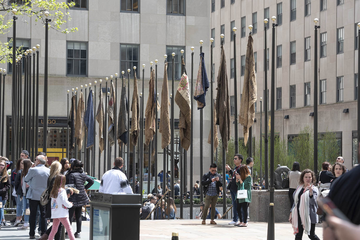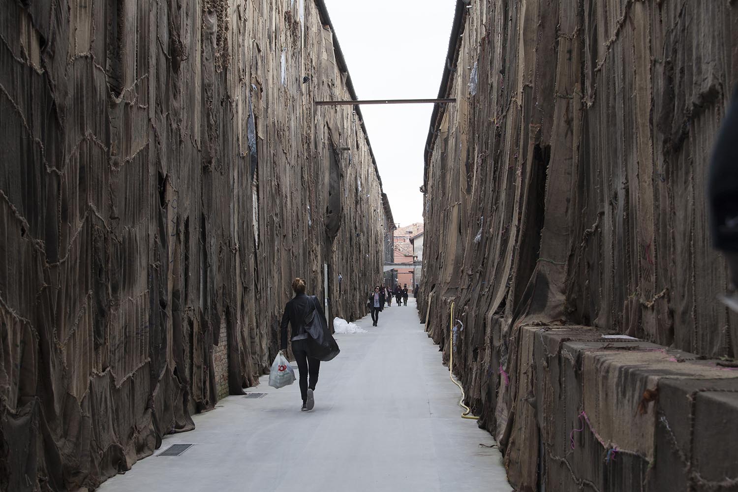 De todas estas instalaciones, cabe destacar Out of Bounds(2015): un despliegue de sacos que cubría las paredes del Arsenaleen la 56ª Bienal de Venecia; y en un contexto global trazó un pasillo en el tiempo: una pasarela donde las gafas de Prada y las zapatillas de Balenciaga se convivían con esas otras almas que tocaron los tejidos en el pasado. El momento en el que palabras como reparación, poscolonial y redistribución entraban en el diccionario artístico del siglo XXI.