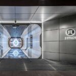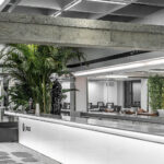 Este interiorismo futurista busca obtener mediante la arquitectura escenas disruptivas que favorezcan esta desconexión. El gran patio central dirige la atención hacia lo que hay dentro para que las miradas no escapen hacia fuera, los acabados brillantes y la estética industrial de instalaciones vistas ayudan a que nos sintamos en una nave nodriza; pero es el uso de la vegetación lo que aporta el desconcierto necesario para que el experimento funcione.