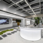 Daga Architects proponen un interiorismo futurista que rompe cualquier vínculo con el exterior del ámbito laboral. Su propuesta busca obtener mediante la arquitectura escenas disruptivas que favorezcan esta desconexión.