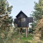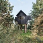 Esta percepción queda plasmada en un volumen contundente que se pavonea sobre unos soportes rugosos, hechos de troncos de robinia sin tratar. La fachada principal mira hacia la vegetación a través de un ventanal que se quiere resguardar bajo la visera de una cubierta a dos aguas. Si completamos el recorrido alrededor de la casa, descubrimos cómo aparece una escalera metálica, completamente ajena al conjunto, que refuerza la idea de que se trata de un elemento que acaba de aterrizar. El frontal continúa y se suaviza en las esquinas; genera una piel completa que, junto a la textura Yakisugi, ayuda a entender la obra como un elemento orgánico, algo crecido más que creado.
