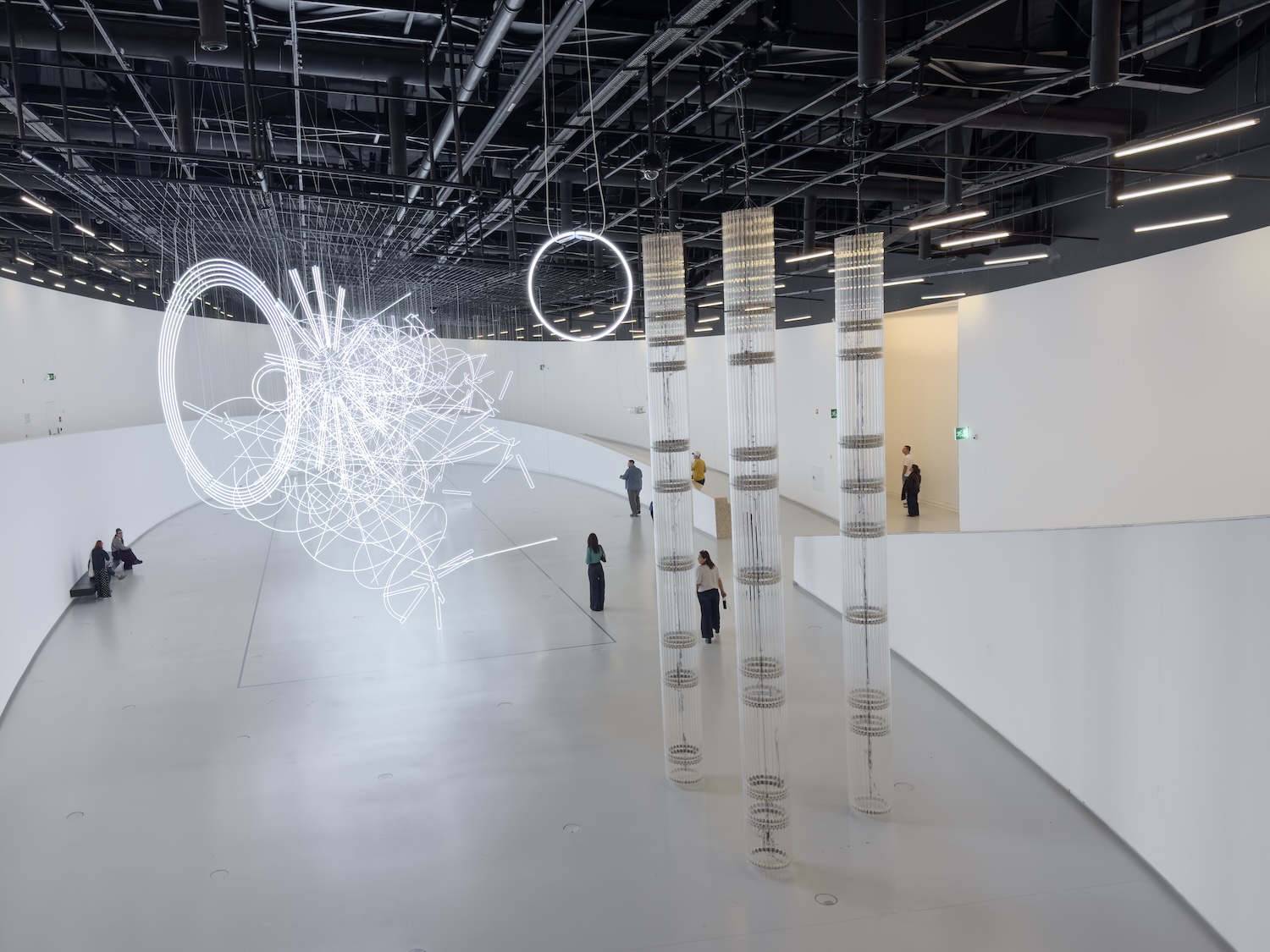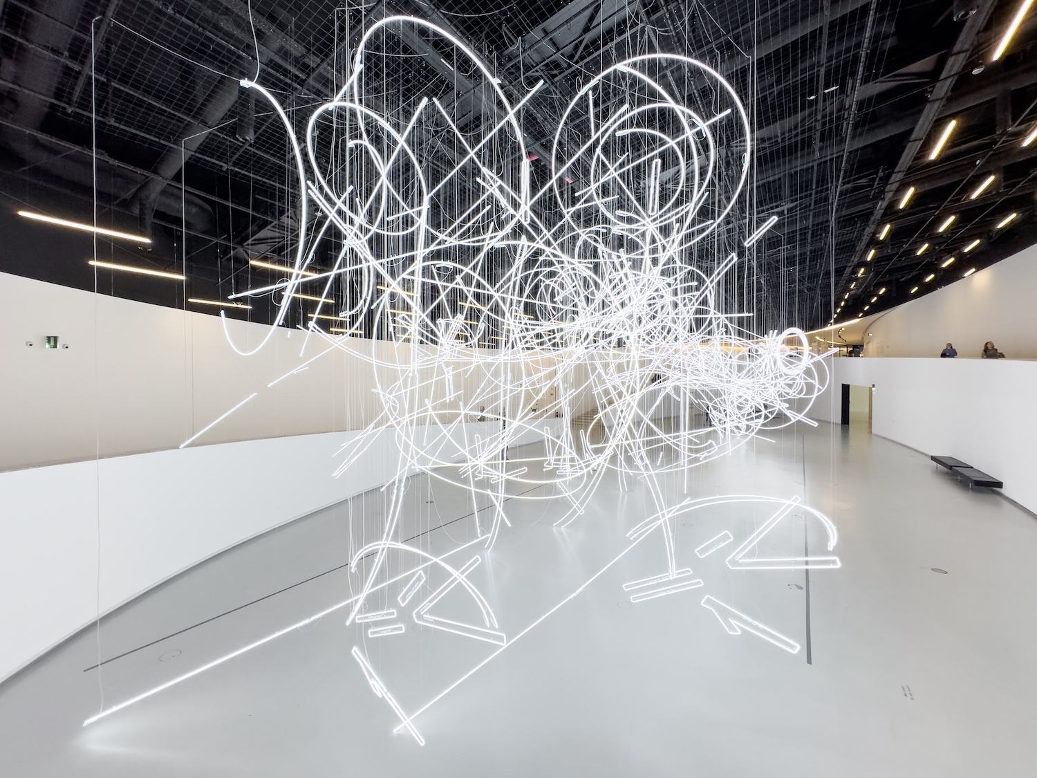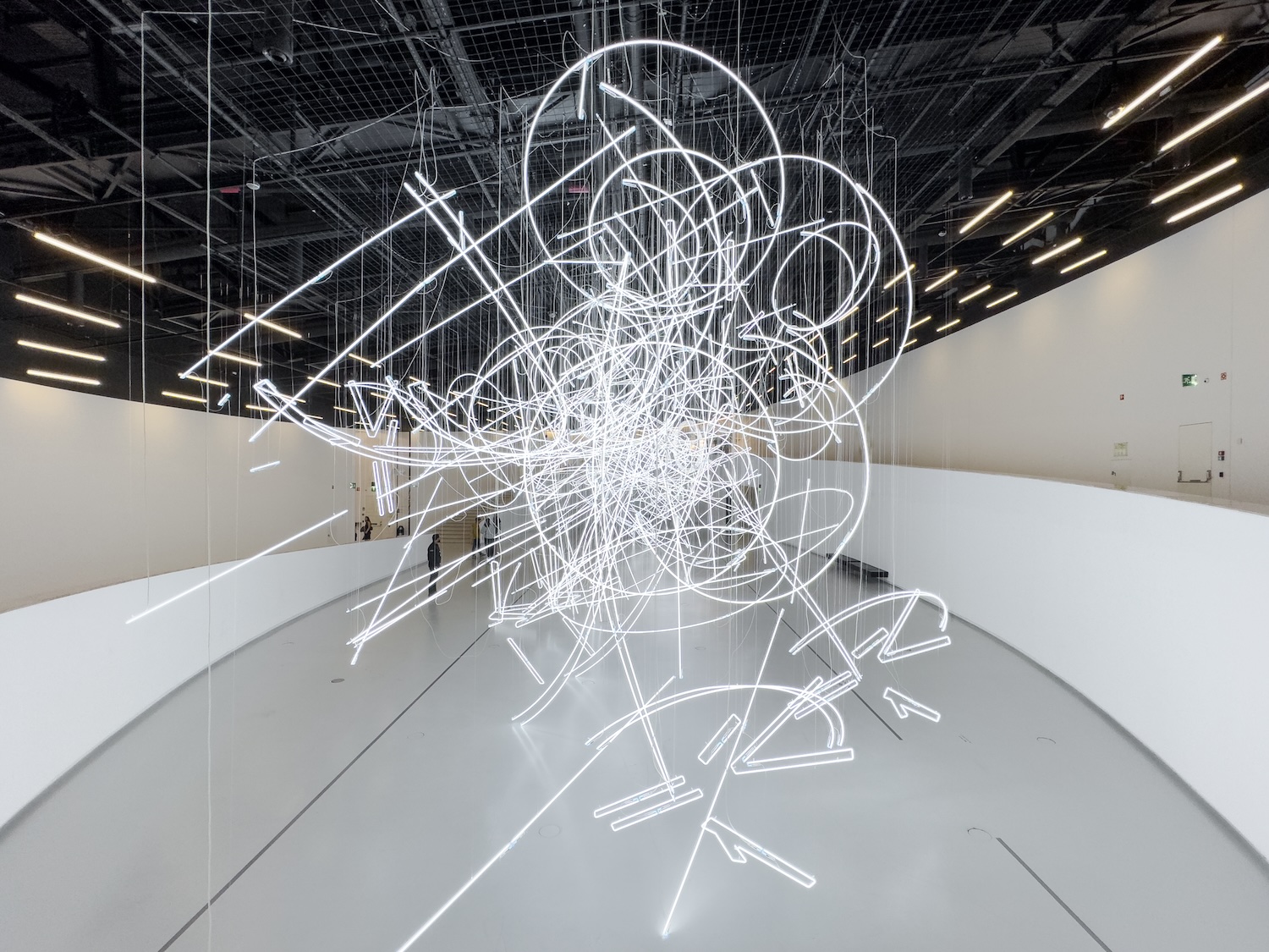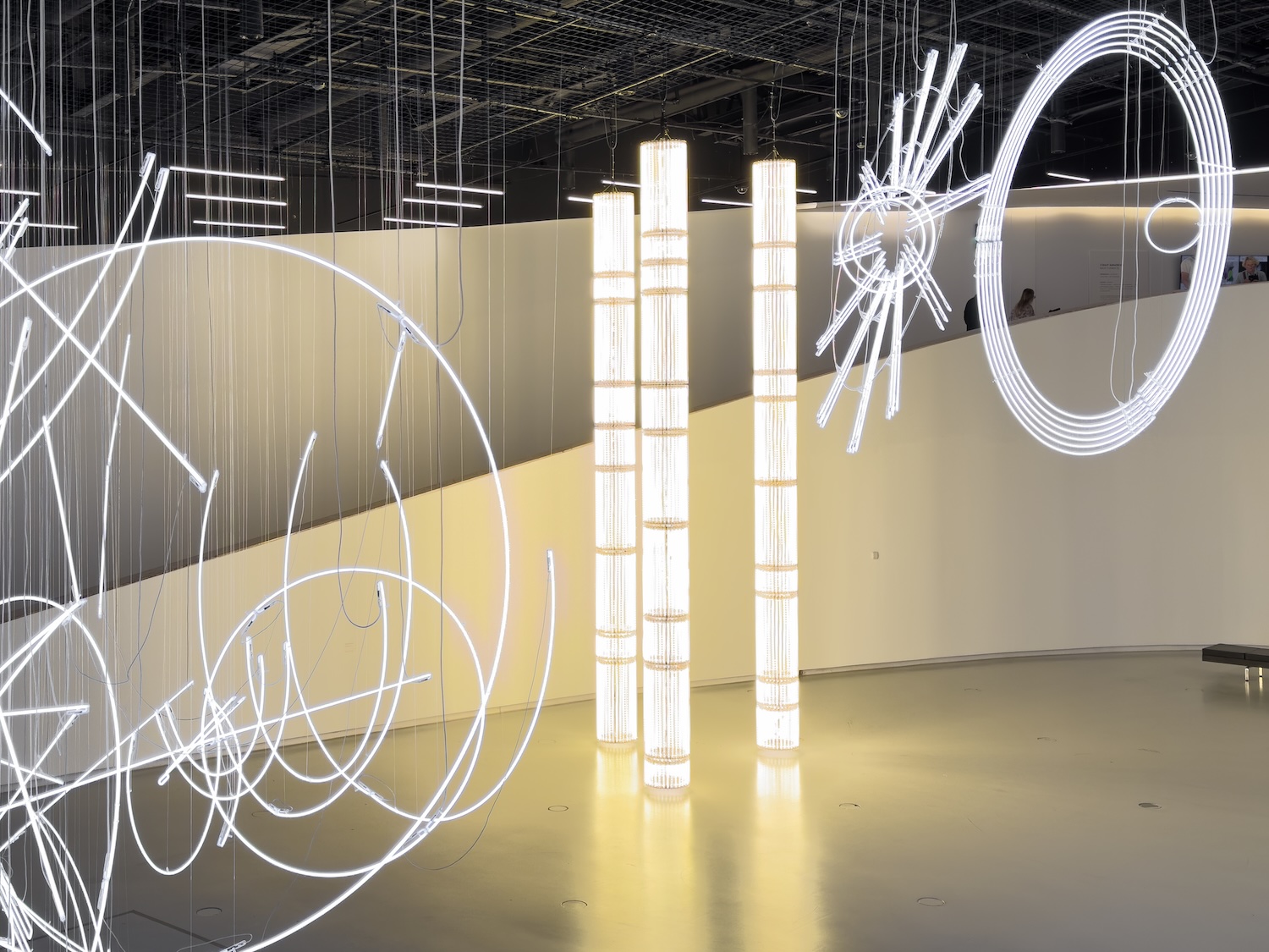 La obra de Evans destaca por su extremo refinamiento técnico y su capacidad para convertir referencias literarias, filosóficas y científicas en experiencias sensoriales directas. El artista galés se mueve con libertad entre medios y escalas, combinando escultura, instalación, texto, luz y vídeo. En la Galería Oval del MAAT, Forms in Space… by Light (in Time) (2017) despliega con magnificencia casi dos kilómetros de tubos de neón, que trazan en el aire un dibujo multidimensional de más de 30 metros de longitud. Como un organismo celestial que recuerda los Oculist Witnesses de Duchamp y los diagramas kata del teatro noh japonés, la pieza carece de frente o lados y no dicta cómo debe mirarse: invita a múltiples perspectivas y lecturas. Cerca, StarStarStar/Steer (Transphoton) (2019) profundiza esta investigación sensorial: sus columnas de ledes pulsan con el ritmo lento de una respiración, oscilando entre la transparencia absoluta y la luz cegadora.
