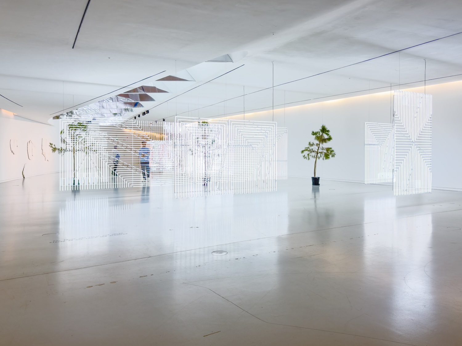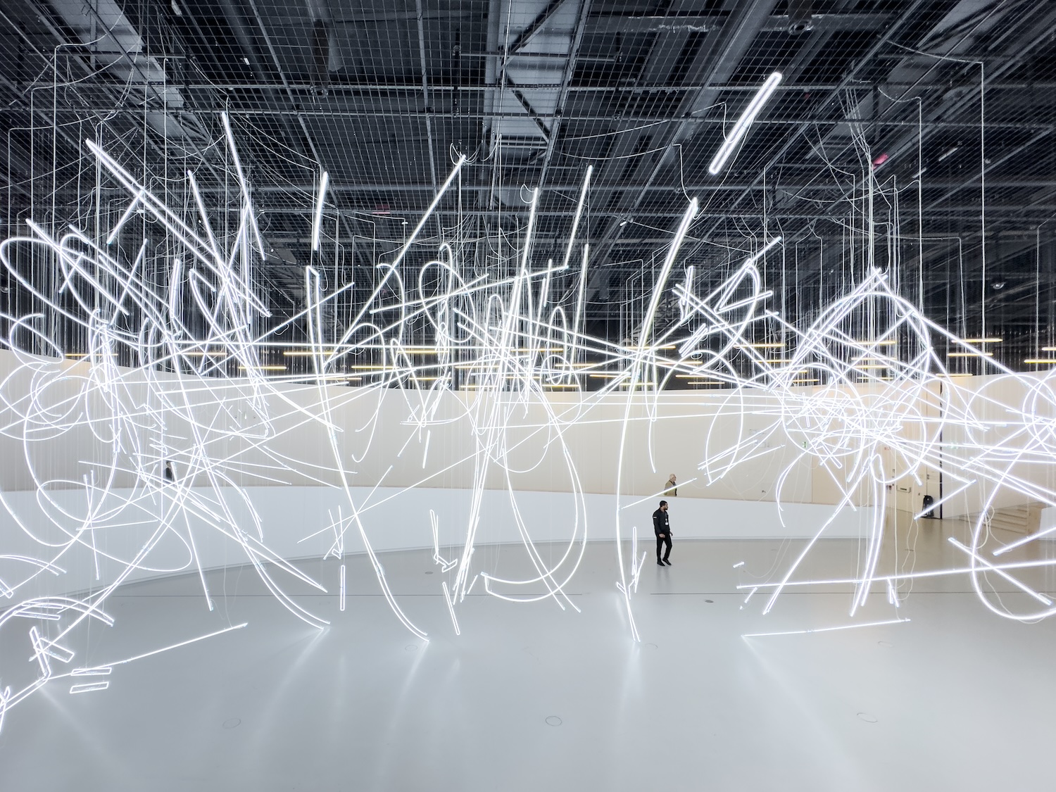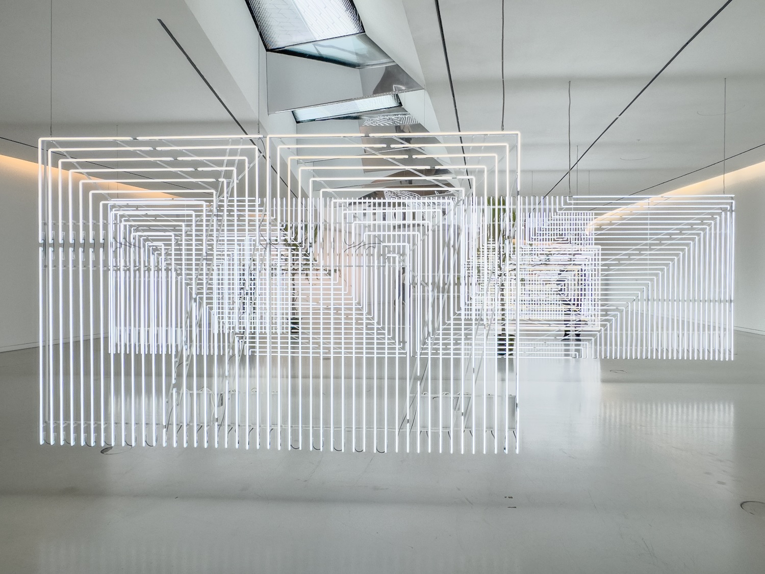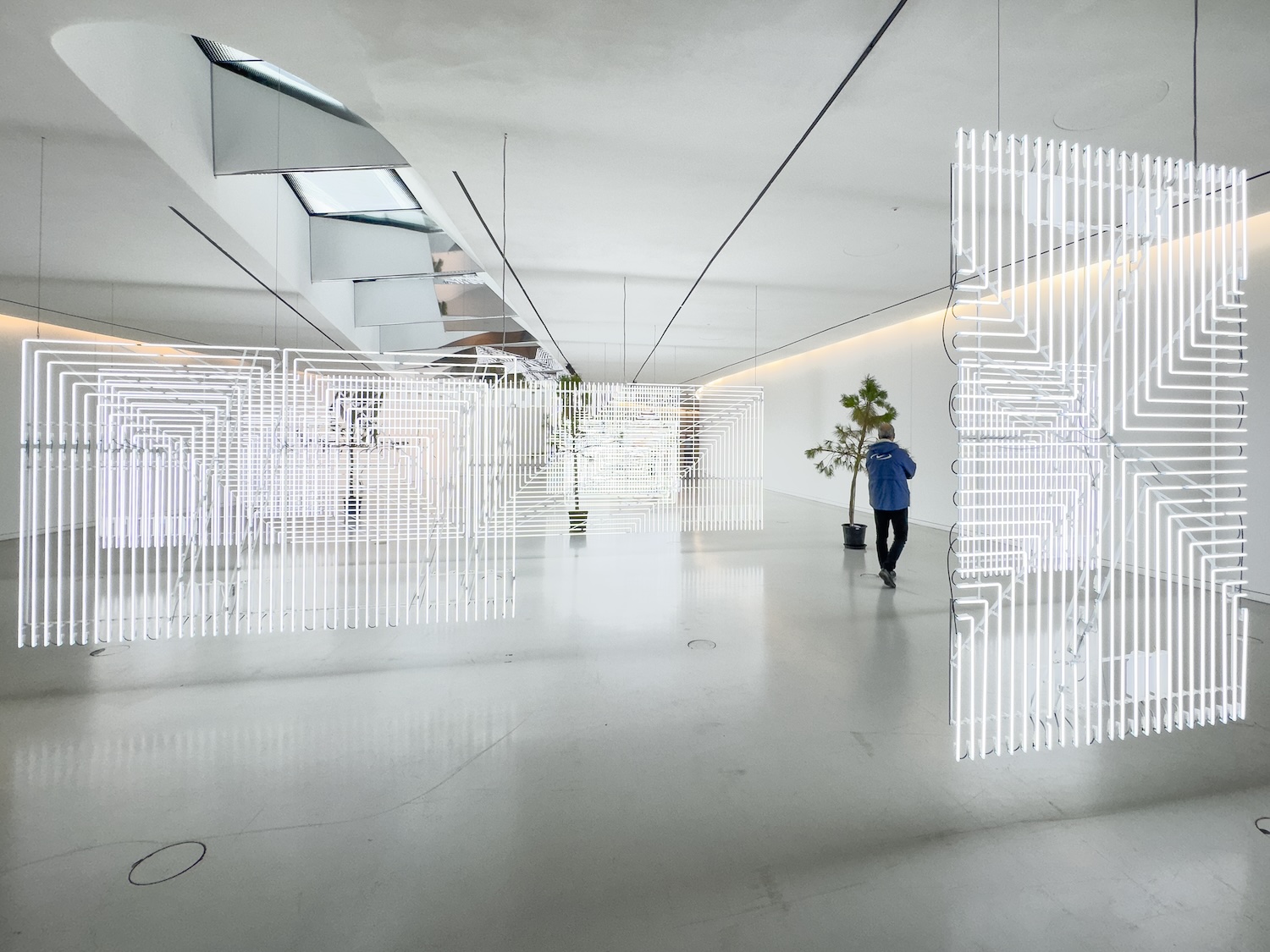 La obra de Evans destaca por su extremo refinamiento técnico y su capacidad para convertir referencias literarias, filosóficas y científicas en experiencias sensoriales directas. El artista galés se mueve con libertad entre medios y escalas, combinando escultura, instalación, texto, luz y vídeo. En la Galería Oval del MAAT, Forms in Space… by Light (in Time) (2017) despliega con magnificencia casi dos kilómetros de tubos de neón, que trazan en el aire un dibujo multidimensional de más de 30 metros de longitud. Como un organismo celestial que recuerda los Oculist Witnesses de Duchamp y los diagramas kata del teatro noh japonés, la pieza carece de frente o lados y no dicta cómo debe mirarse: invita a múltiples perspectivas y lecturas. Cerca, StarStarStar/Steer (Transphoton) (2019) profundiza esta investigación sensorial: sus columnas de ledes pulsan con el ritmo lento de una respiración, oscilando entre la transparencia absoluta y la luz cegadora.