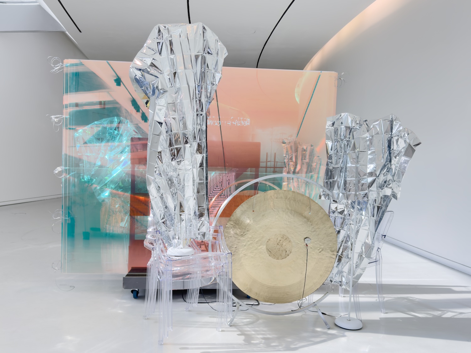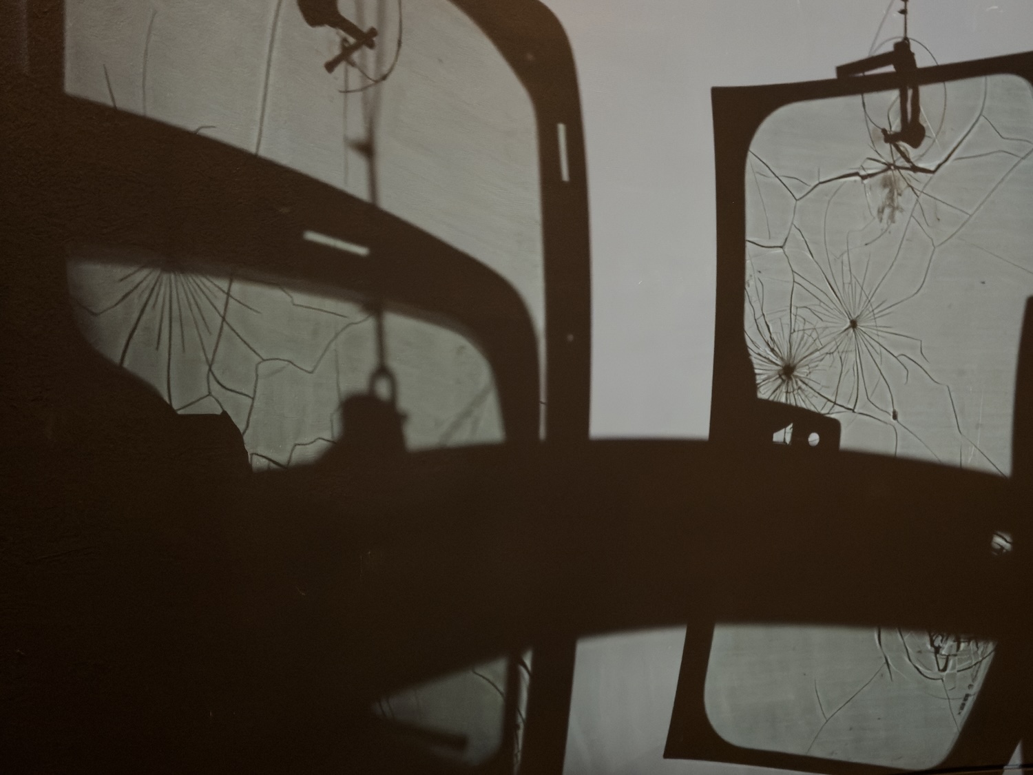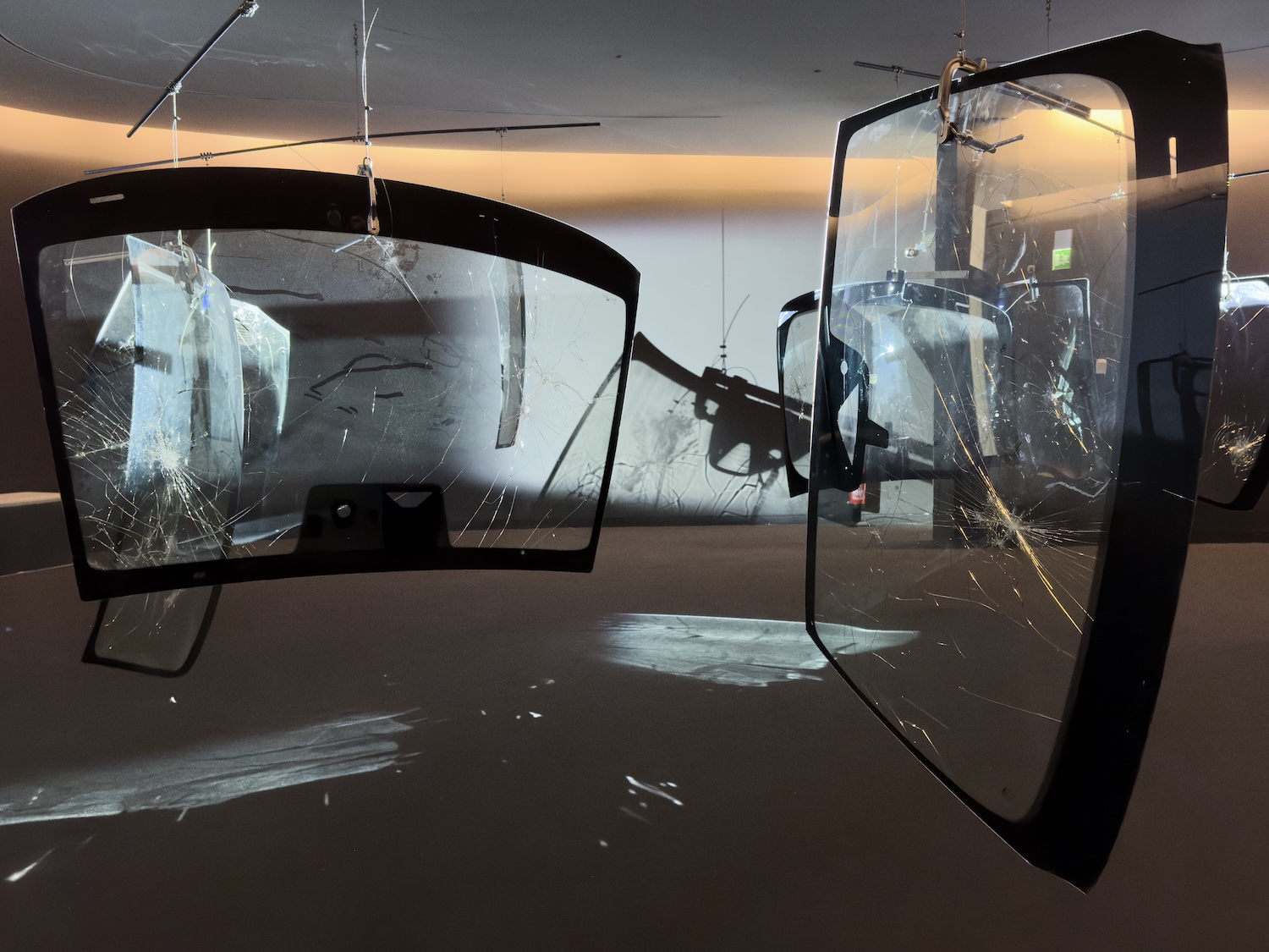 El sonido emerge como elemento estructurante en otras creaciones. En Composition for Flutes (2017), un dispositivo mecánico transforma el aire en notas cristalinas que mezclan armonía y disonancia, mientras Audio Column (Incarnation Lisboa) (2025) proyecta frecuencias captadas por telescopios, inyectando un eco del cosmos al recinto expositivo. Otra intervención abrumadora es Phase Shift I with projections (after David Tudor) For MAAT (2025): parabrisas rotos flotan en la oscuridad como restos de un accidente suspendido en el tiempo. Este hechizo óptico convoca a David Tudor y al célebre vidrio roto de Duchamp. Pero Evans lo filtra a su manera: el neón se cuela por cada grieta y las sombras mutan sin cesar. El resultado es una constelación móvil de reflejos, un vaivén de luces con el que el artista configura el espacio en cada destello.