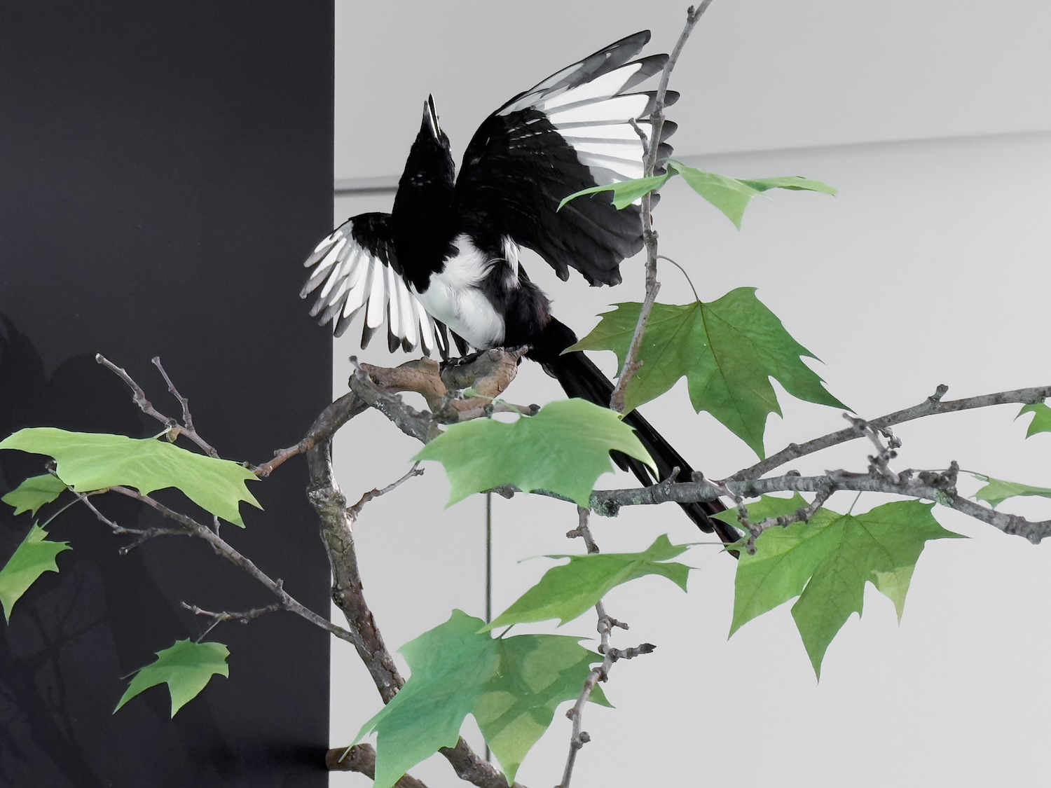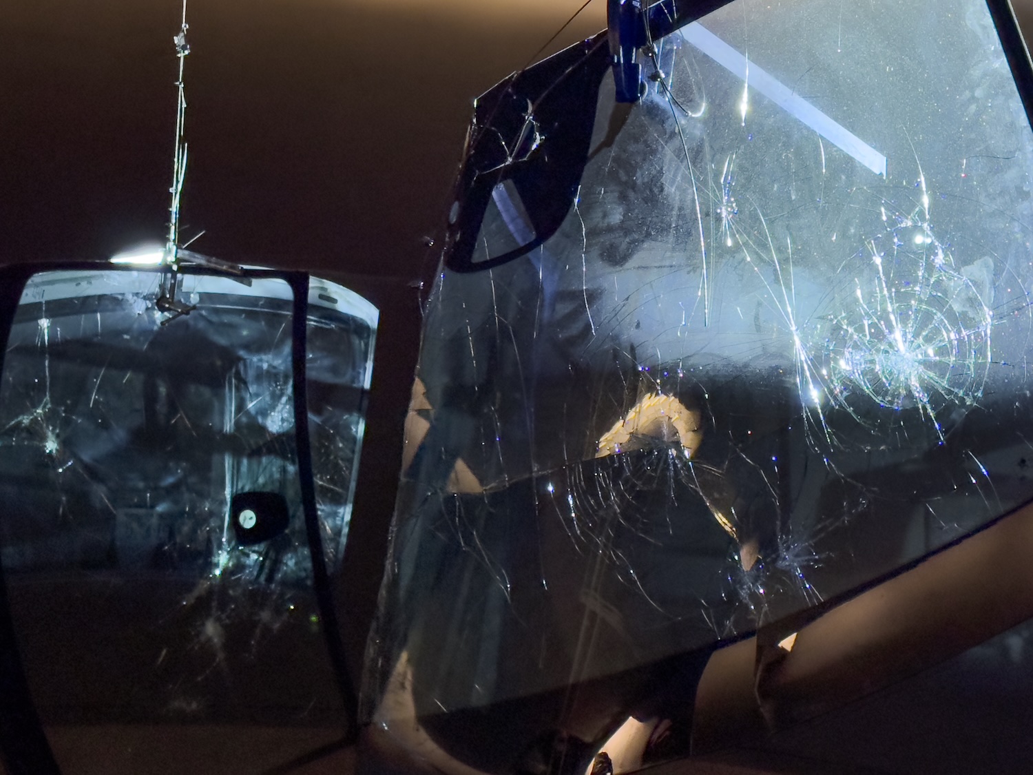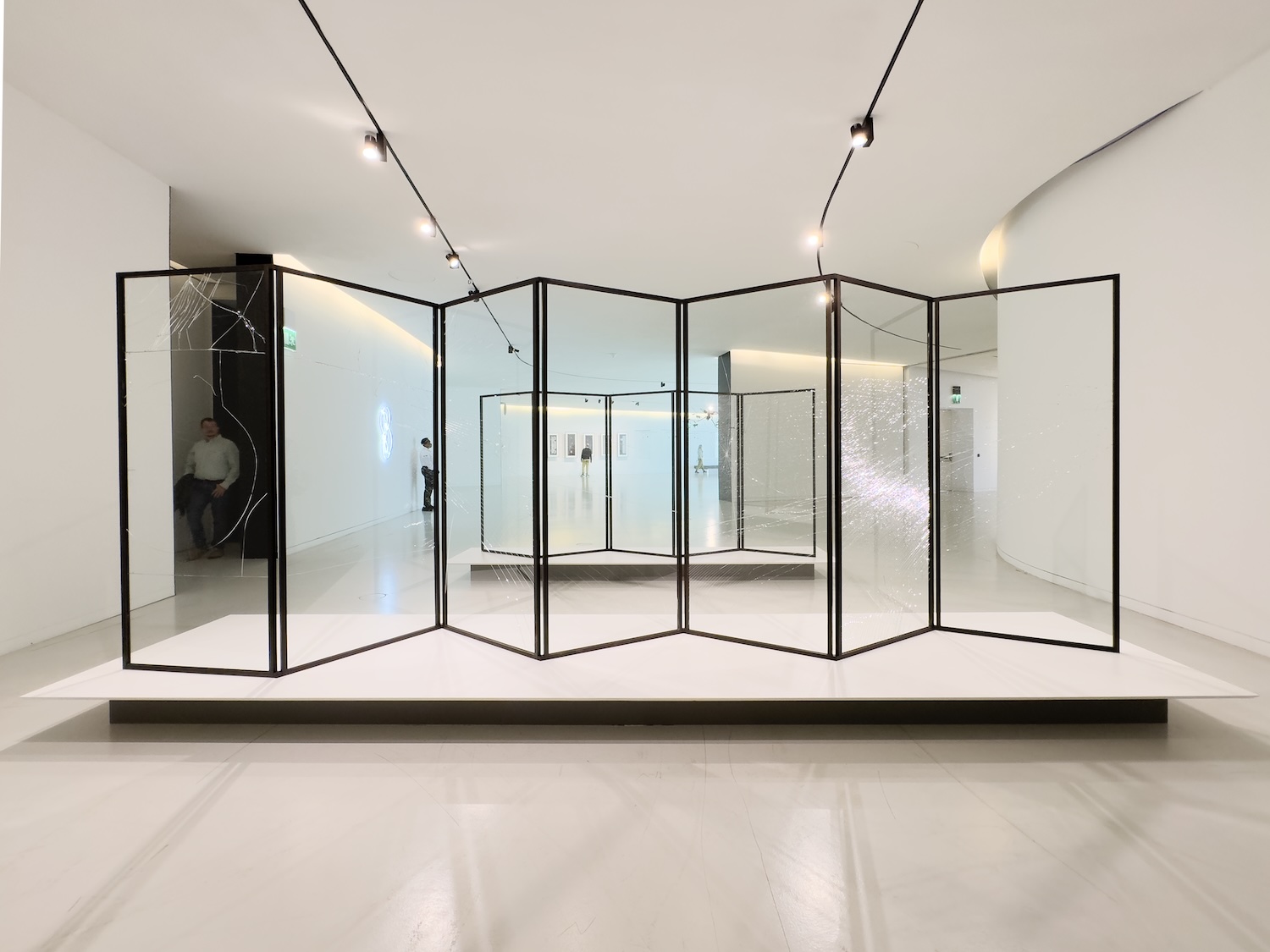 El sonido emerge como elemento estructurante en otras creaciones. En Composition for Flutes (2017), un dispositivo mecánico transforma el aire en notas cristalinas que mezclan armonía y disonancia, mientras Audio Column (Incarnation Lisboa) (2025) proyecta frecuencias captadas por telescopios, inyectando un eco del cosmos al recinto expositivo. Otra intervención abrumadora es Phase Shift I with projections (after David Tudor) For MAAT (2025): parabrisas rotos flotan en la oscuridad como restos de un accidente suspendido en el tiempo. Este hechizo óptico convoca a David Tudor y al célebre vidrio roto de Duchamp. Pero Evans lo filtra a su manera: el neón se cuela por cada grieta y las sombras mutan sin cesar. El resultado es una constelación móvil de reflejos, un vaivén de luces con el que el artista configura el espacio en cada destello.