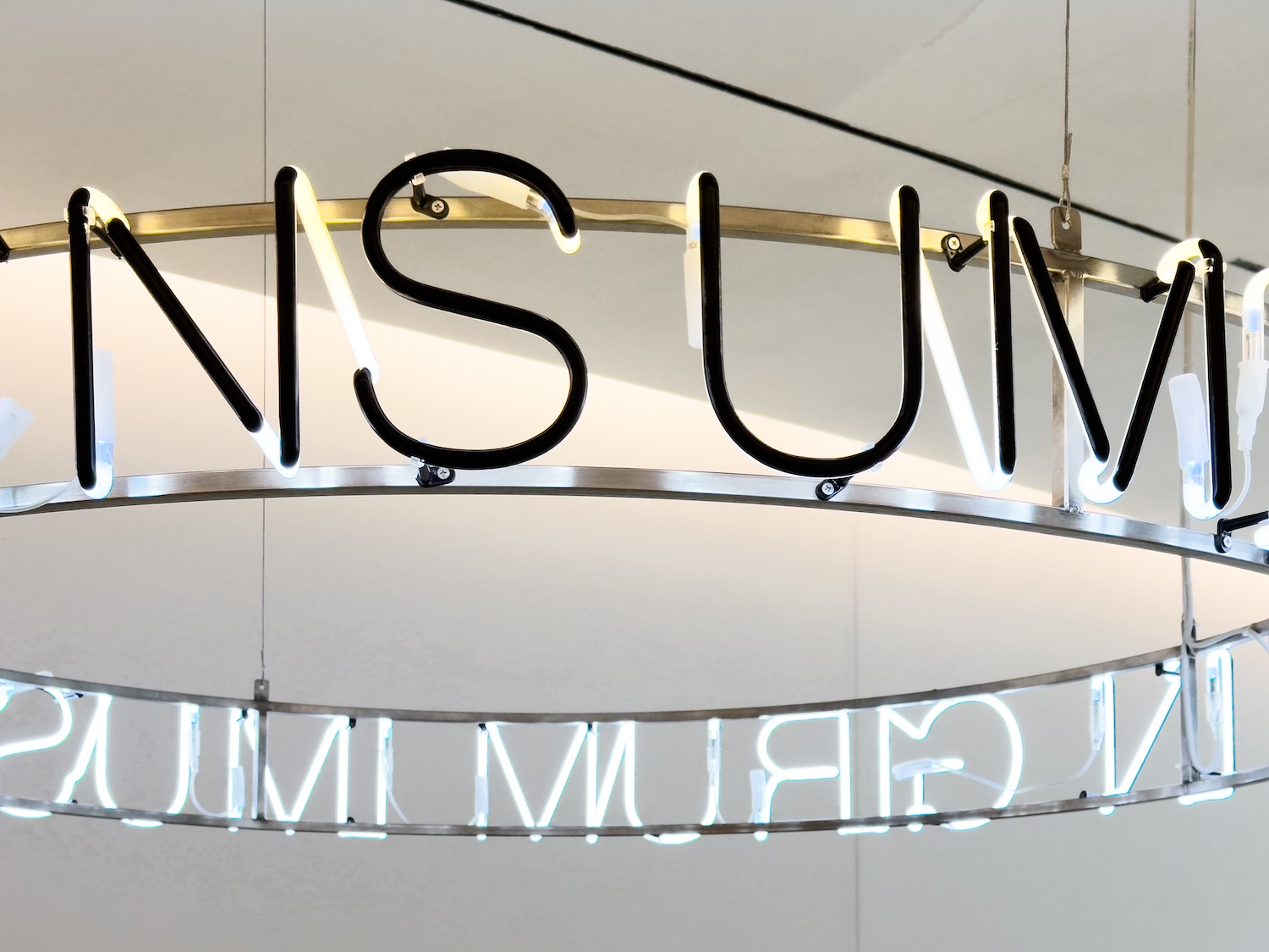 Esta estrategia del palimpsesto se repite en S=U=T=R=A (2017), donde dos arañas de Murano parpadean al unísono con una composición sonora, traduciendo el sonido en albor y cuestionando la unicidad del objeto artístico. Y también en In girum imus nocte et consumimur igni (2008), un palíndromo fluorescente que encierra en su forma circular la crítica incendiaria de Guy Debord hacia la sociedad del espectáculo: Nos movemos de noche y somos consumidos por el fuego. Evans no solo cita a estos pensadores radicales; los reanima, les da un cuerpo lumínico y los inserta en el circuito energético del presente, demostrando que sus ideas no son reliquias, sino herramientas de resistencia sensitiva aún vigentes.