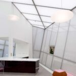 Ha habido muchas casas de vidrio a lo largo de la historia de la arquitectura moderna, pero sin duda la más famosa es la vivienda de 1928 de Pierre Chareau para el Dr. Jean Dalsace en París. Ésta icónica estancia se convirtió en el arquetipo del modernismo doméstico protoindustrial. Otra reminiscencia inevitable enlaza directamente con el cine de Kubrick, al escenario del final de 2001: Una odisea del espacio, por su luminosidad panelada y su toque de ciencia ficción.