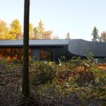 El edificio se configura en dos cuerpos que al juntarse forman una planta en “L”. Los arquitectos resuelven la entrada de luz en el punto de unión de las dos partes desfasando una ligeramente de la otra, de tal modo que ambas zonas cuentan con un pequeño patio protegido parcialmente por la curva que recorta el tejado. Esta idea podría permitir, por un lado, acercar la naturaleza del bosque y, por otro, abrir las vistas de las estancias hacia el paisaje.