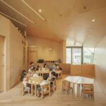 El programa se divide en una guardería infantil y en un auditorio multimedia. Uno ubicado en lo alto, bañado por la luz natural; el otro, bajo el nivel de la plataforma, optimizado su rendimiento por un sofisticado sistema de iluminación artificial. Kuma alude a los legendarios dones de Froebel, el juego infantil de piezas geométricas del siglo XIX y cuya influencia sobre Frank Lloyd Wright —tan importante para los arquitectos japoneses— es de sobra conocida. También se percibe la referencia al Tsumiki, un juego japonés muy similar del que el arquitecto ha desarrollado una variante basada en el triángulo —y en el engarce de componentes más que en su apilamiento— en colaboración con el músico Ryuichi Sakamoto.