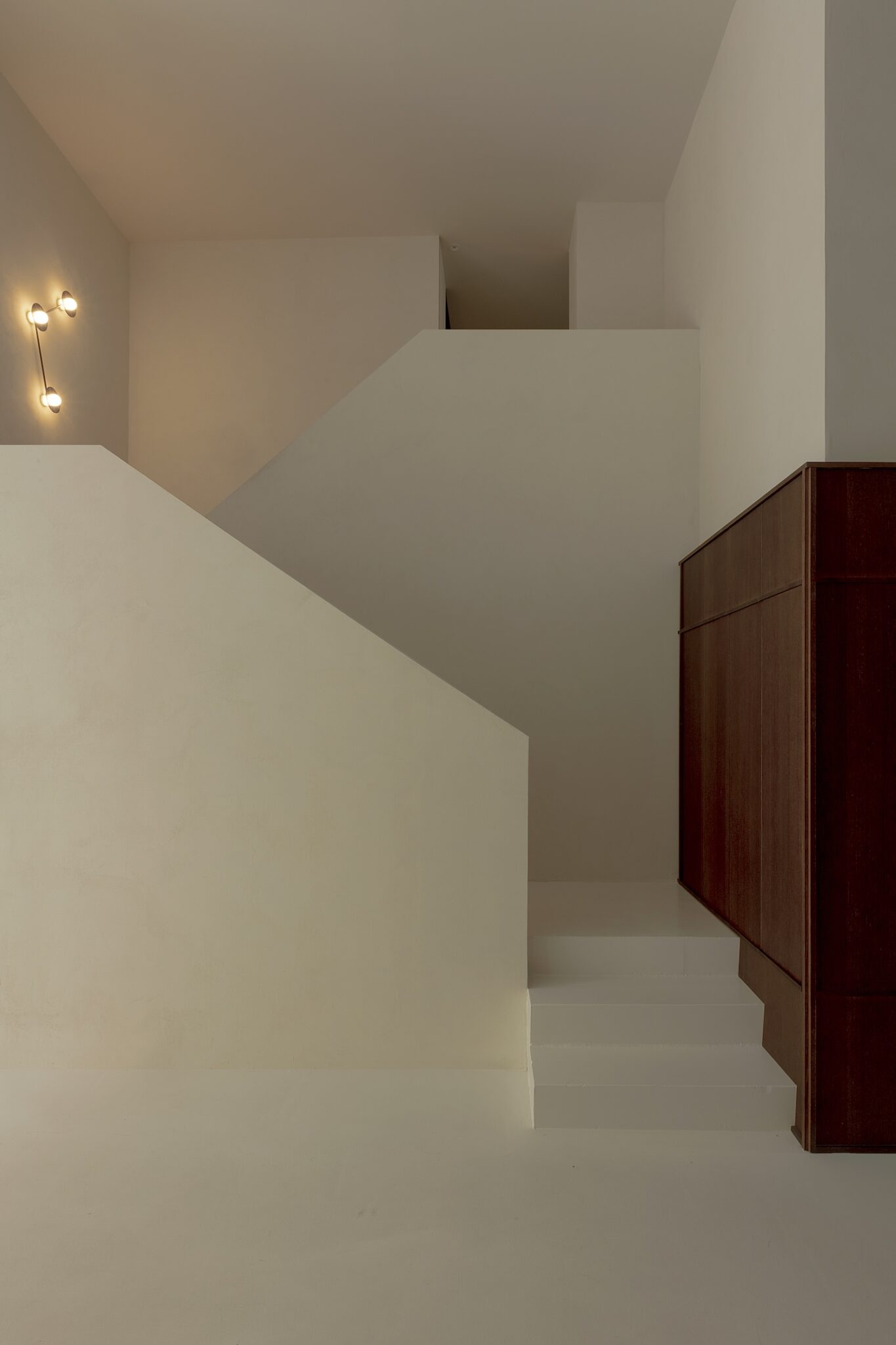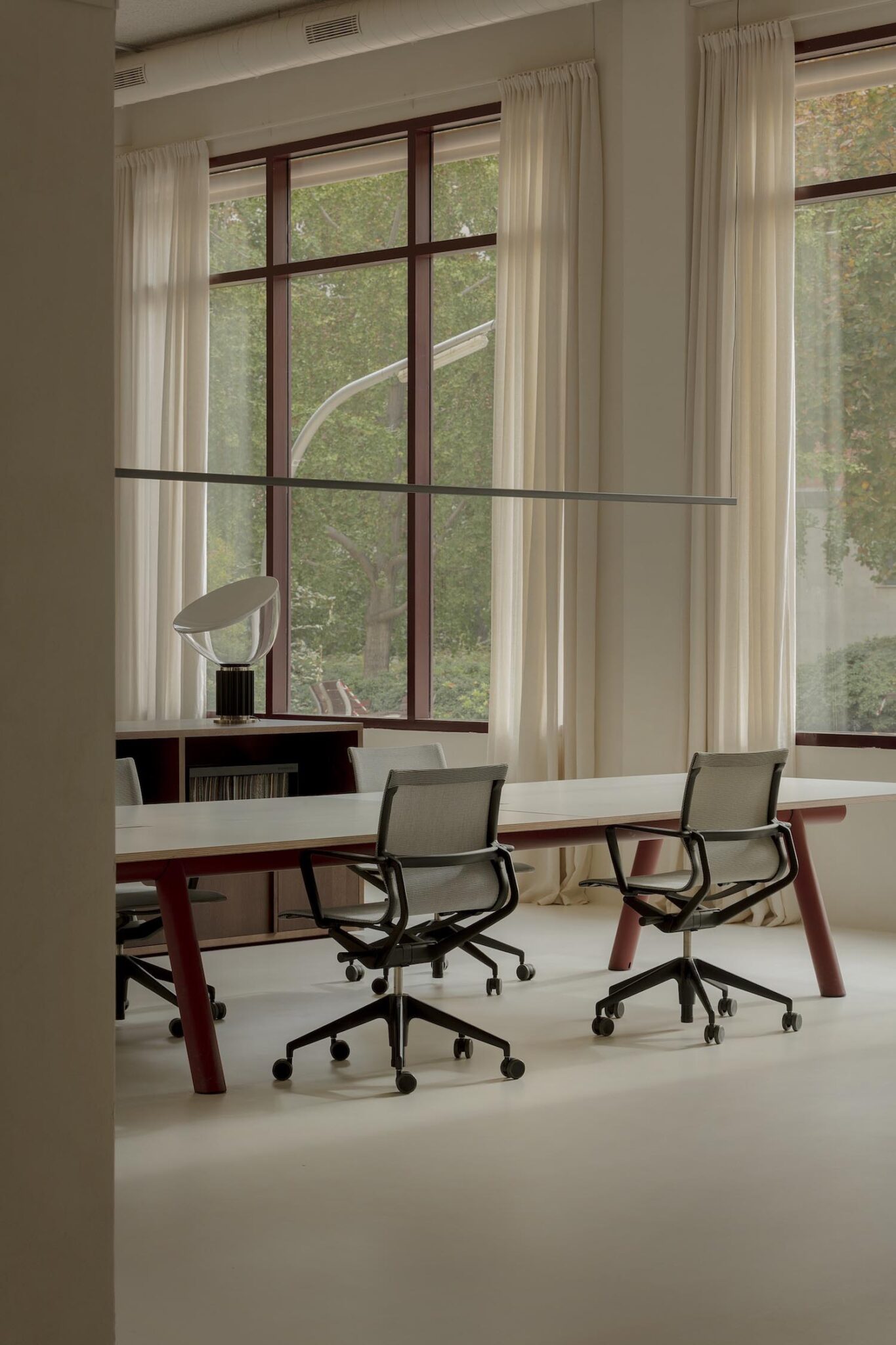 Con más de 600 m² distribuidos en dos alturas, la oficina fue elegida casi por instinto tras sentirse atraídos por la iluminación, la amplitud y la relación directa con el exterior. Proyectada a través de tres grandes ventanales de cuatro metros de altura, la luz —elemento sustancial en todas las propuestas de The Room Studio— se convierte aquí en el hilo conductor entre materia y atmósfera, abriendo el área hacia la plaza y permitiendo así que el interior dialogue con lo que sucede fuera. Una tregua lúcida en medio de su espesura imaginativa, que le confiere el clima perfecto para escuchar y comprender lo que el cliente necesita más allá de sus palabras.