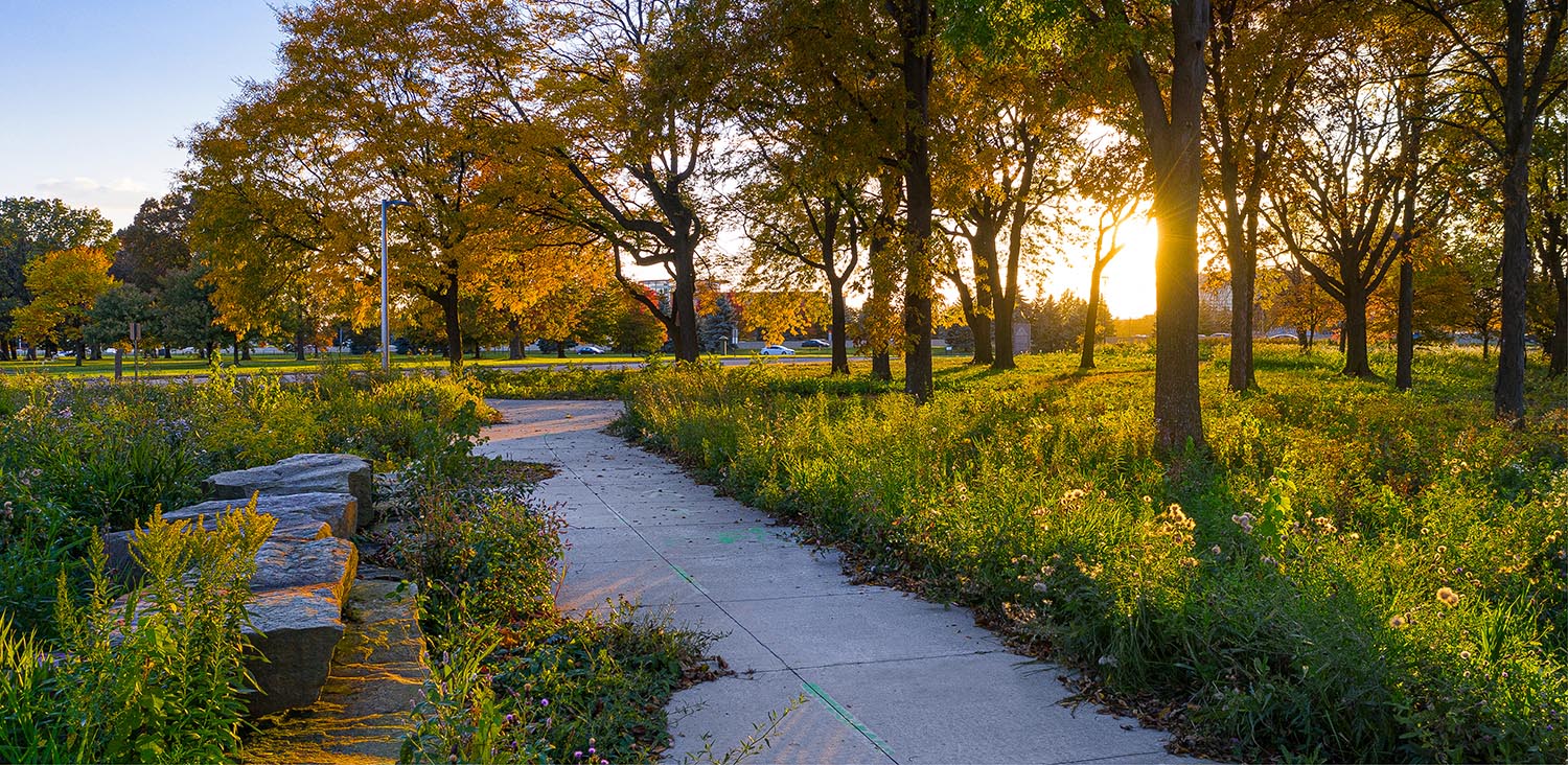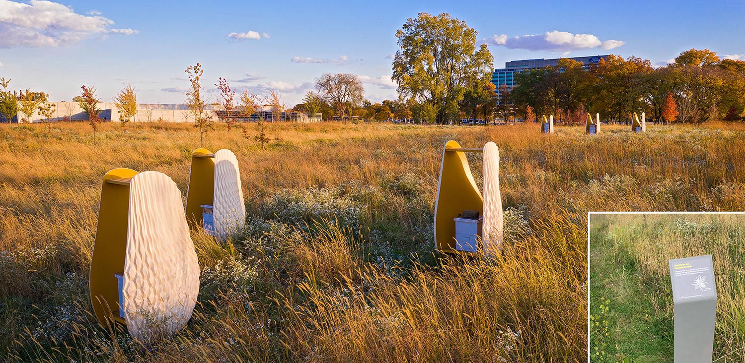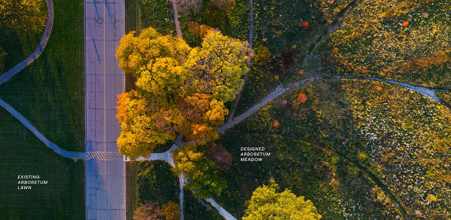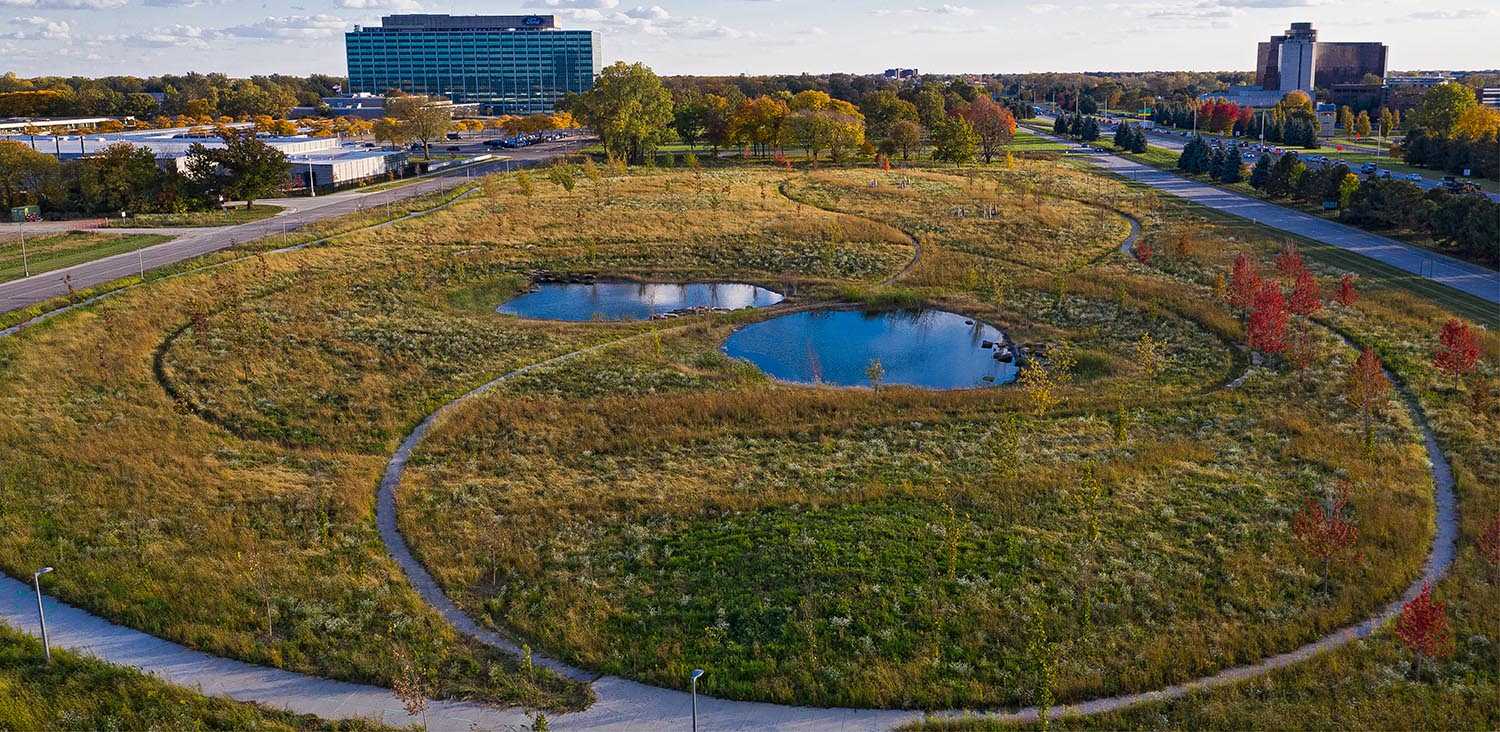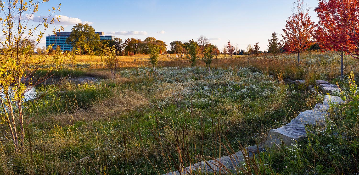 El arboreto de Arjay Miller (Dearborn, Michigan) es una parcela en la que el equipo de OJB sustituyó una gran superficie cubierta de césped por una pradera compuesta de flora silvestre. El proyecto partía de la contradicción que siempre se encuentra en este tipo de acciones. ¿Merece la pena reducir los usos de un parque para aumentar la diversidad? Los paisajistas apuestan por este intercambio de protagonismos, donde la actividad de las personas se restringe a los caminos que lo atraviesan. En esta situación, el nuevo paraje ofrece una imagen heterogénea a lo largo de las estaciones, con un mantenimiento menor y una capacidad de adaptación más avanzada.