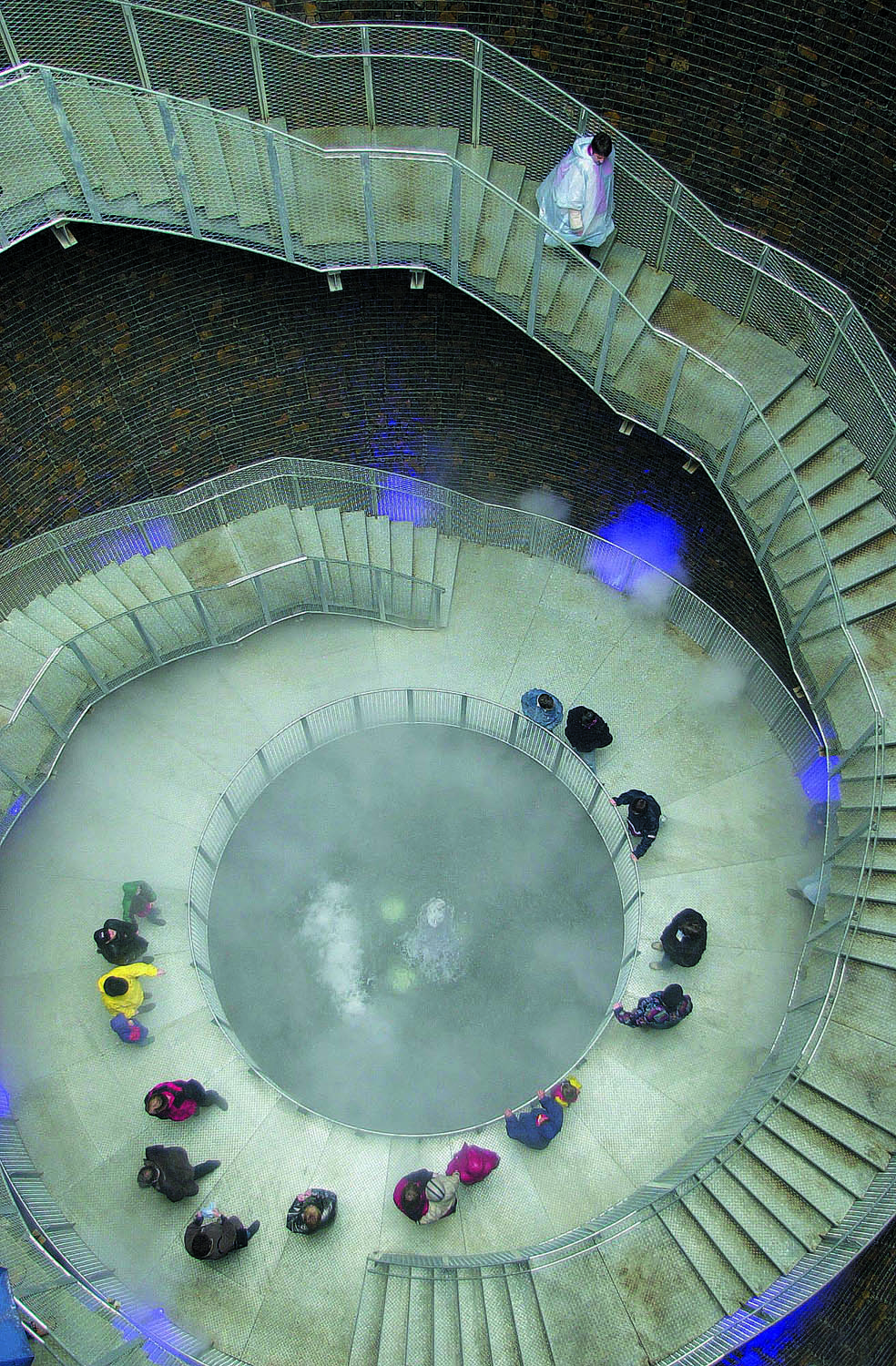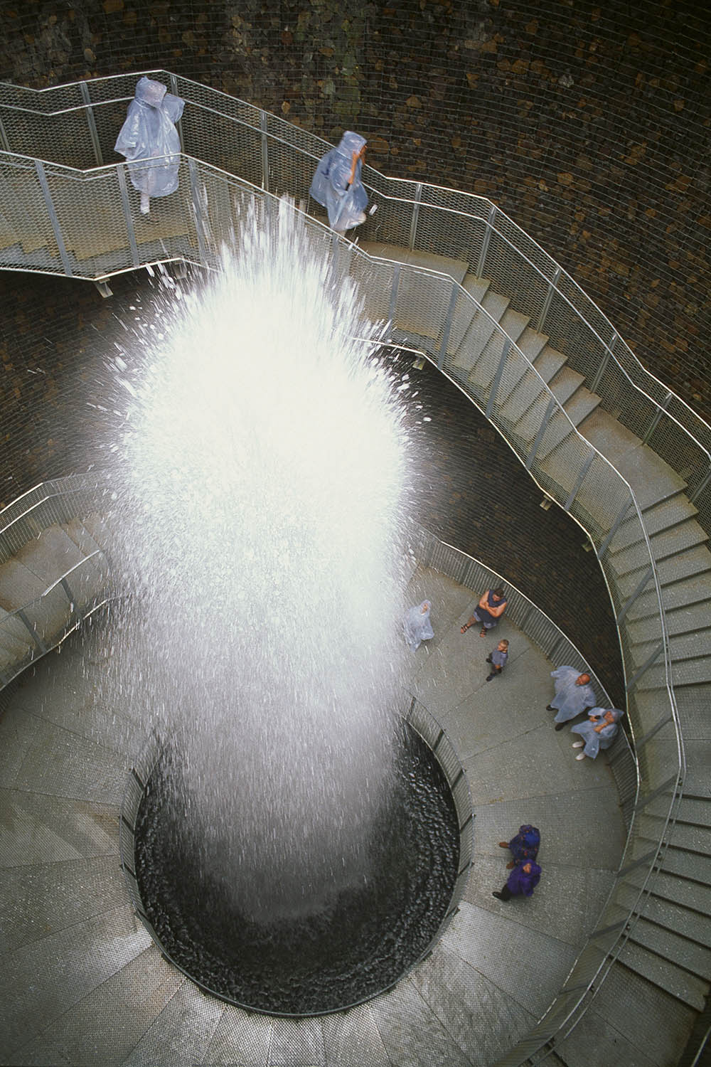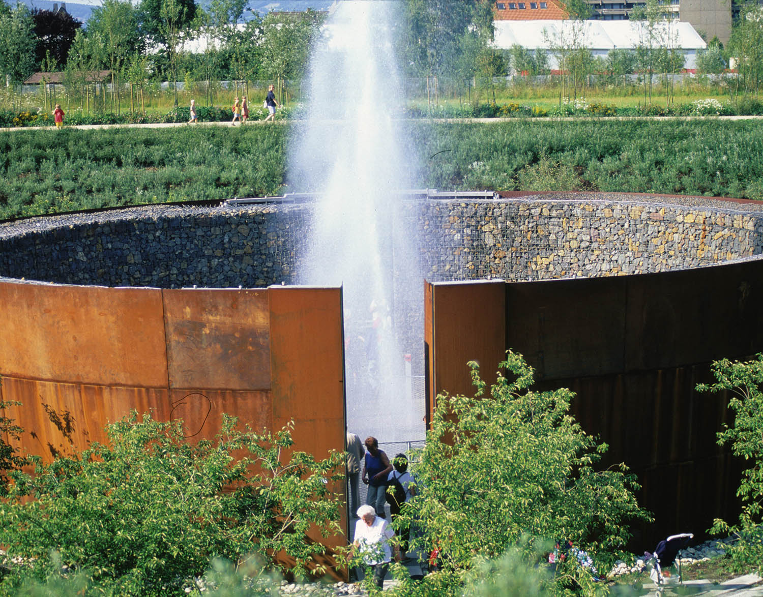 En el centro de un lugar aterrazado se excavó un agujero que llegaba hasta el nivel freático. Este hueco se aprovechó para introducir una fuente, oculta por una estructura metálica de varios metros de altura, donde el agua se convertía en protagonista: un gran chorro la impulsaba por encima del suelo y la hacía visible a lo largo del recorrido de bajada al gran cráter. Por medio de una intervención cercana al land art, el estudio alemán habla del viaje invisible del agua y de la relación entre suelo, clima y paisaje. El itinerario de ese enorme caudal pone de manifiesto la enorme utilidad del proceso de filtrado de estos parajes para gestionar grandes riadas. ¿Es compatible esta función con un contexto urbano?