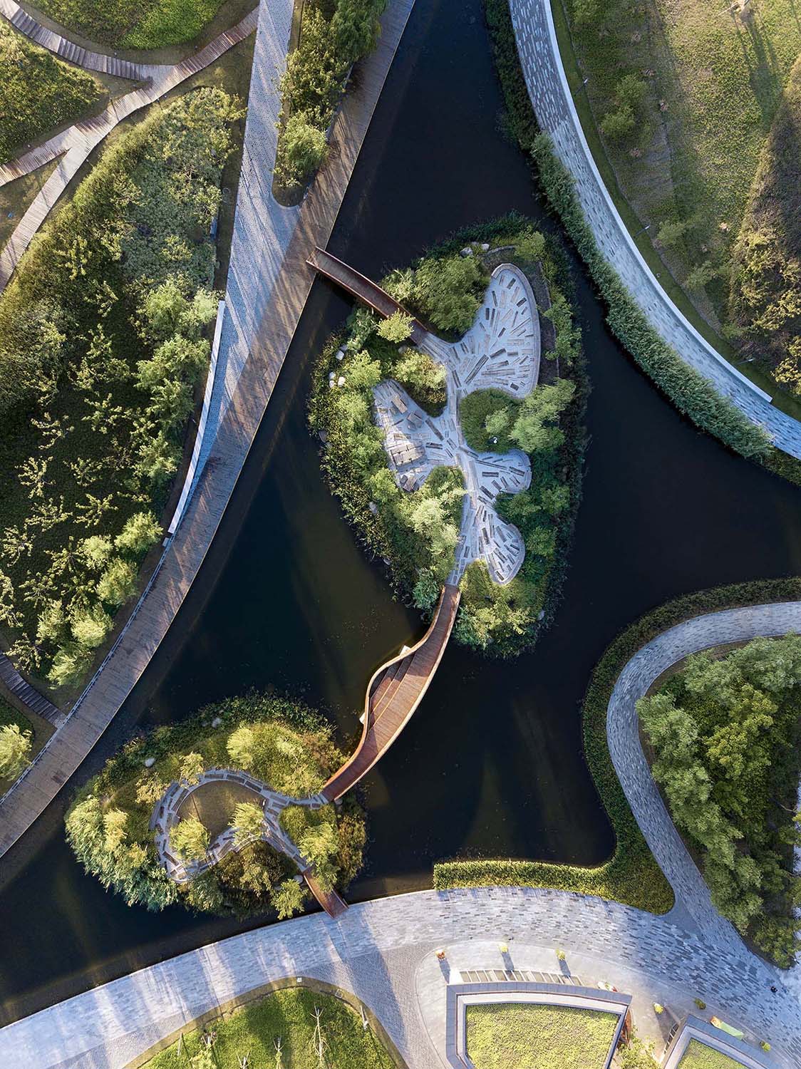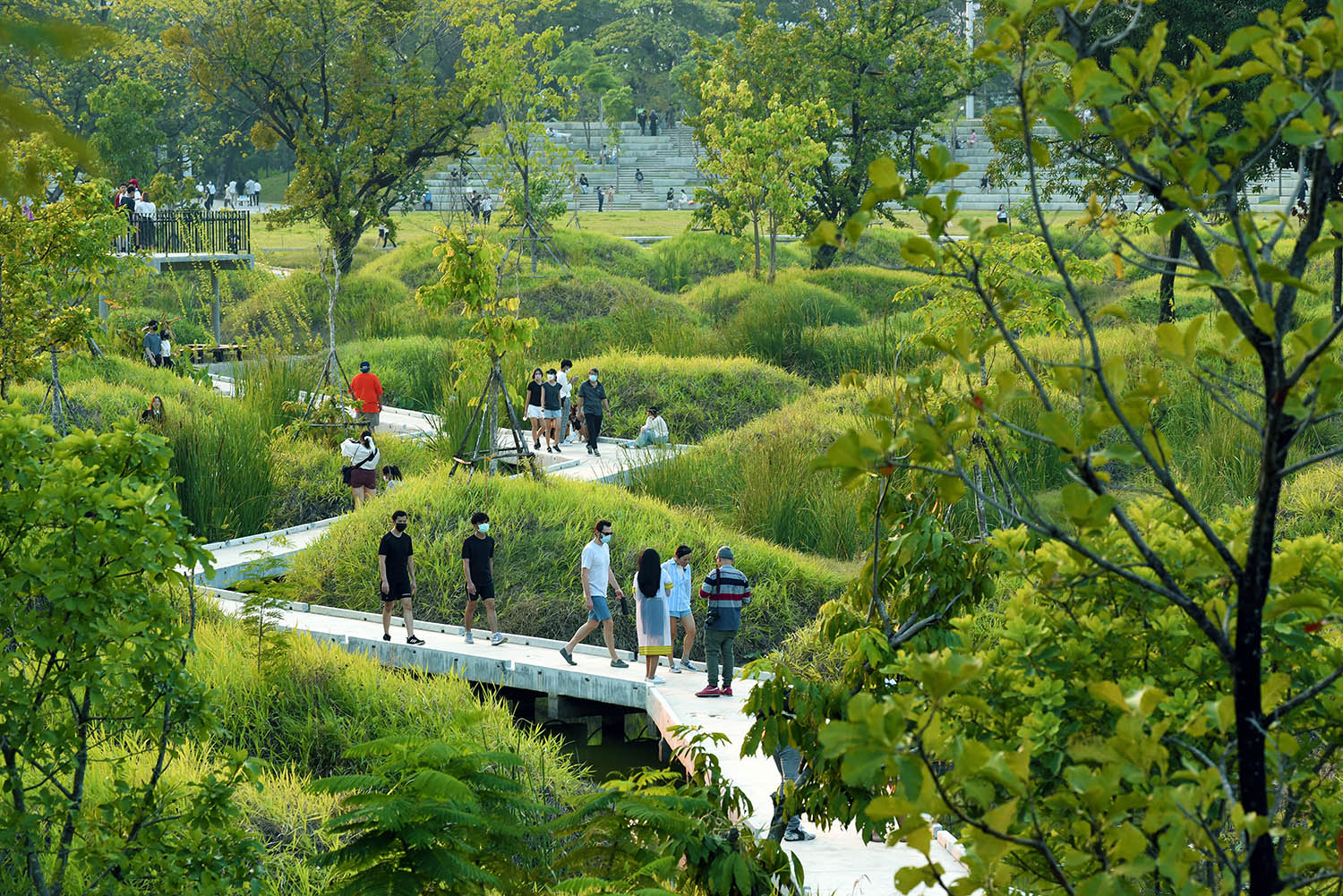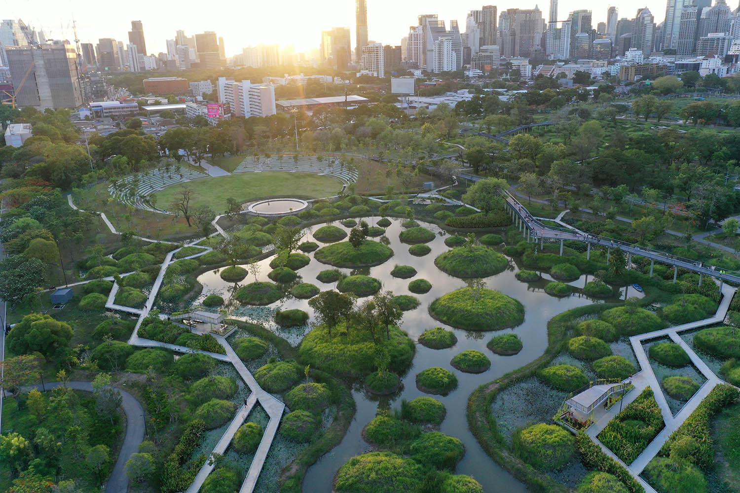 Tanto Benjakitti Forest Park (Turenscape) en Tailandia como Taopu Central Park (Field Operations) en China convierten grandes extensiones industriales en una laguna donde desviar, retener y laminar el agua para minimizar los daños de una gran escorrentía. Ambas intervenciones adoptan una estrategia que deja una escenografía de islas y pasarelas rodeadas de naturaleza más densa, en las que el nivel del agua va configurando sus límites a lo largo del año. Las áreas deportivas e infantiles se intercalan con humedales para aves de distintos tipos, y la ciudad cambia de prioridades en el paréntesis que ocupan estos parques.