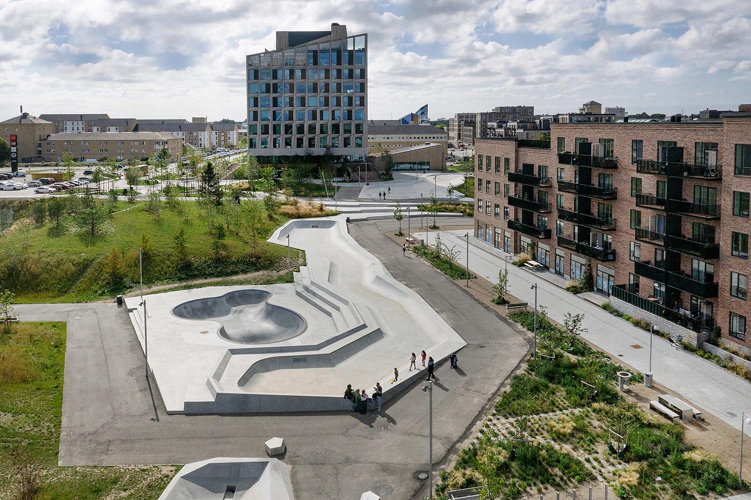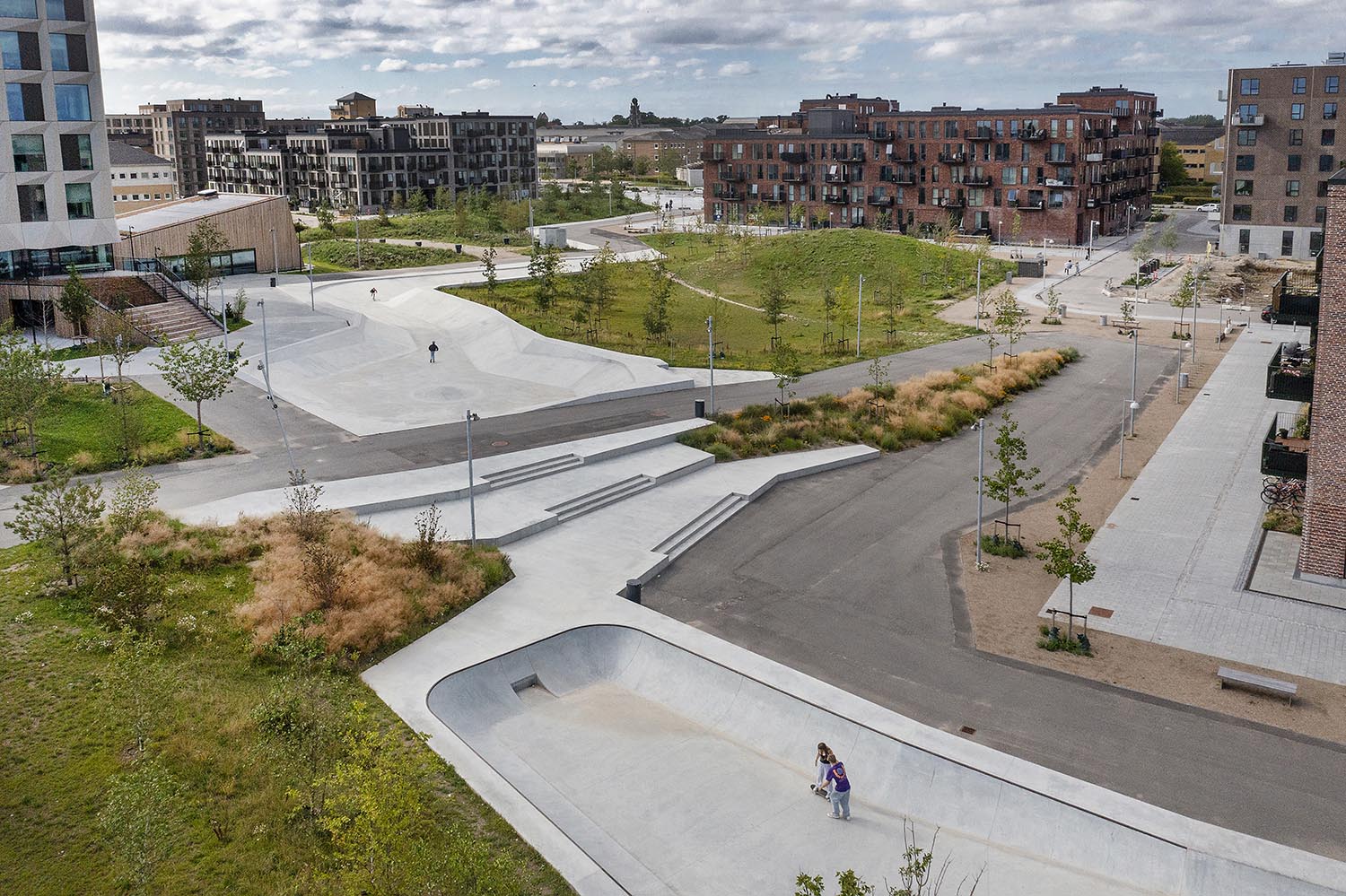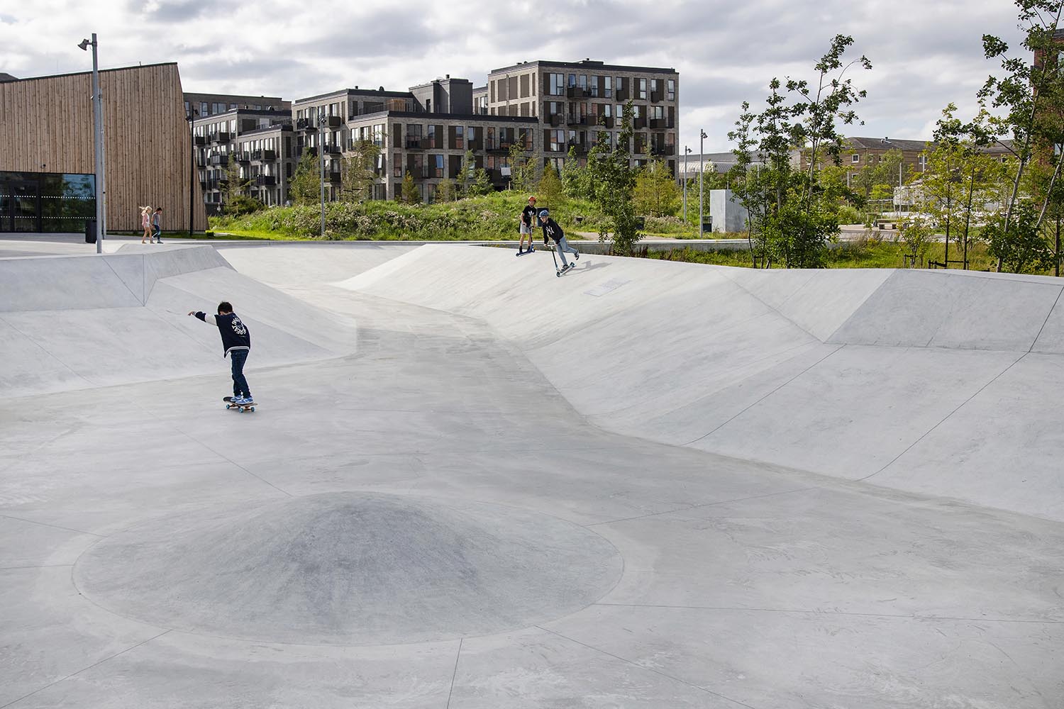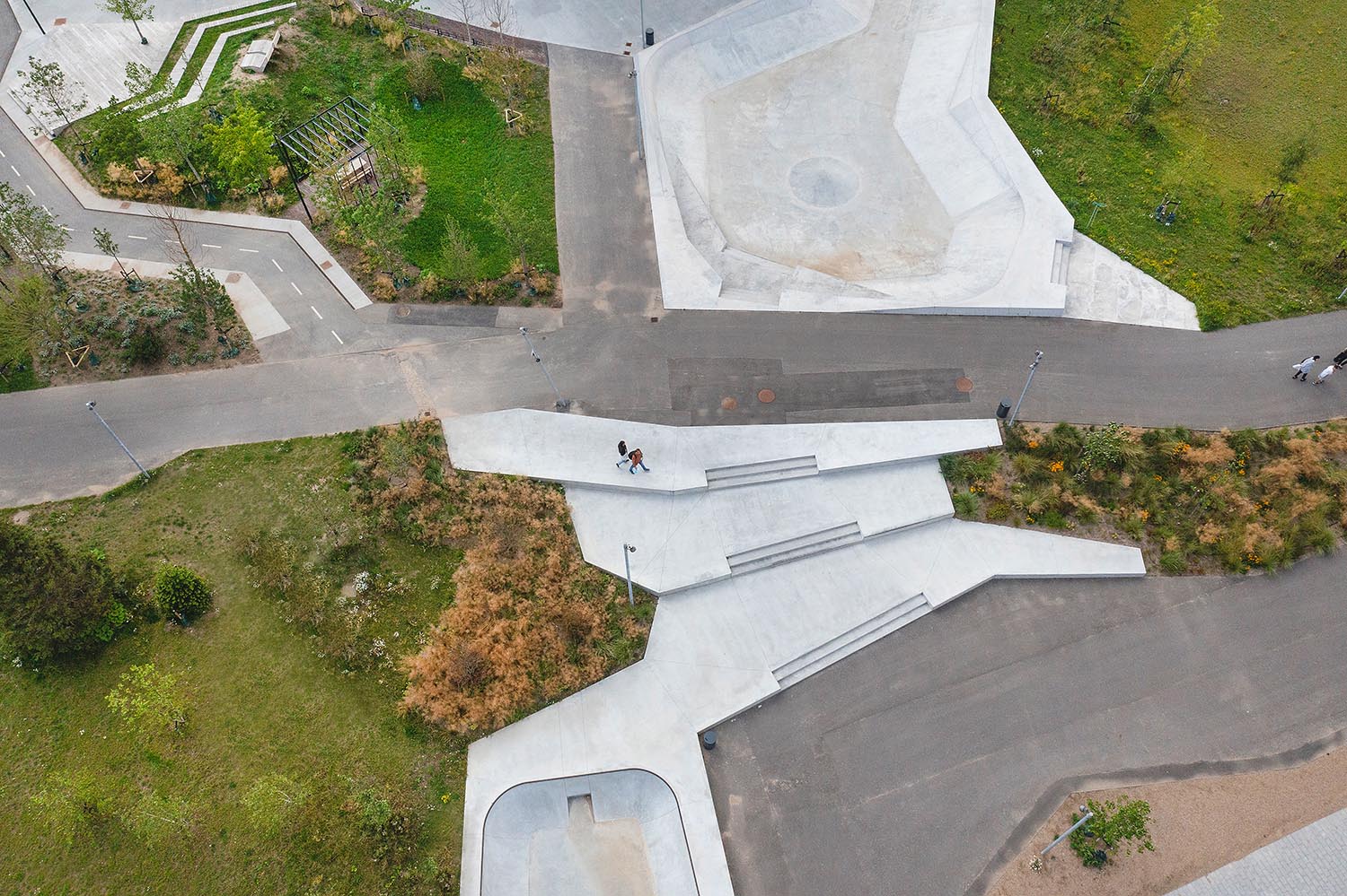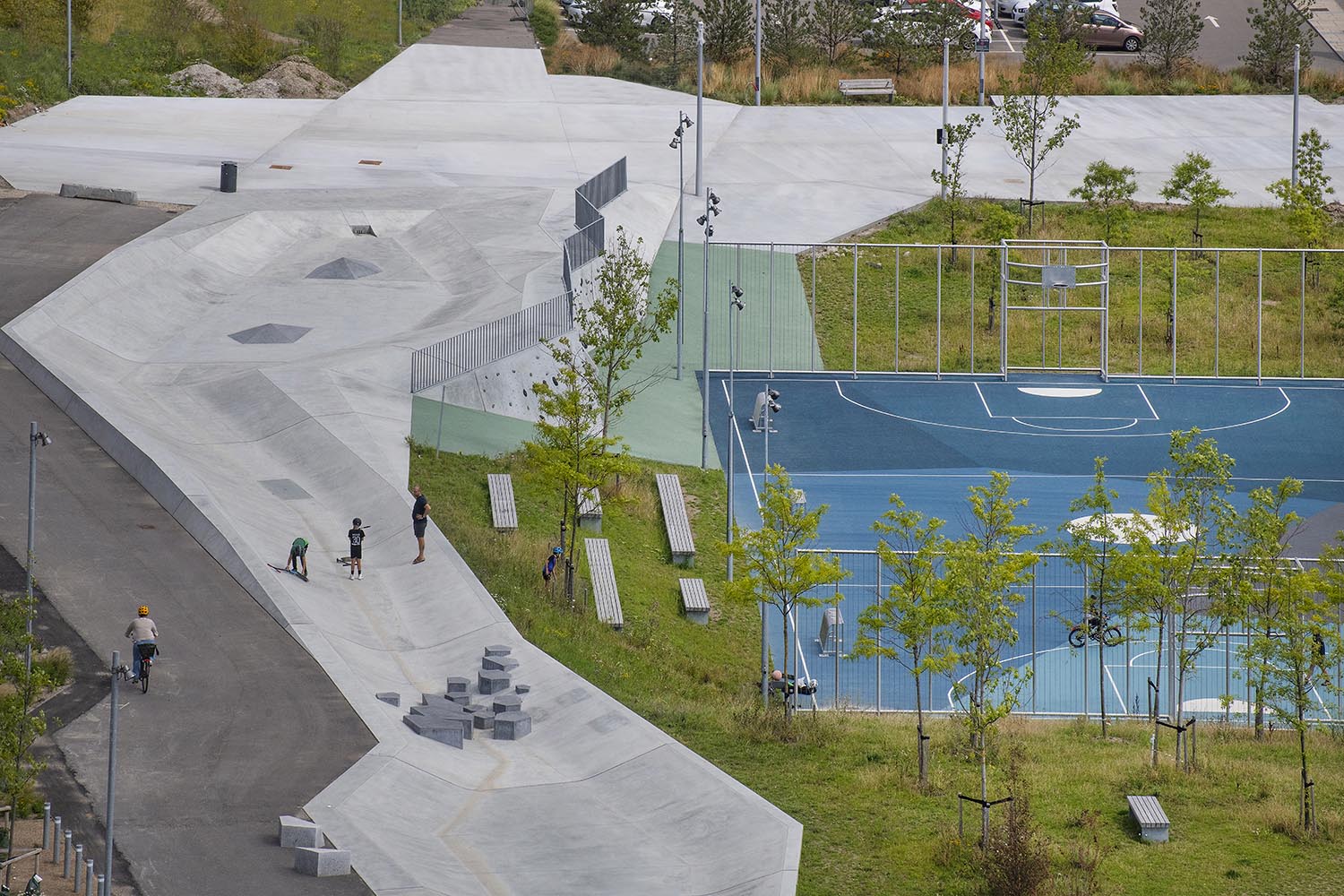 Para resolver la conexión entre la arquitectura y la diferencia de altura del entorno, introdujeron equipamientos deportivos con un skatepark inserto en la pendiente, que fue considerado el más largo del mundo. Las partes más planas albergan las pistas reglamentarias, y las franjas de plantas resuelven las pendientes más inclinadas. La diferente permeabilidad entre el pavimento de hormigón y los taludes vegetales hace que en los días de lluvia la pista de patinaje se convierta en una bañera, que muestra la cantidad de agua que las plantaciones son capaces de absorber.