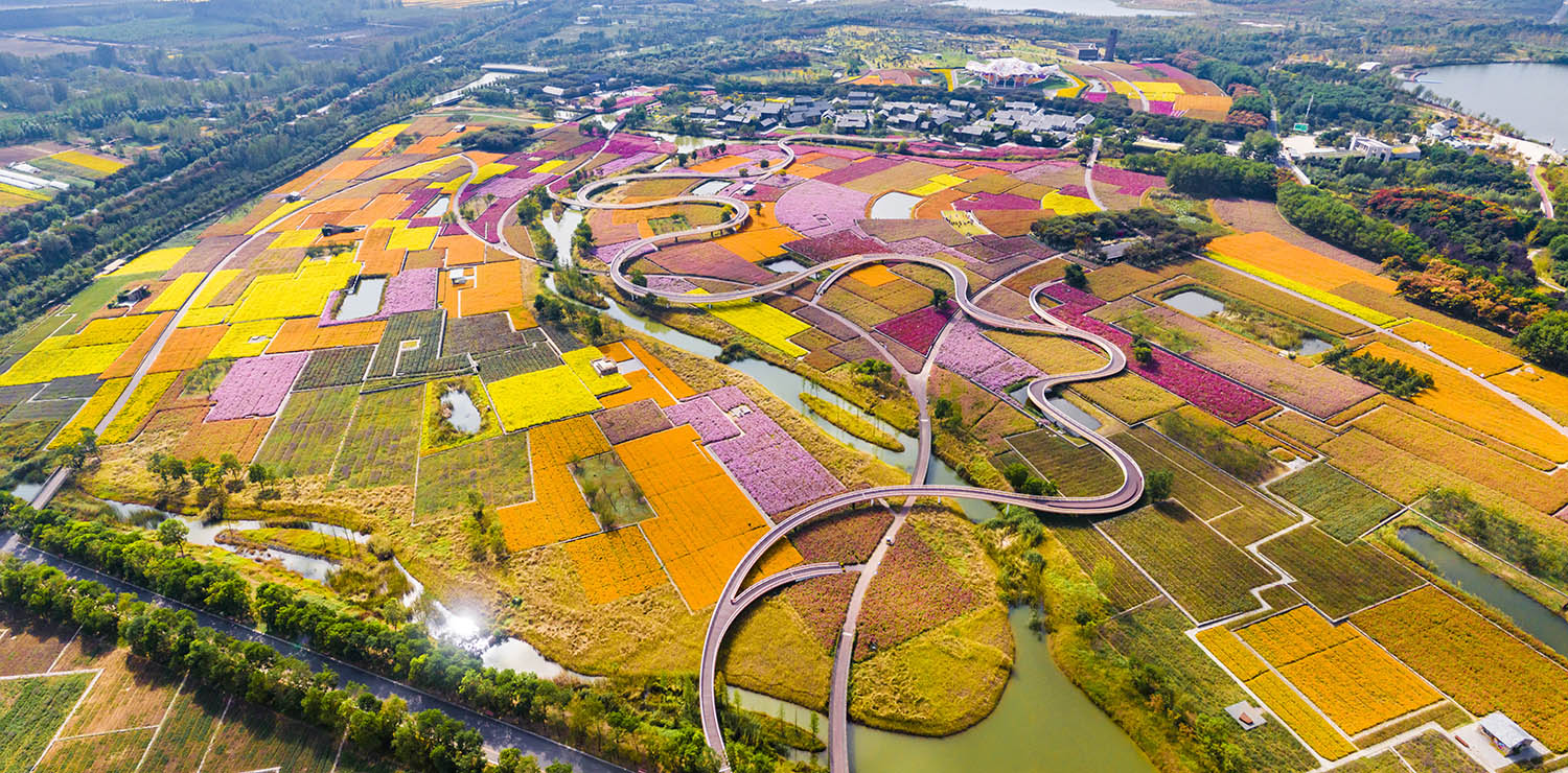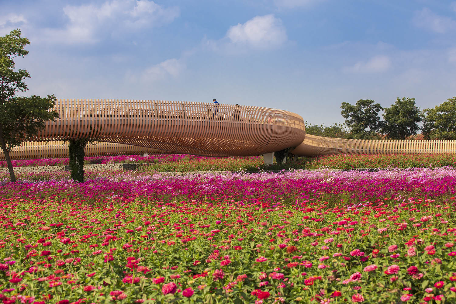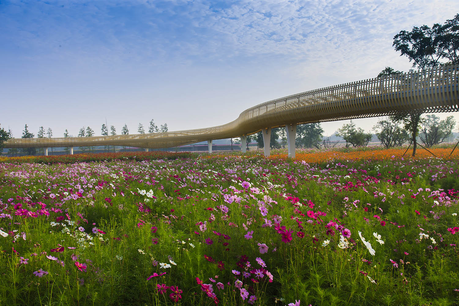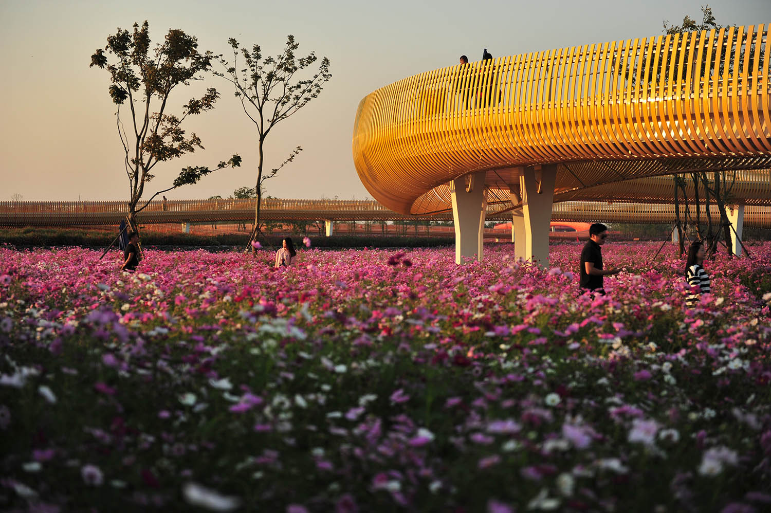 En este punto nos llama la atención el trabajo que Turenscape realizó para Suqian Santaishan Flower Quilt. En el nuevo distrito de Suqian (Jiangsu, China) se potenció una amplia localización verde para generar actividad humana. Los arquitectos idearon una trama de campos de flores en el entorno de un río e incorporaron pequeños pabellones a modo de folies, además de una pasarela para brindar una vista aérea de los colores de las parcelas.