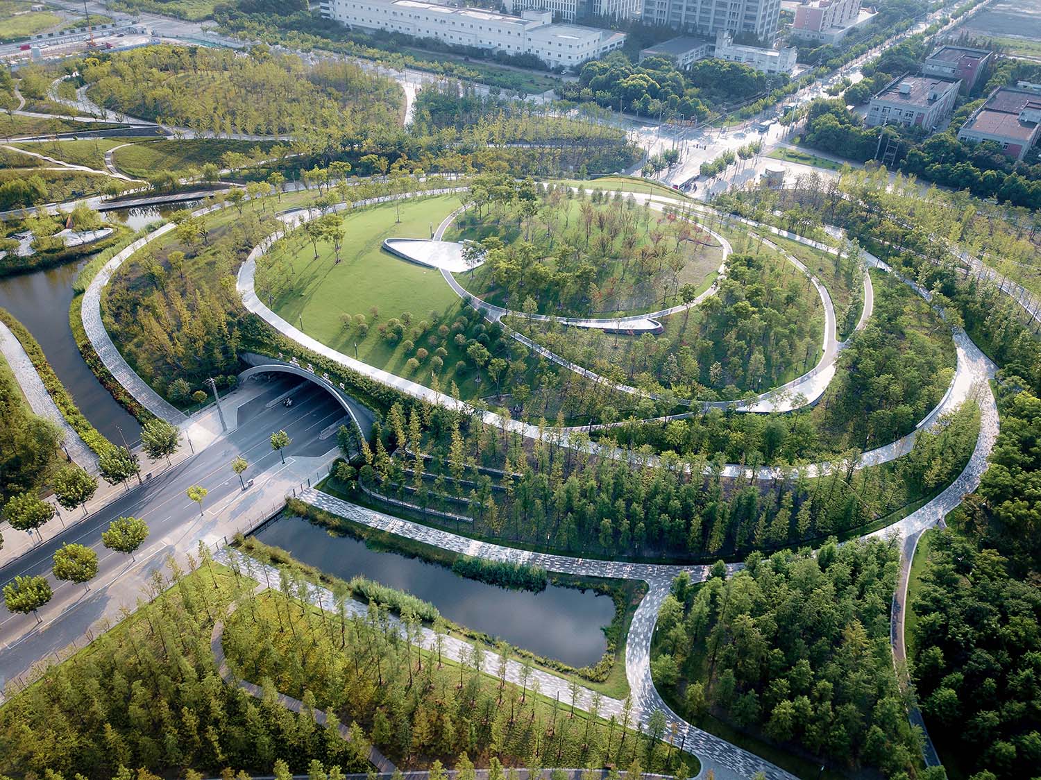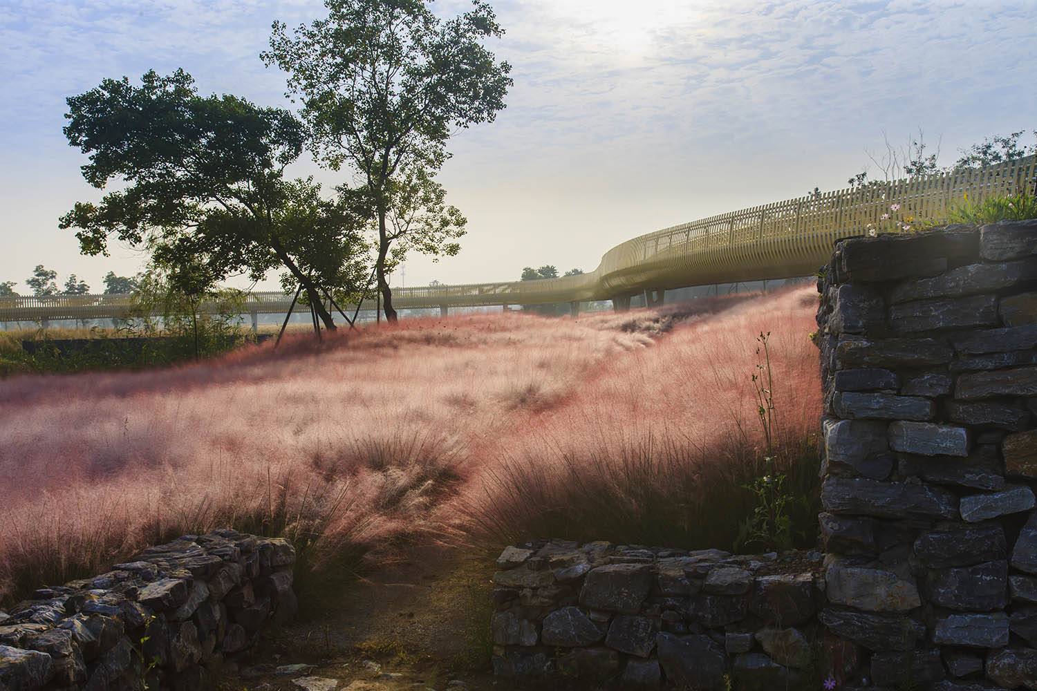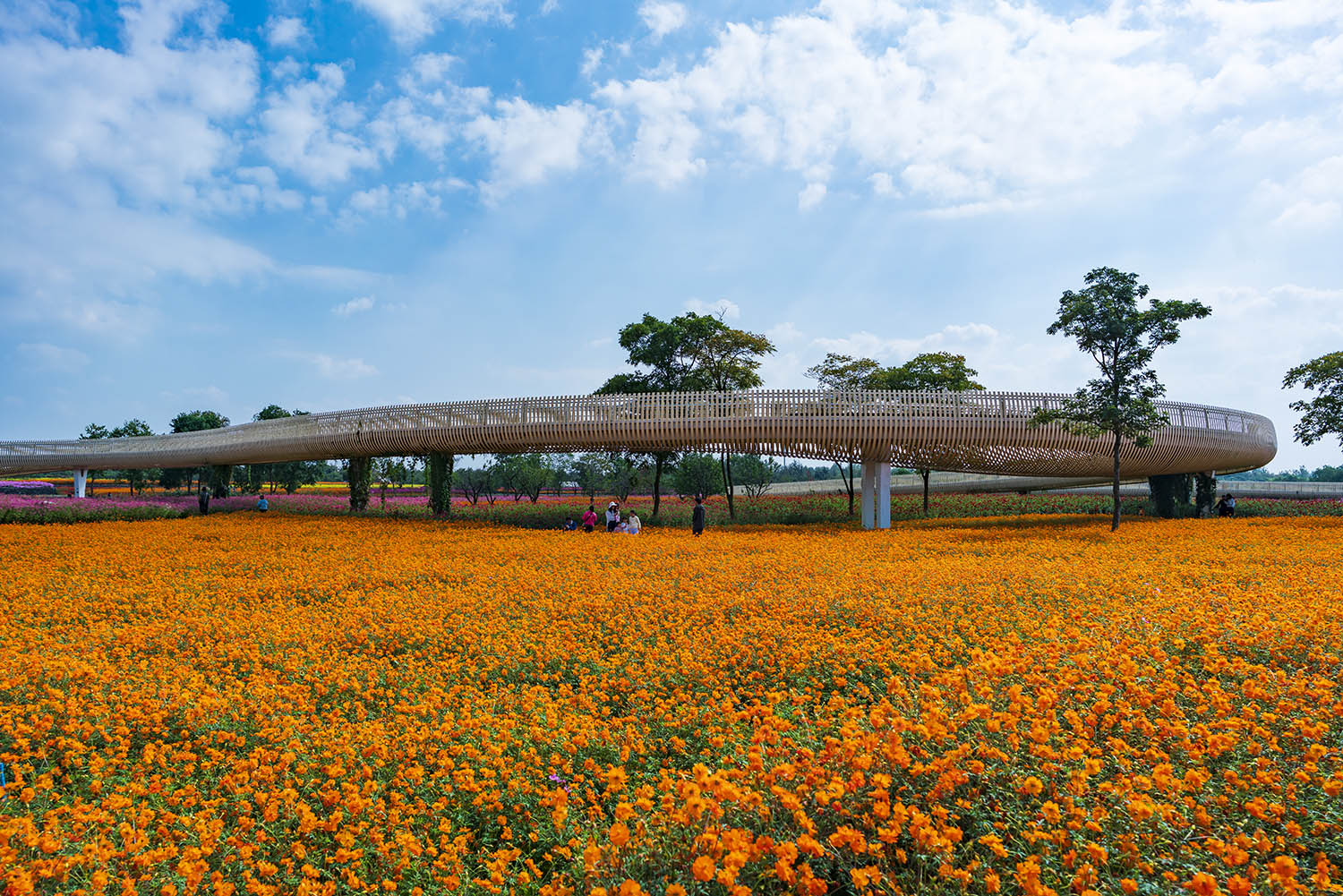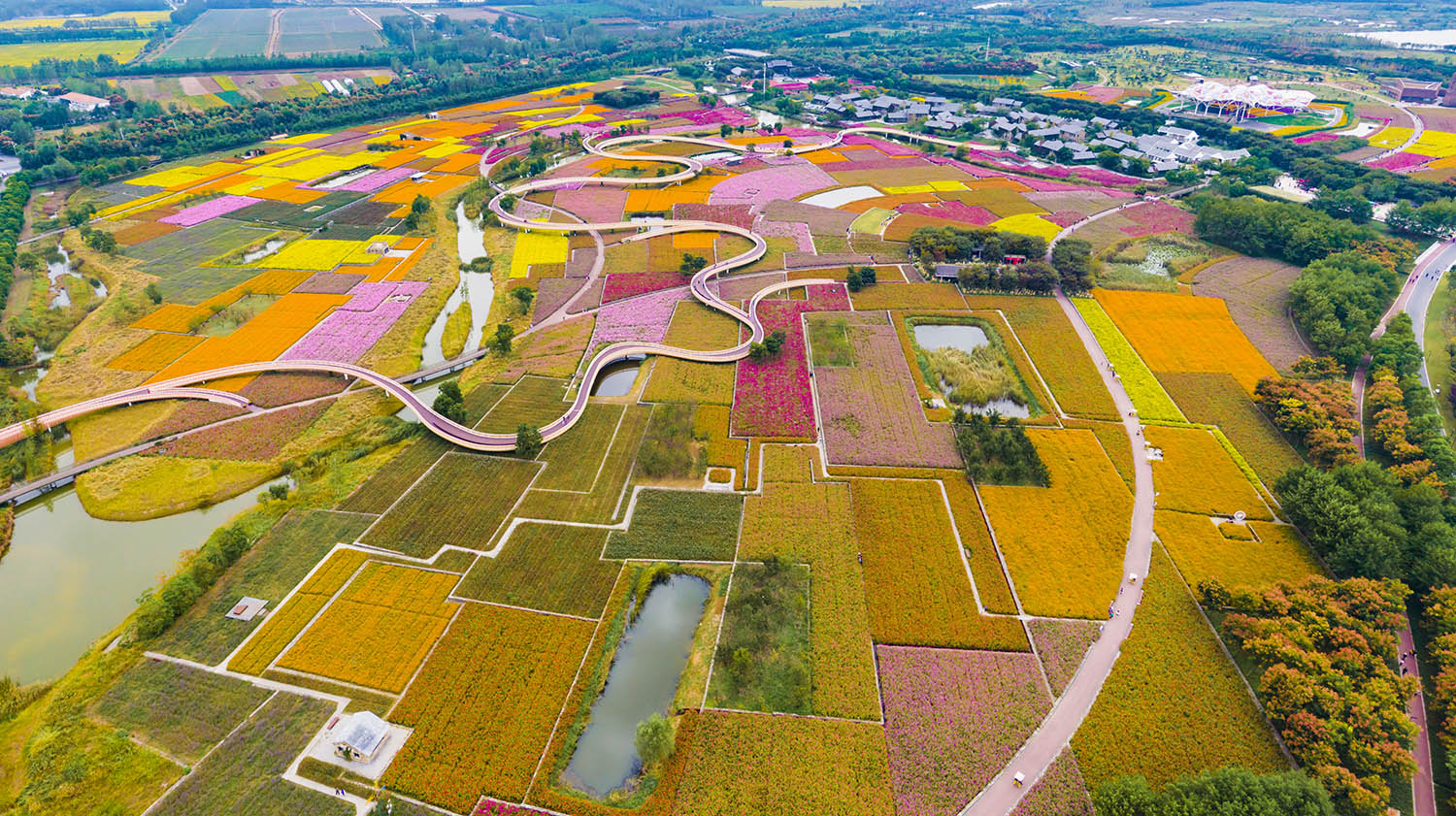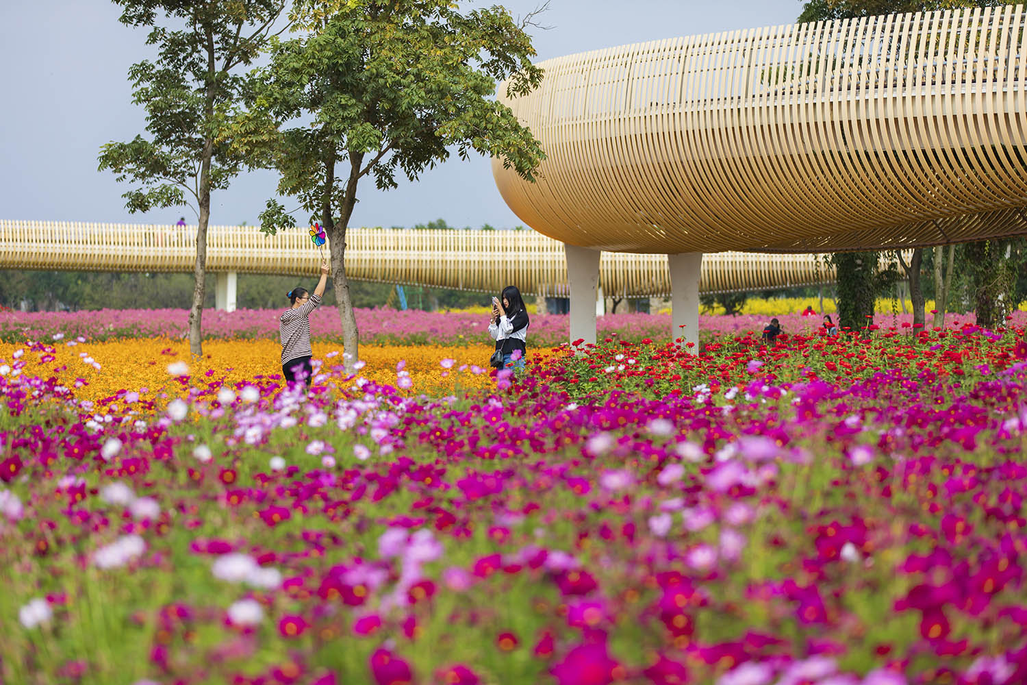 En este punto nos llama la atención el trabajo que Turenscape realizó para Suqian Santaishan Flower Quilt. En el nuevo distrito de Suqian (Jiangsu, China) se potenció una amplia localización verde para generar actividad humana. Los arquitectos idearon una trama de campos de flores en el entorno de un río e incorporaron pequeños pabellones a modo de folies, además de una pasarela para brindar una vista aérea de los colores de las parcelas.