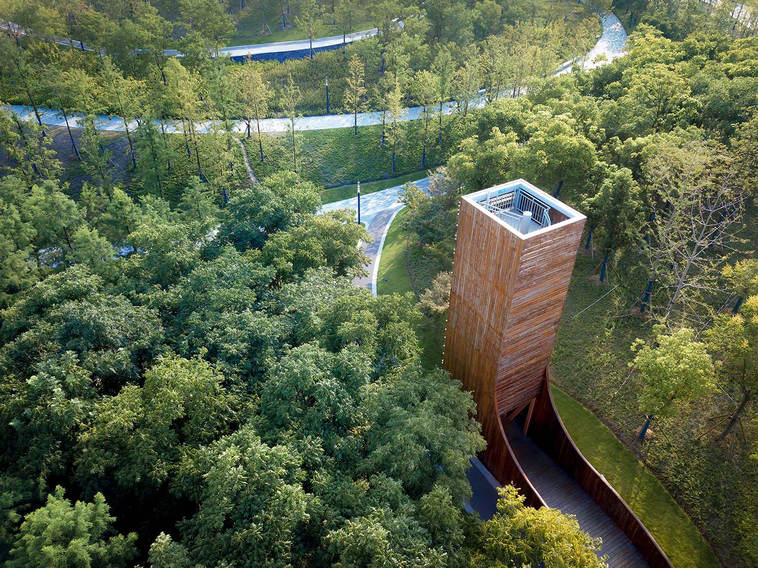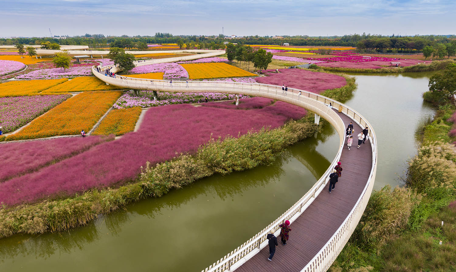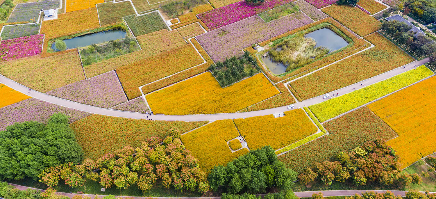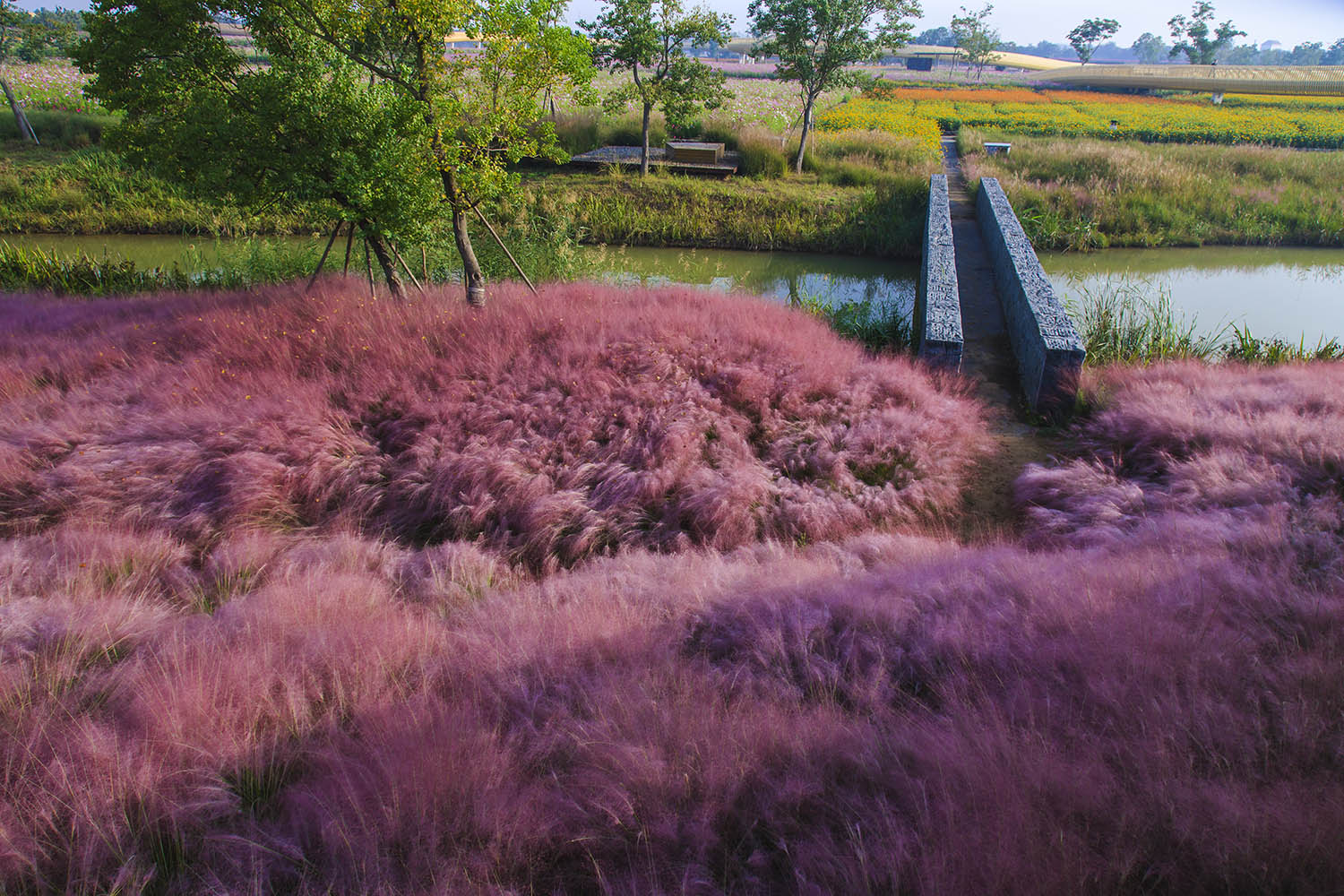 En este punto nos llama la atención el trabajo que Turenscape realizó para Suqian Santaishan Flower Quilt. En el nuevo distrito de Suqian (Jiangsu, China) se potenció una amplia localización verde para generar actividad humana. Los arquitectos idearon una trama de campos de flores en el entorno de un río e incorporaron pequeños pabellones a modo de folies, además de una pasarela para brindar una vista aérea de los colores de las parcelas.
