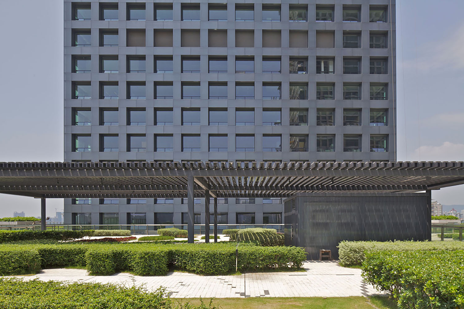 El equipo de Petra Blaisse elaboró un plan que proponía una composición de arbustos en forma de motivos florales medievales, inspirados en las tallas de papel tradicionales chinas. Esta disposición marcó las zonas de circulación y deporte y la colocación de áreas de trabajo en sombra, jugando con la volumetría y las texturas de las plantas. El verde se entendió como un recurso arquitectónico más, colonizando el zócalo de la propuesta de Koolhaas. Y aunque el proyecto se completó con un pequeño parque en la planta baja, zonas verdes integradas en las elegantes plazas de entrada, y una serie de patios-jardín y jardines verticales distribuidos por toda la torre, el patrón dibujado en el voladizo anunciaba el protagonismo de la naturaleza como elemento más imponente.