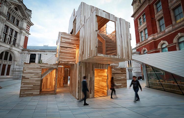 El patio Sackler del Museo Victoria & Albert de Londres alojó el proyecto entre el 15 de Septiembre y el 18 de Octubre, lugar que enmarcó al proyecto como uno de los más emblemáticos del Festival del Diseño de Londres, así como también fomentó la popularización de disyuntivas a lo ya conocido, a lo que se entiende por habitual. Quizá deberíamos sacar de una vez por todas de nuestro imaginario inconsciente la certeza de que madera es sinónimo de mueble o bungalow.