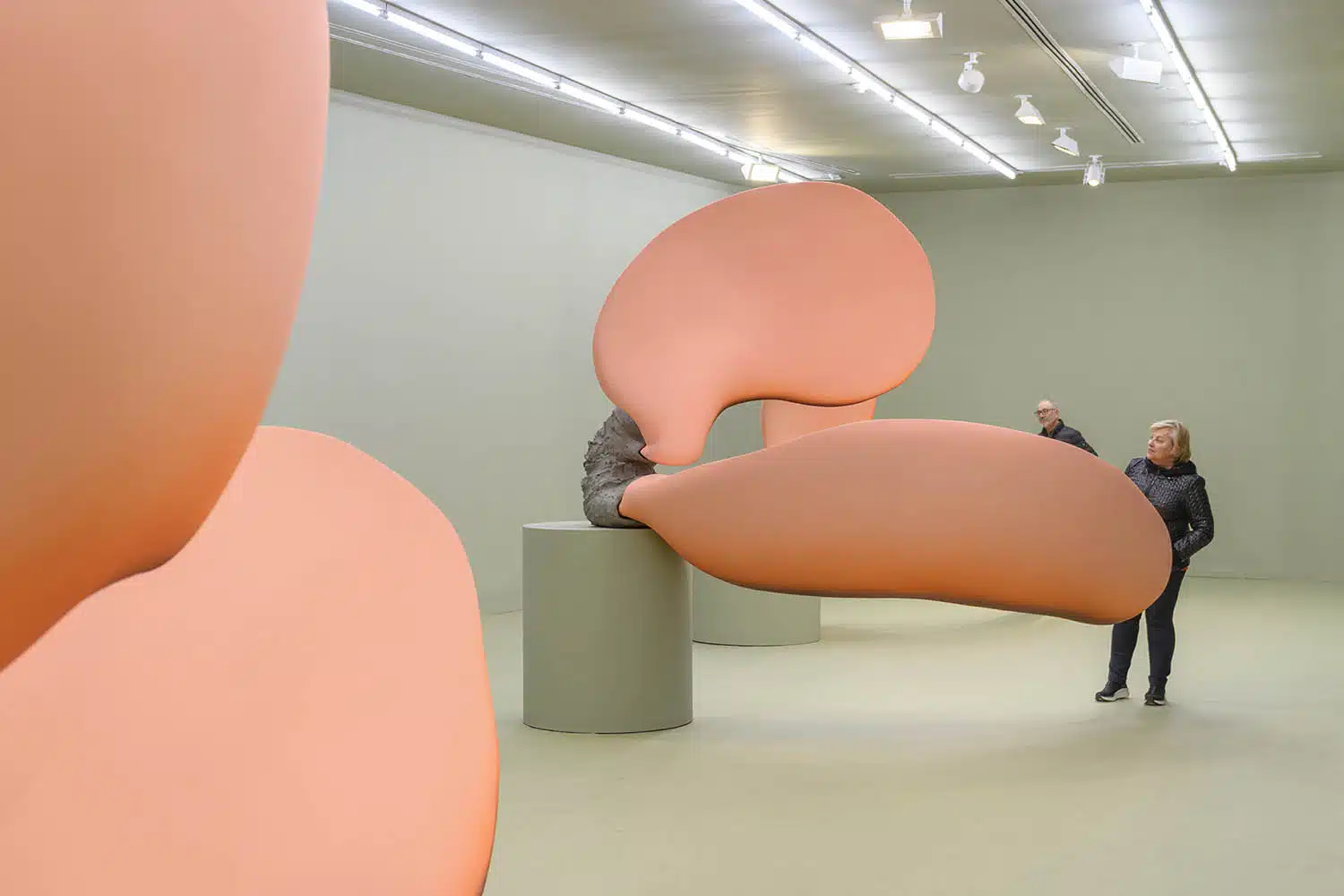 Con una moqueta de color verde grisáceo que recubre toda la pared, el primer nivel nos enseña lo que a la artista le gusta denominar el espacio uterino: un lugar habitado por los seres del “estadio sexual indiferenciado” en una versión actualizada de sus archiconocidas “tuneladoras”. Estos entes híbridos entre orgánicos y no orgánicos, humanos y no humanos —con su base de arcilla y apéndices de superficies pulidas de color anaranjado— nos conducen hacia un paseo por el subsuelo de la urbe y, al mismo tiempo, por el interior del cuerpo de cada uno de nosotros.