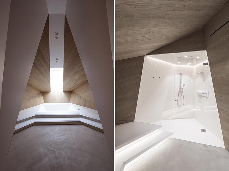 Una escalera de hormigón nos recibe al entrar. Eje comunicacional y escultórico de la rehabilitación, ayuda a conectar las diferentes estancias concebidas como volúmenes completamente independientes. Sin duda, es éste el elemento más importante junto a la espectacular manera de preservar la luz en todo el conjunto con ventanas en el techo. En la planta de arriba dos dormitorios, baño y zona de relax aparecen como extensiones de la propia escalera. Elegancia y sinuosidad se dibujan en cada peldaño. No es algo que pase desapercibido. “Subir por ella no se vive como una conexión vertical y funcional, sino como una experiencia eléctrica”, nos dicen sus autores.