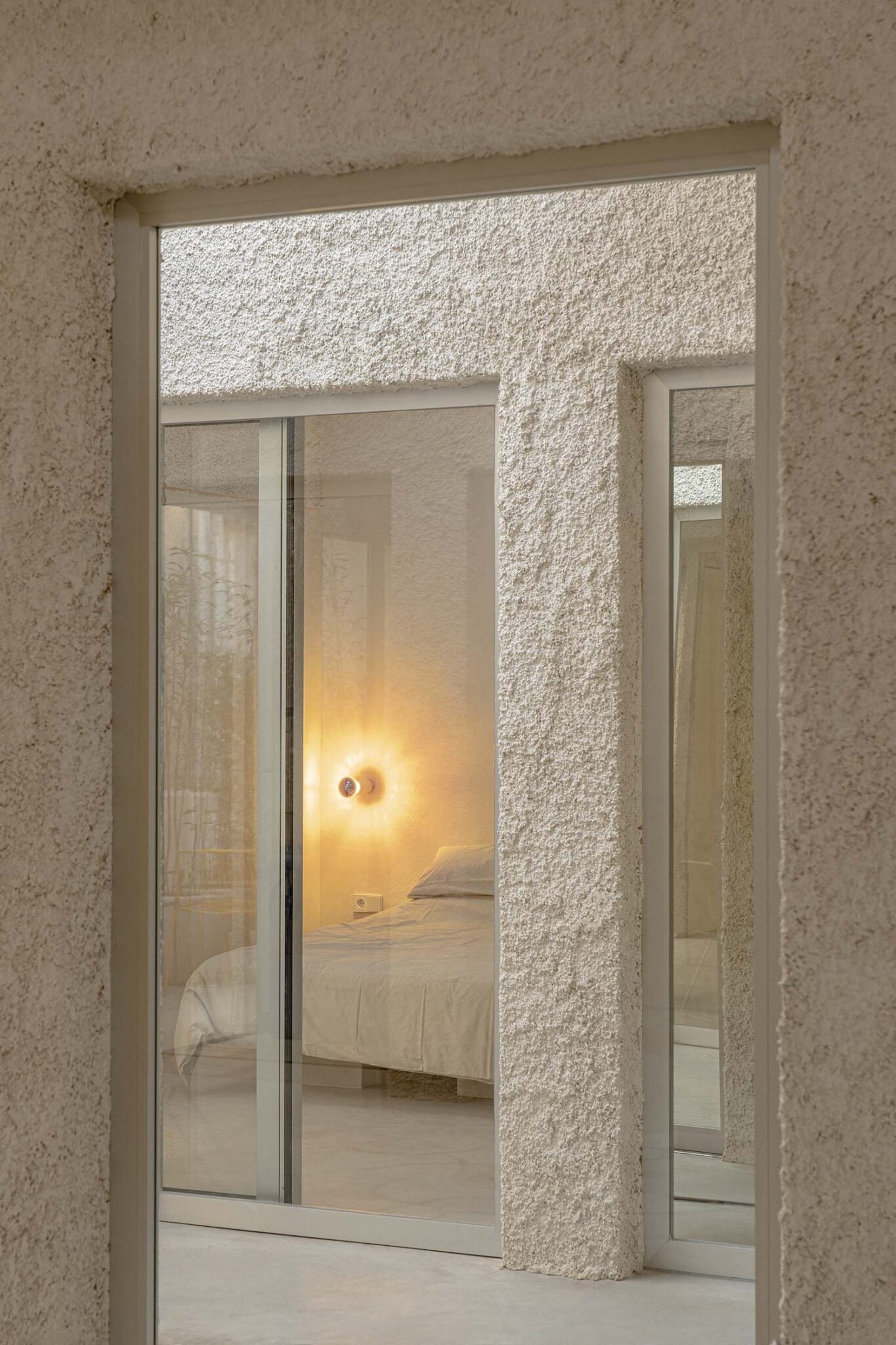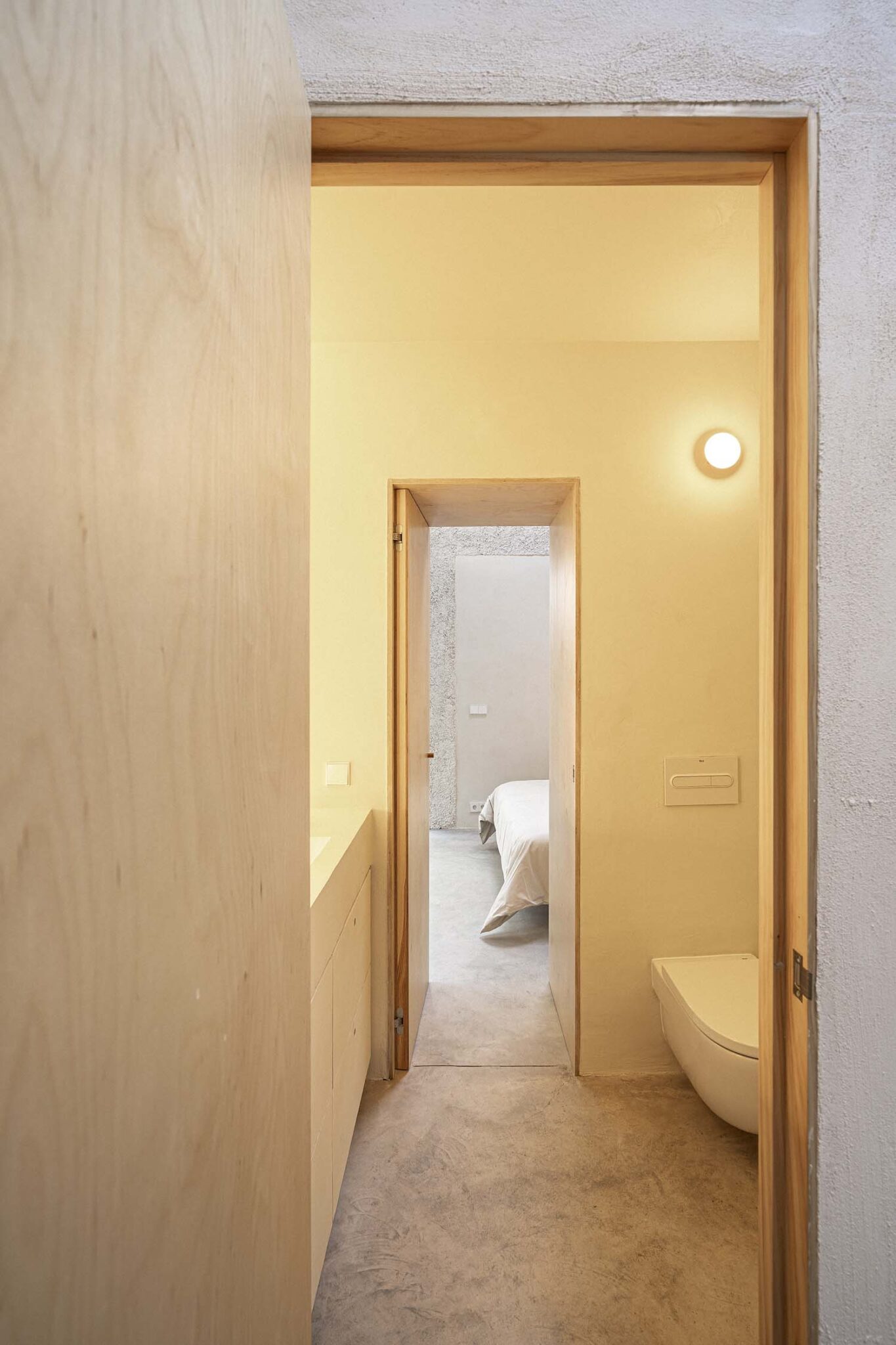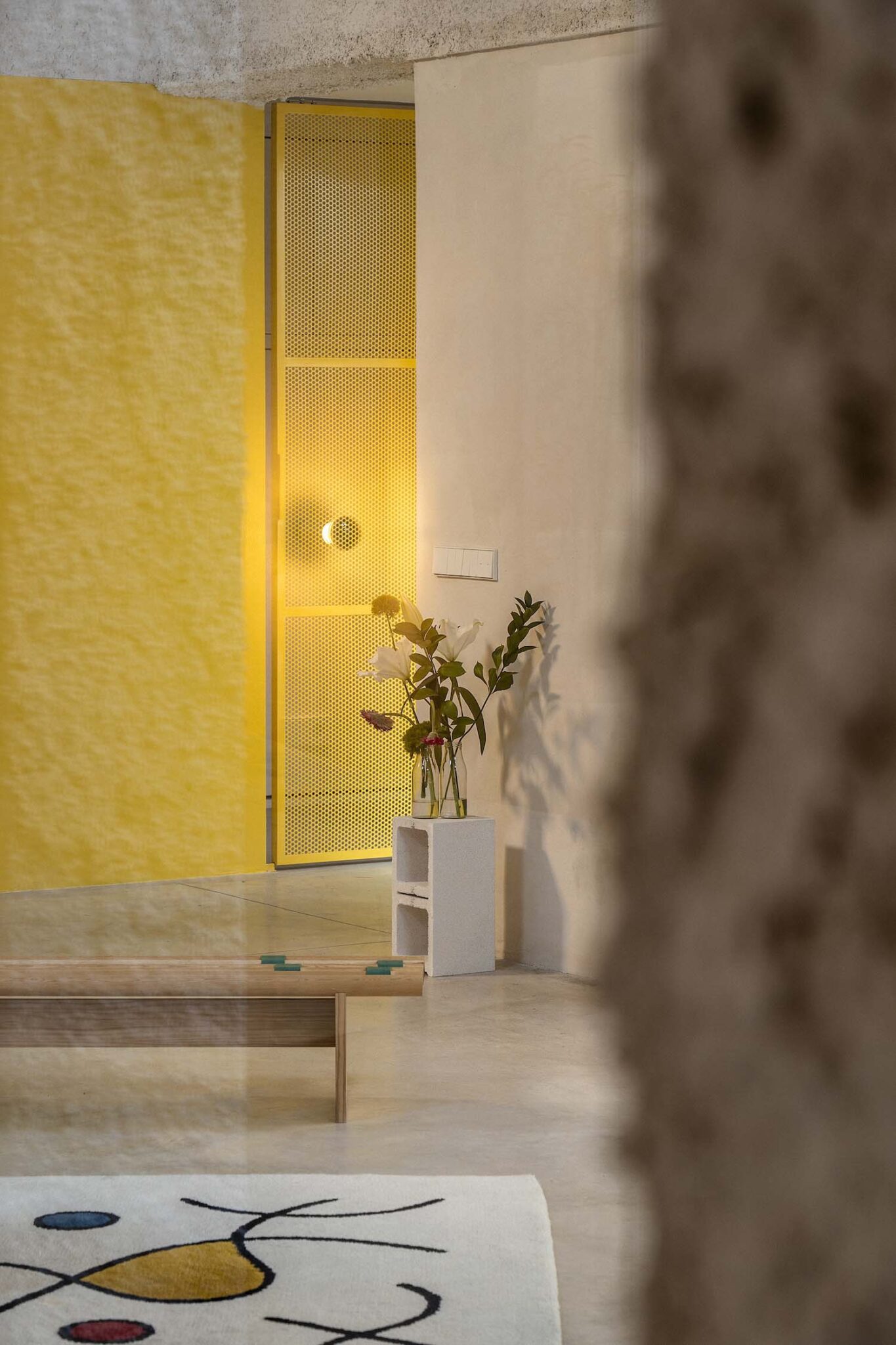 Una intervención de este tipo no puede tener un resultado convencional. Suelen ser lugares que necesitan un uso híbrido para ser coherentes, y a menudo conviven en ellos zonas domésticas y de trabajo. En el caso concreto de este antiguo almacén, los arquitectos descompusieron su fachada en un muro que se pliega sobre sí mismo. Con este recurso conseguían ordenar el interior y generar un porche que daba sentido a la parte del patio que quedaba sin ocupar. Un gesto que únicamente diferencia las estancias por el nivel de privacidad: los dos dormitorios en los extremos de la planta y el resto de las actividades —conversar, comer, cocinar o trabajar— dentro de un mismo recinto.