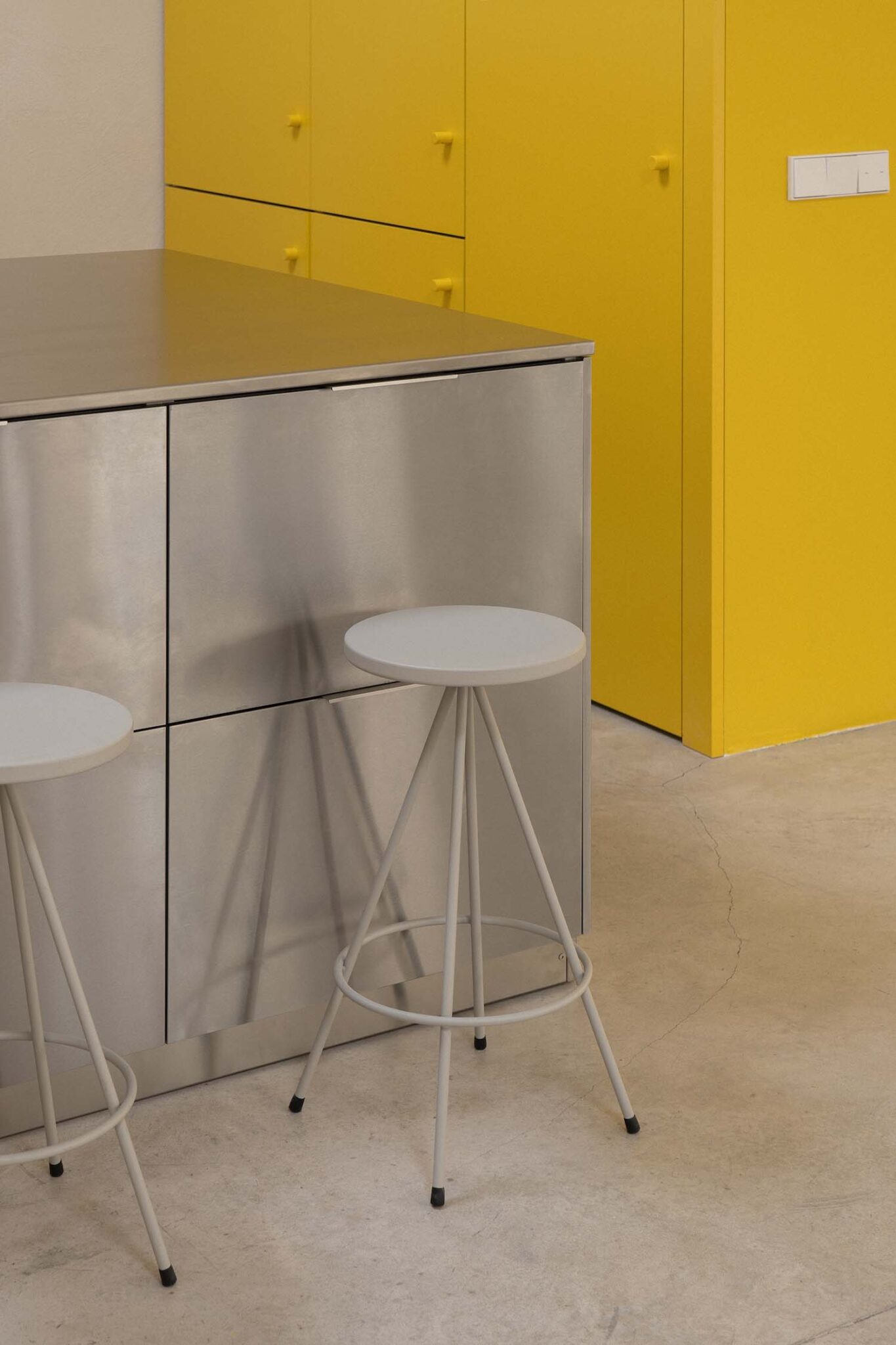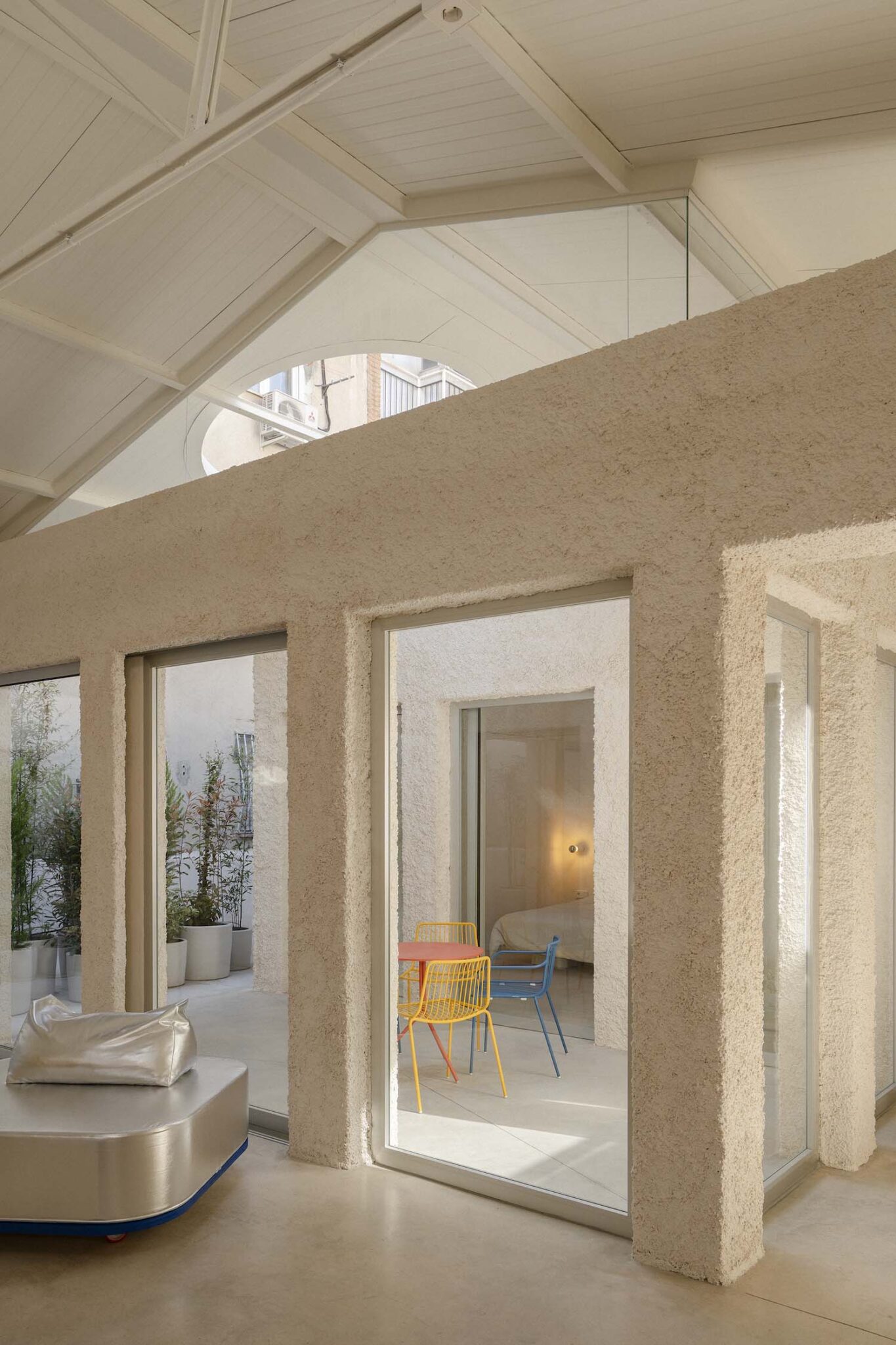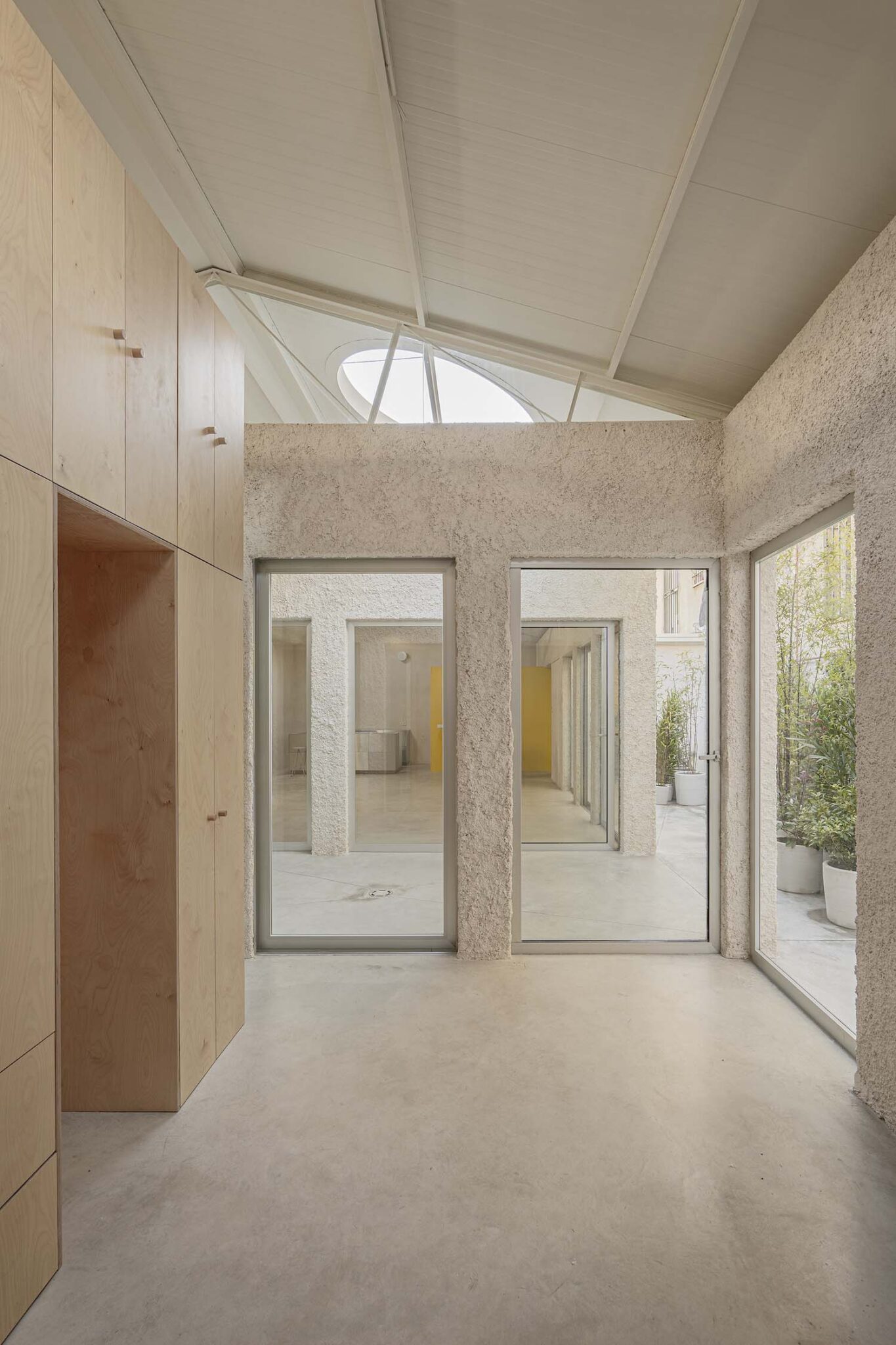 Patio forma parte de Elements for Industrial Recovery, una línea de investigación con la que el estudio madrileño BURR se dedica a explorar las posibilidades espaciales que han ido dejando estas construcciones testimoniales. Edificios que rellenan huecos irregulares, con dimensiones pensadas para otras funciones y con deficiencias de aislamiento e insonorización. Son patrimonio indultado de una demolición anunciada y reconvertido a la nueva personalidad del distrito.