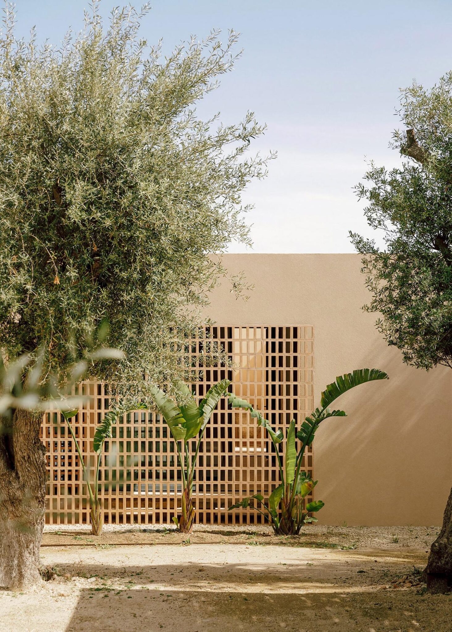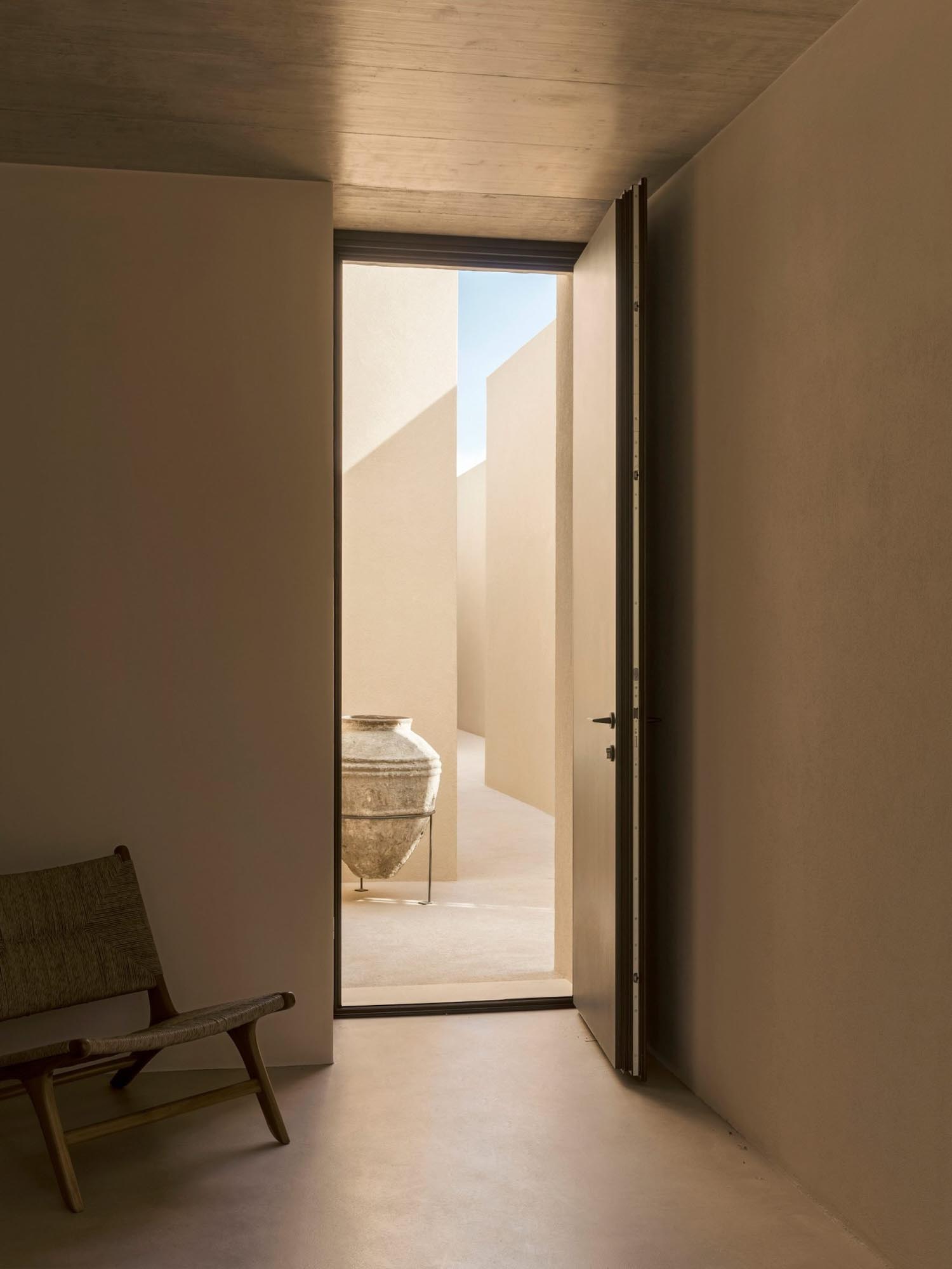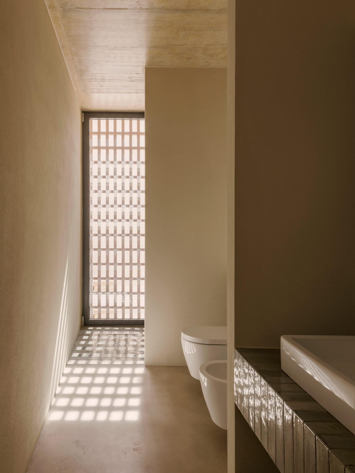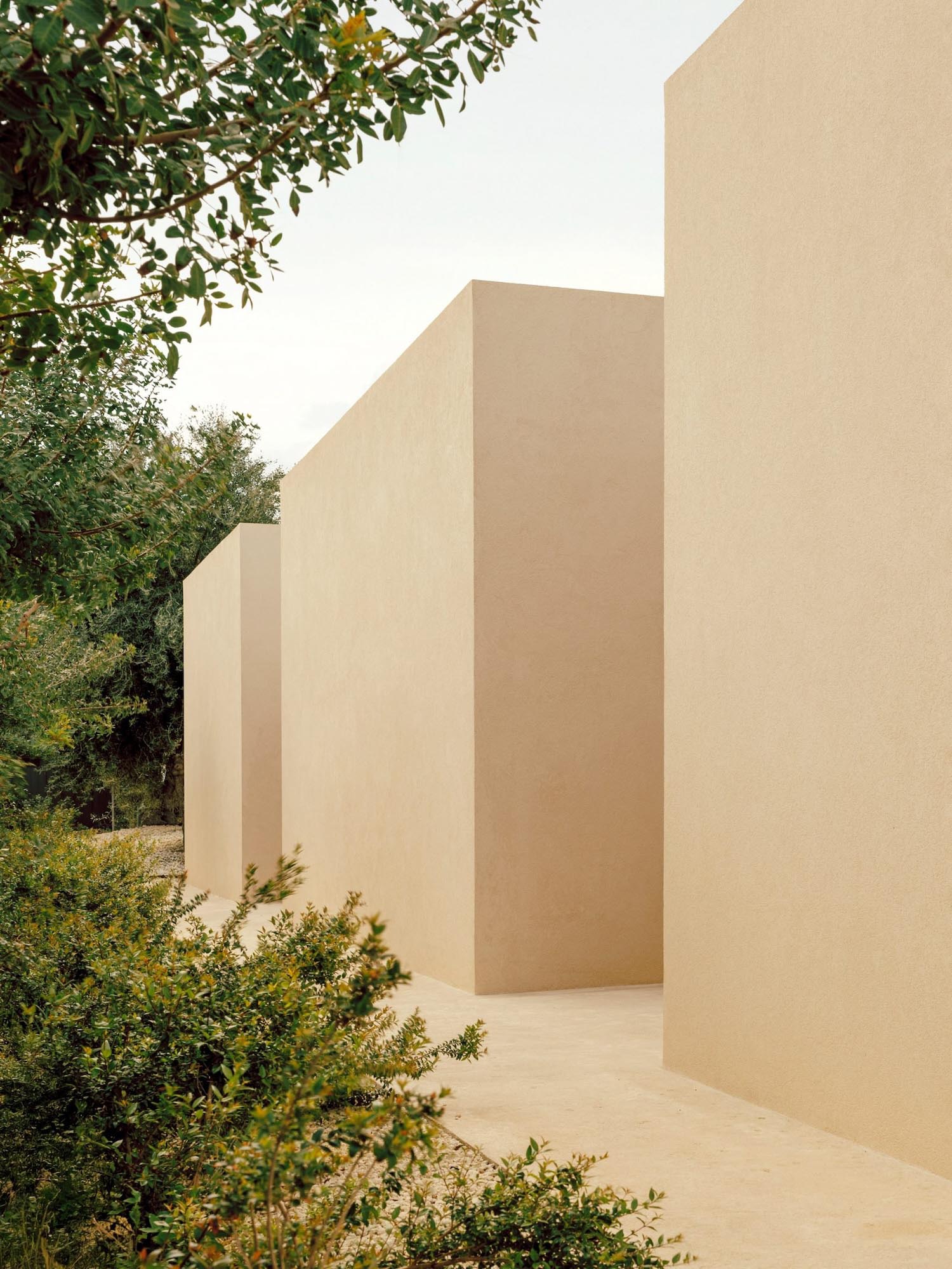 Este recorrido laberíntico se ha generado mediante la división de las dependencias de la residencia en bloques cúbicos individuales, cuya disposición permite crear pequeños patios abiertos íntimos —de discreta escala— que atenúan también la potencia de la luz solar. Con respetuosa delicadeza, Solum renueva la tradición de la arquitectura mediterránea. Lo observamos en elementos que remiten a ella, como la tonalidad clara y terrosa que armoniza con el cromatismo del suelo natural; o la presencia de detalles como celosías, destinadas a matizar la intimidad sin obturar el paso de iluminación y aire.