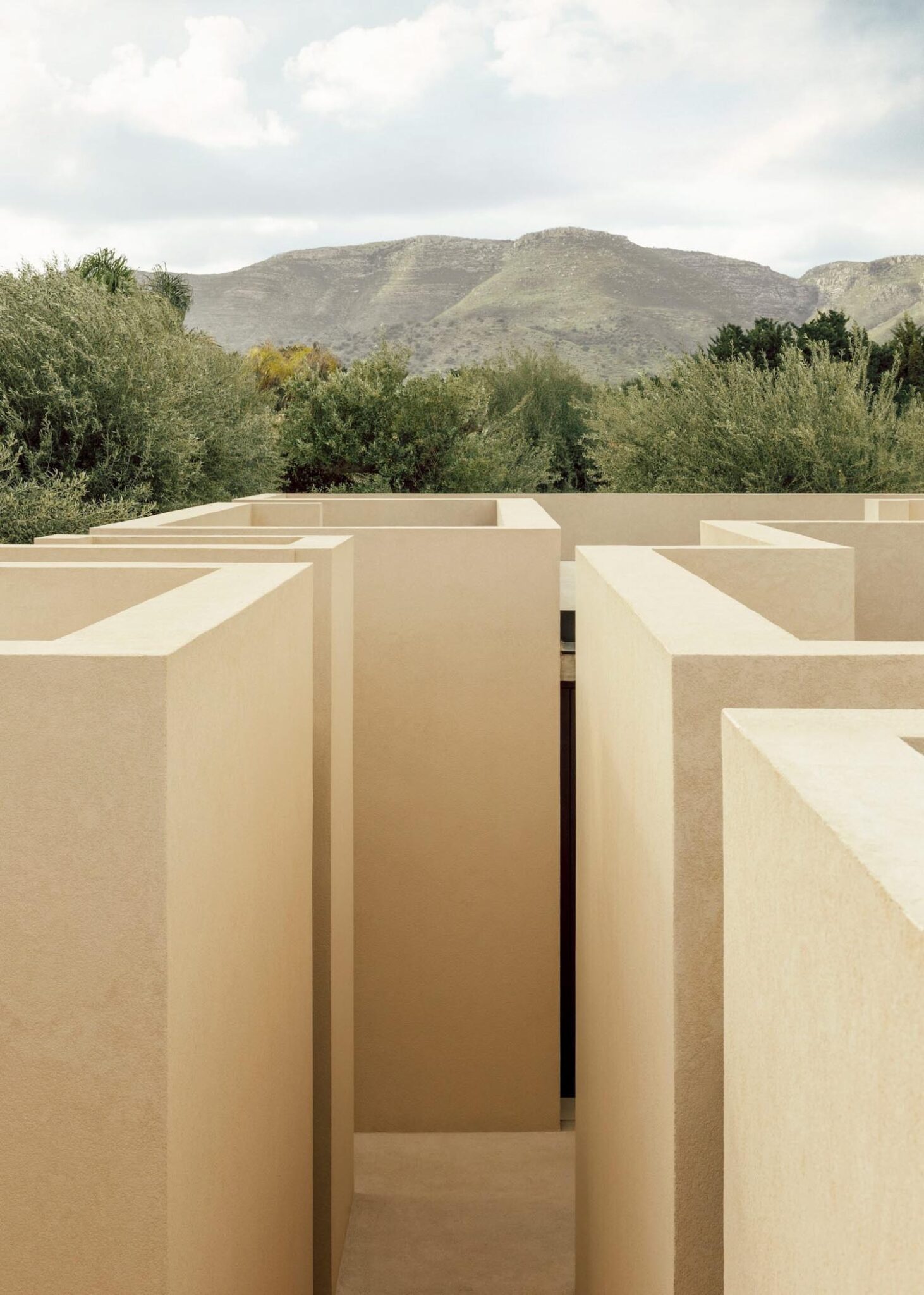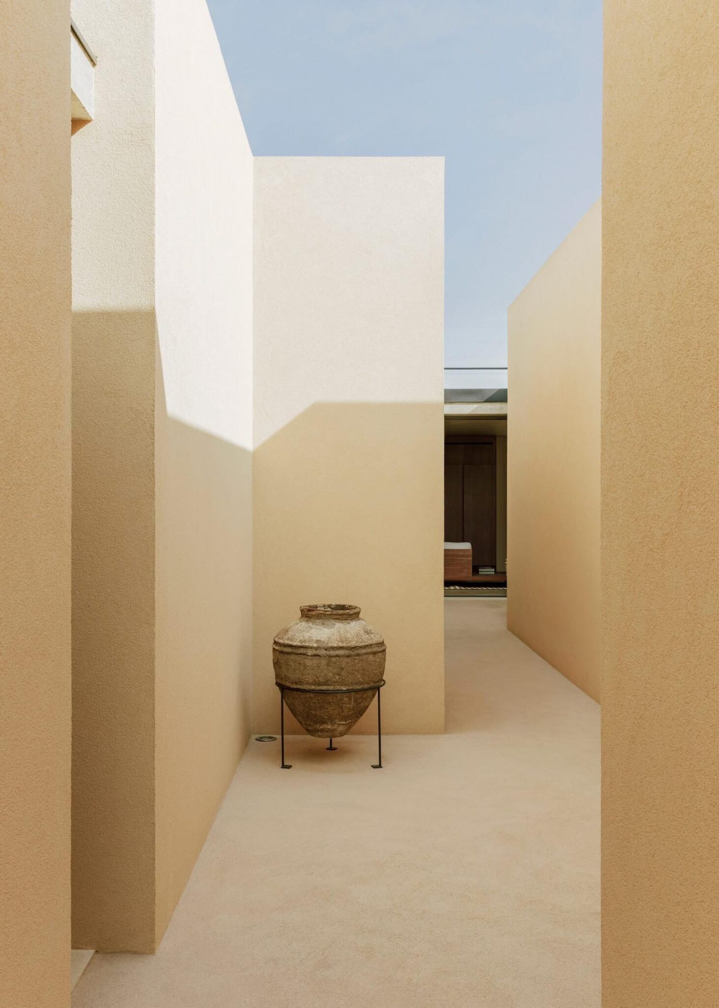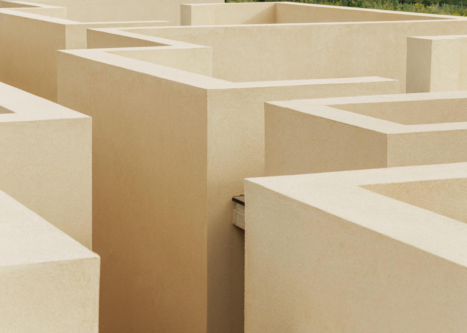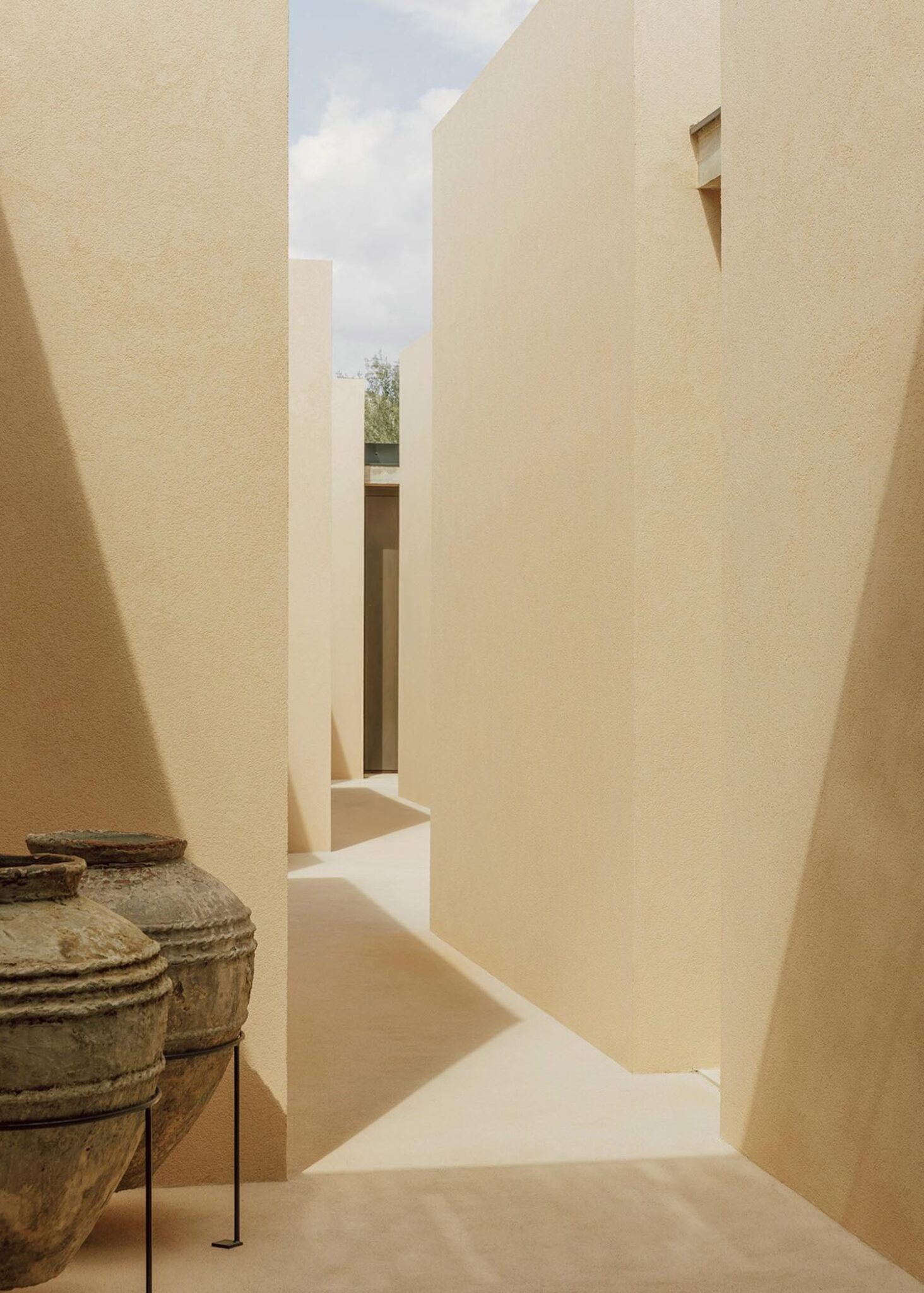 Este recorrido laberíntico se ha generado mediante la división de las dependencias de la residencia en bloques cúbicos individuales, cuya disposición permite crear pequeños patios abiertos íntimos —de discreta escala— que atenúan también la potencia de la luz solar. Con respetuosa delicadeza, Solum renueva la tradición de la arquitectura mediterránea. Lo observamos en elementos que remiten a ella, como la tonalidad clara y terrosa que armoniza con el cromatismo del suelo natural; o la presencia de detalles como celosías, destinadas a matizar la intimidad sin obturar el paso de iluminación y aire.