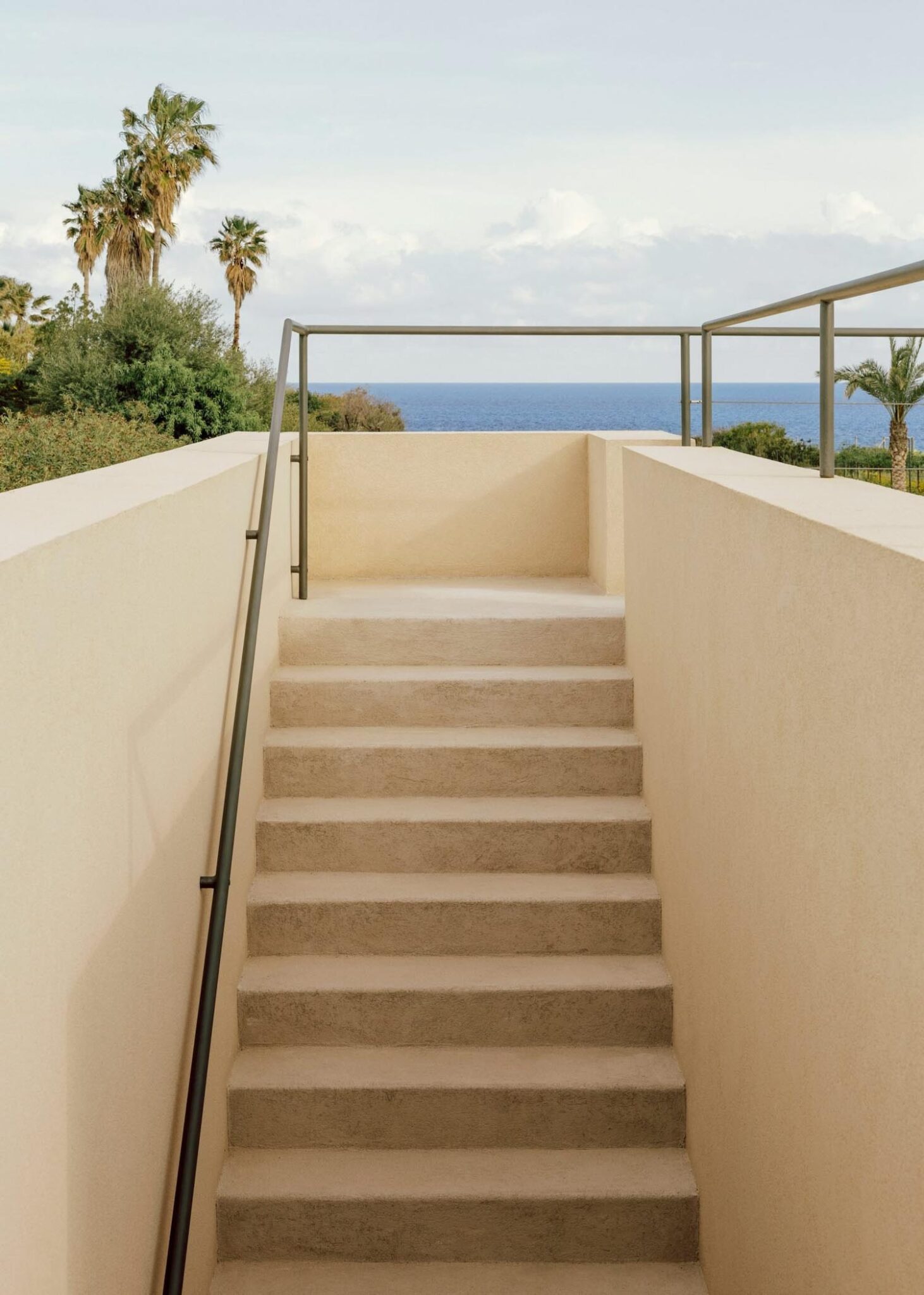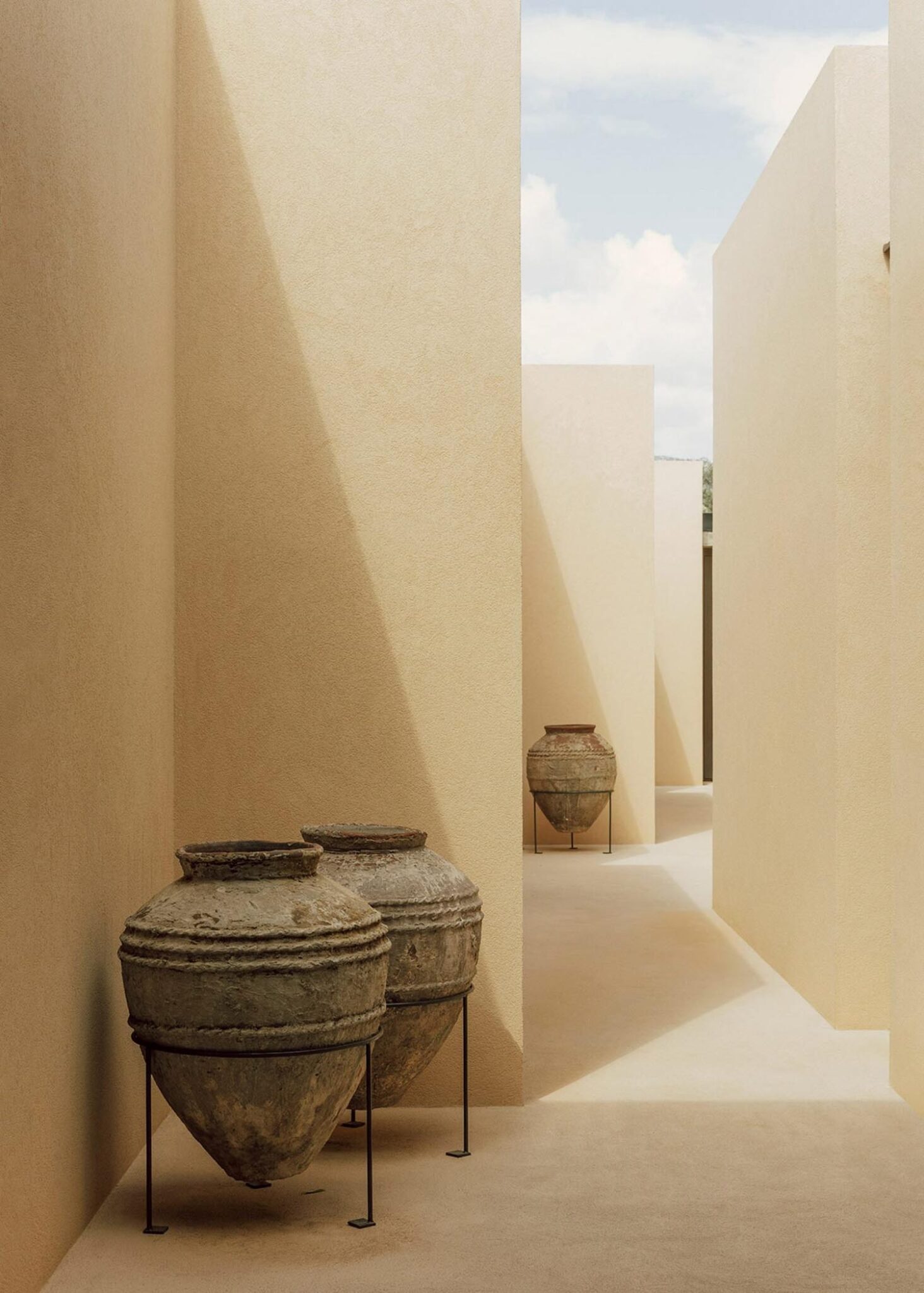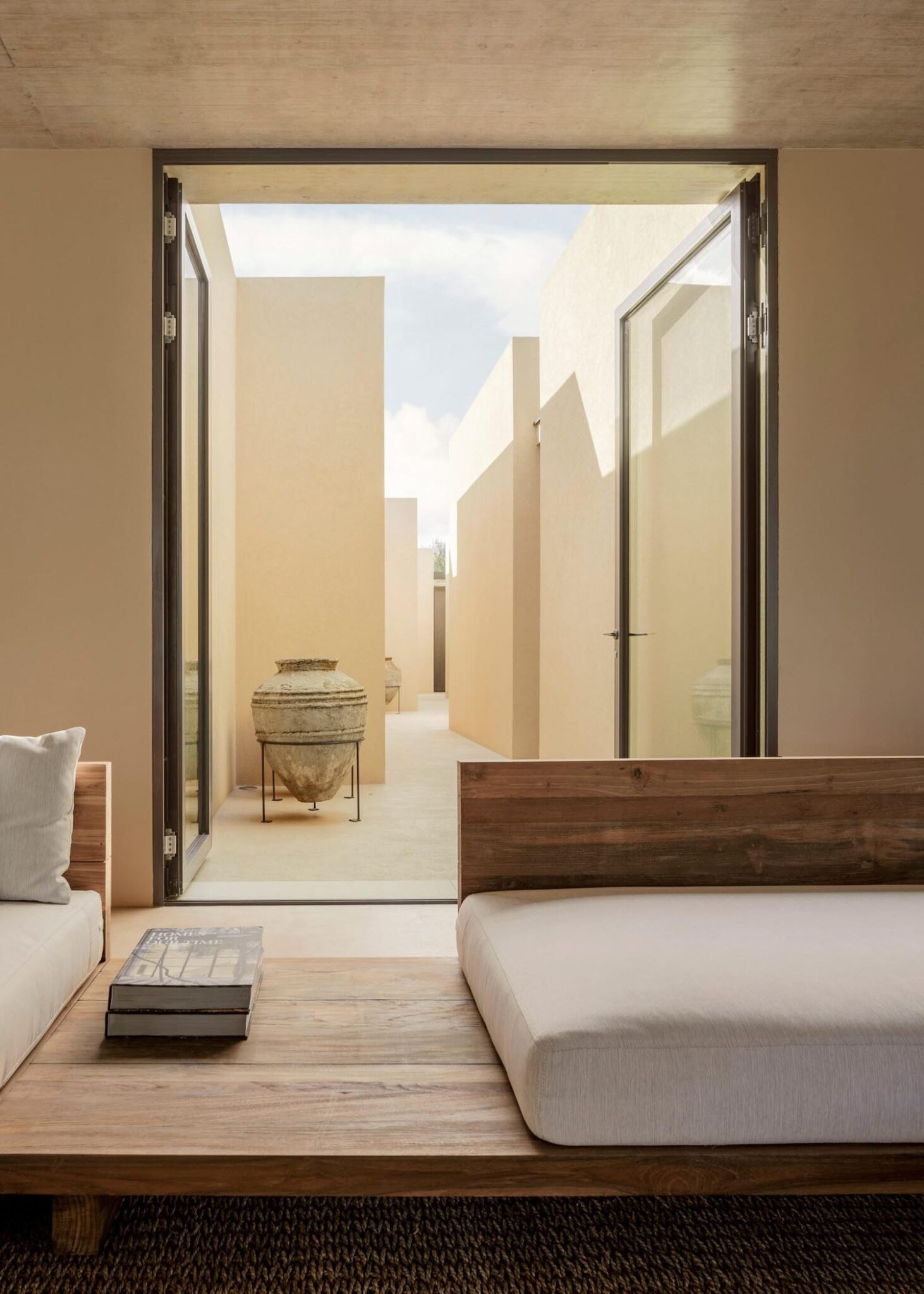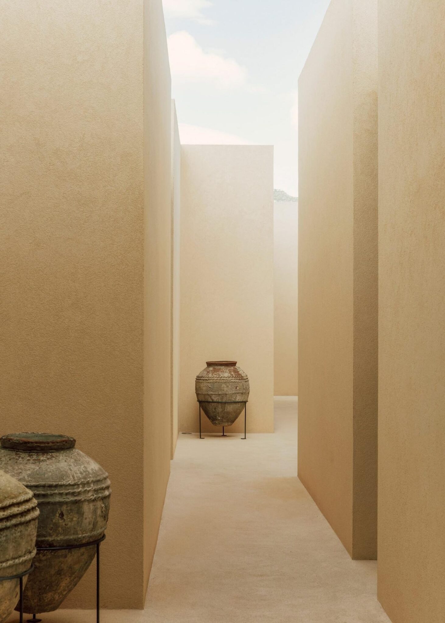 Este recorrido laberíntico se ha generado mediante la división de las dependencias de la residencia en bloques cúbicos individuales, cuya disposición permite crear pequeños patios abiertos íntimos —de discreta escala— que atenúan también la potencia de la luz solar. Con respetuosa delicadeza, Solum renueva la tradición de la arquitectura mediterránea. Lo observamos en elementos que remiten a ella, como la tonalidad clara y terrosa que armoniza con el cromatismo del suelo natural; o la presencia de detalles como celosías, destinadas a matizar la intimidad sin obturar el paso de iluminación y aire.