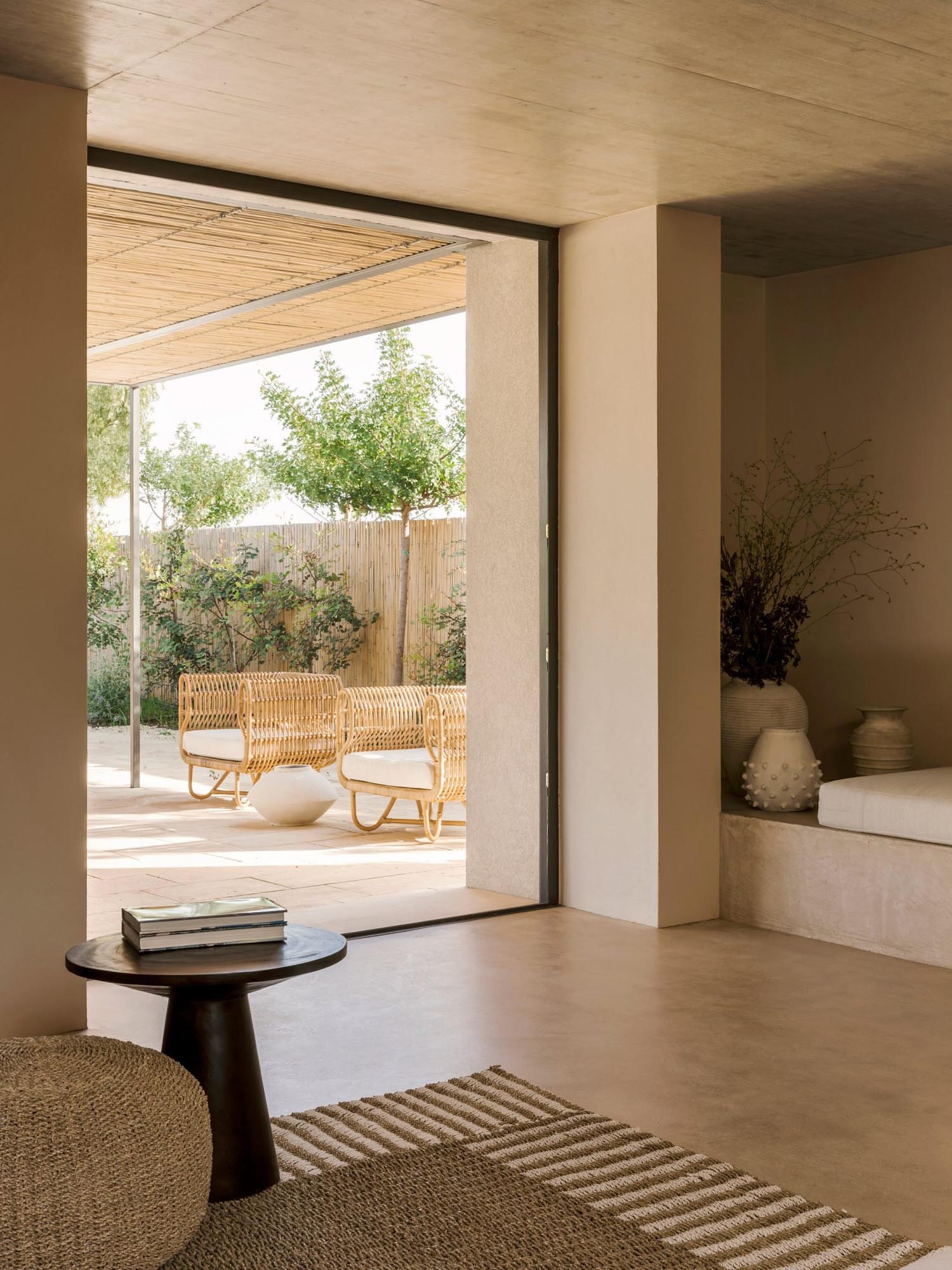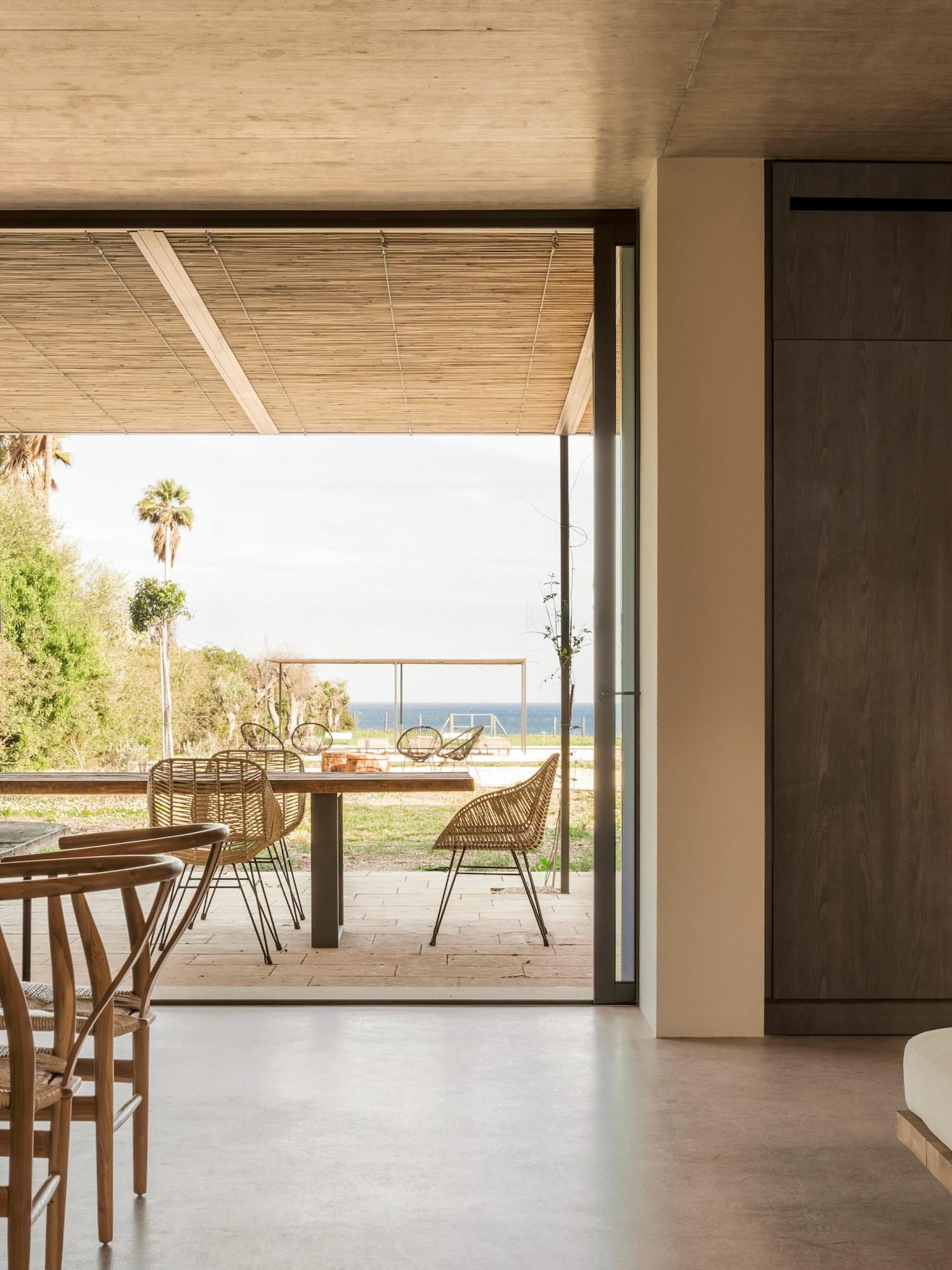 El mar penetra en Patio House gracias a las grandes puertas correderas de cristal, que se quedan ocultas tras las paredes de la sala de estar. Esto conduce la vista al interior, que también puede contemplarse desde la terraza, a la que se accede por una escalera situada en el patio interno. Dentro, los muros, el mobiliario y la decoración plasman una paleta neutra, dominada por colores ligados a la tierra y a los recursos naturales del paisaje; una decisión que insiste en la generación de una atmósfera acogedora y serena.
