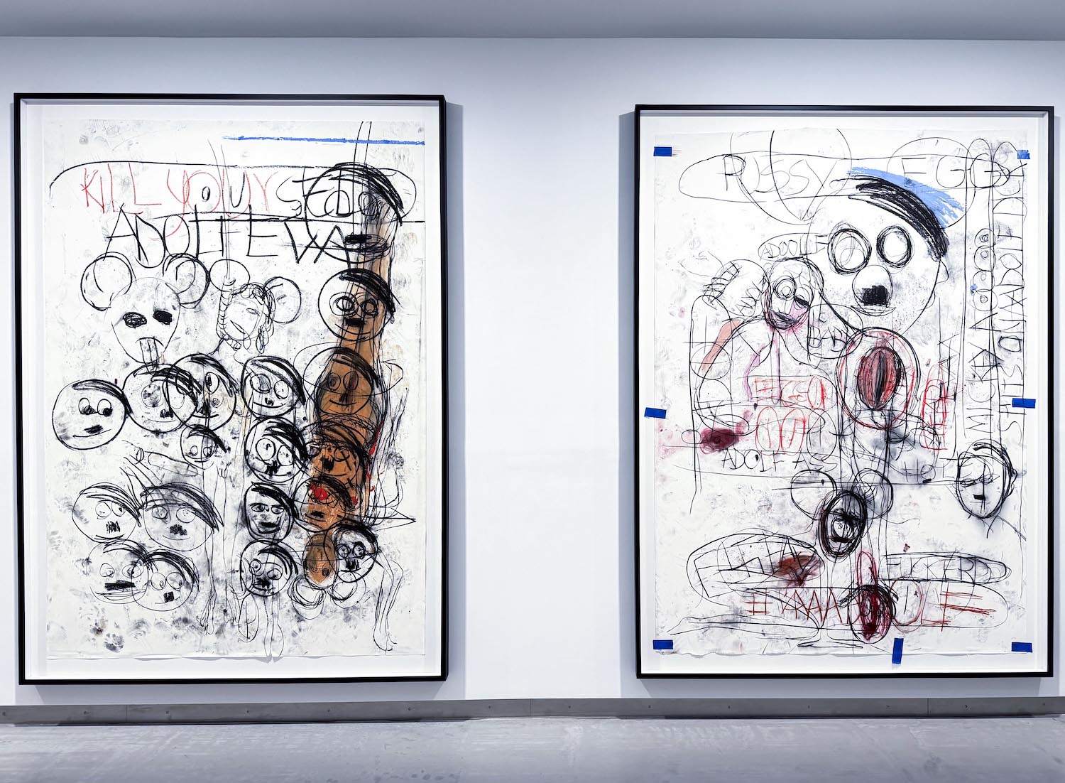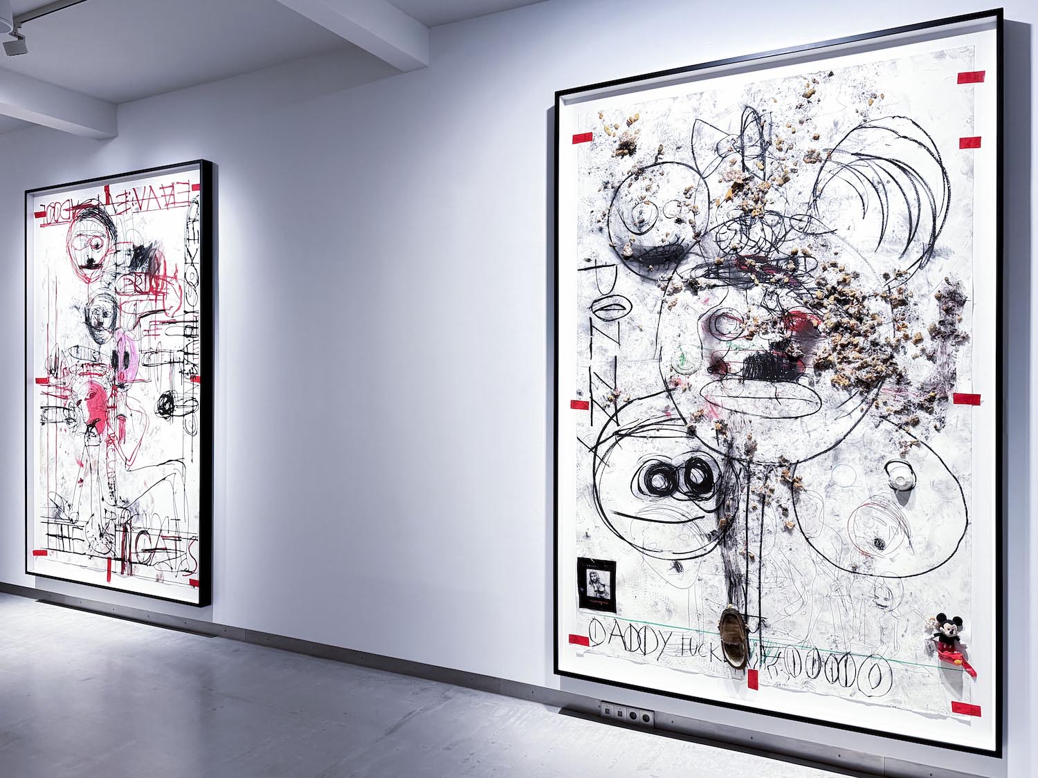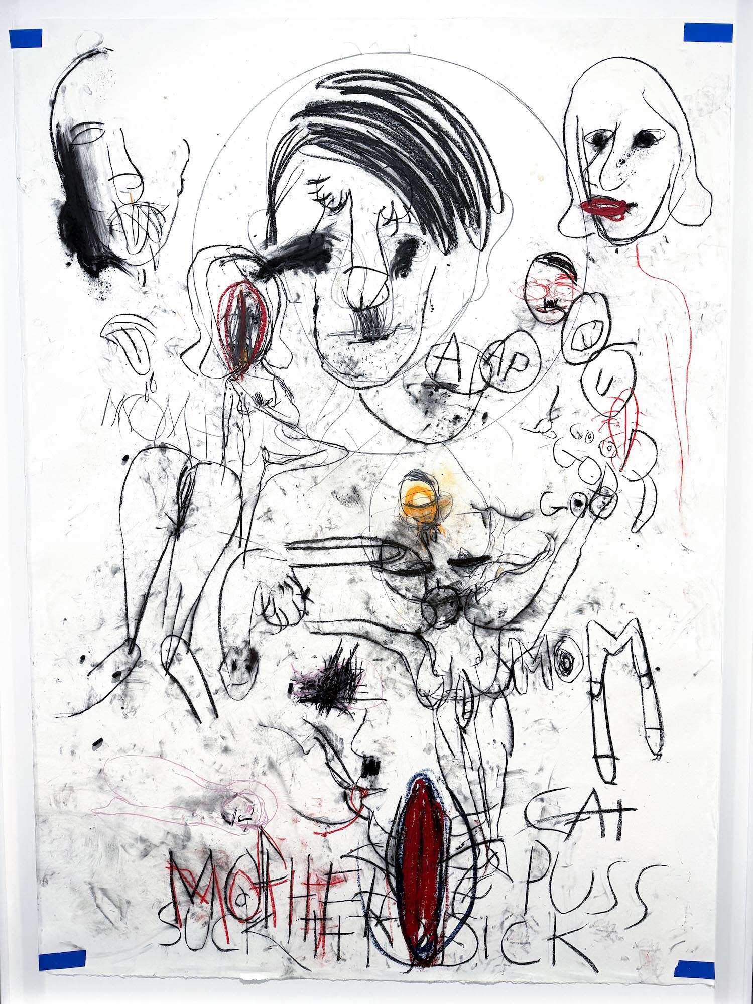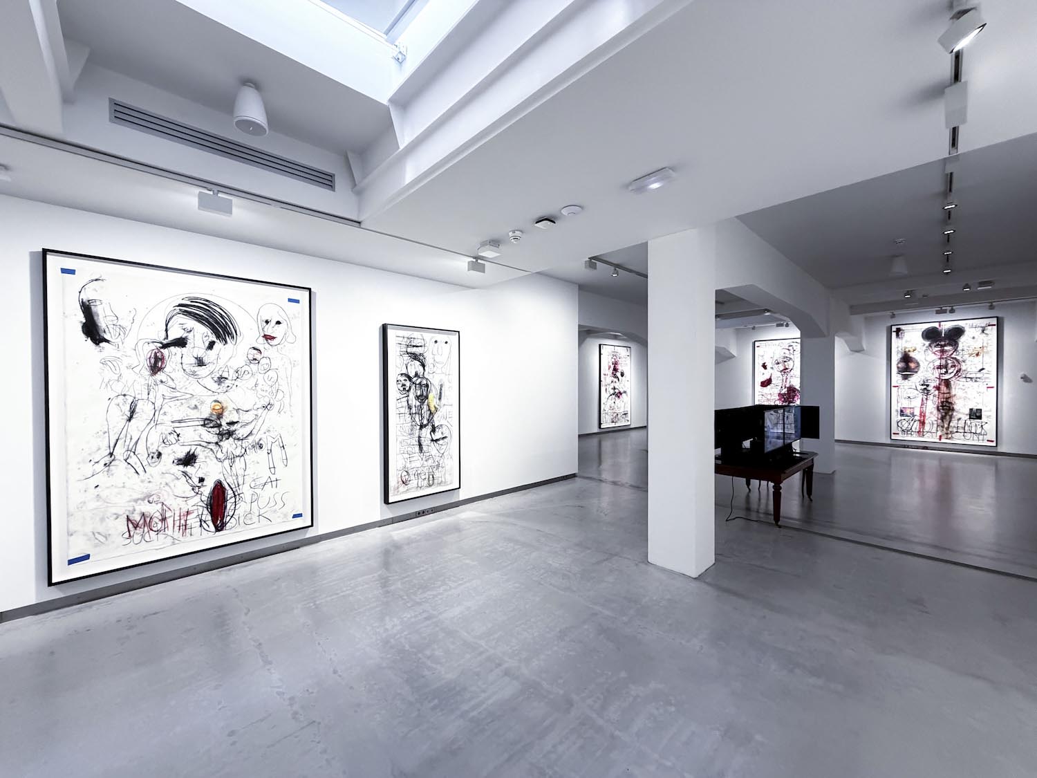 Las quince obras de gran formato que ocupan la sala capturan ese choque de perfiles. Los dibujos surgen de encuentros performativos entre Stangenberg y McCarthy, como residuos directos de la acción, cuya documentación en vídeo acompaña la exposición. Mediante trazos expresionistas, el californiano prioriza el proceso sobre la resolución estética. El papel recoge esa energía sin filtrar, compuesta de líneas abruptas, contornos deformados, manchas, huellas dactilares, escenas que parecen comprimidas en plena descomposición. Asoman también palabras e insultos, inscritos en el soporte como parte de la intervención.