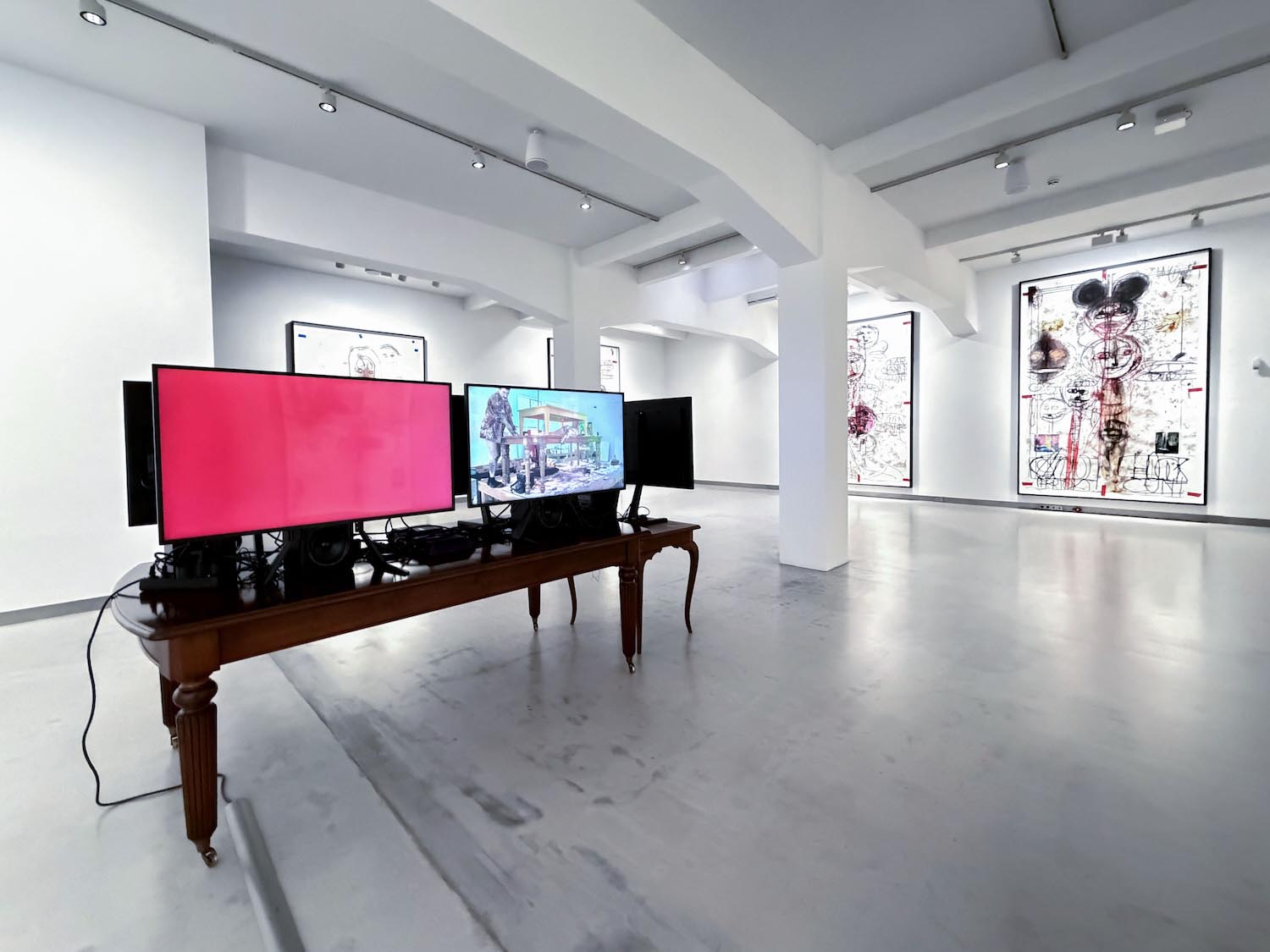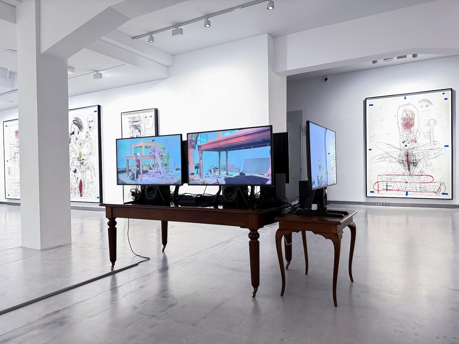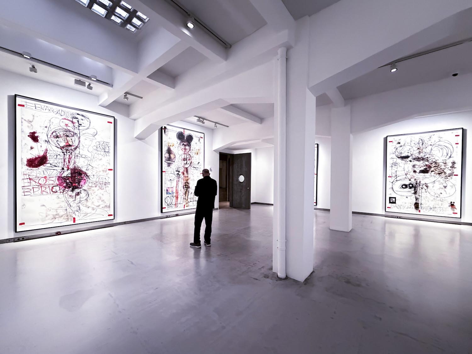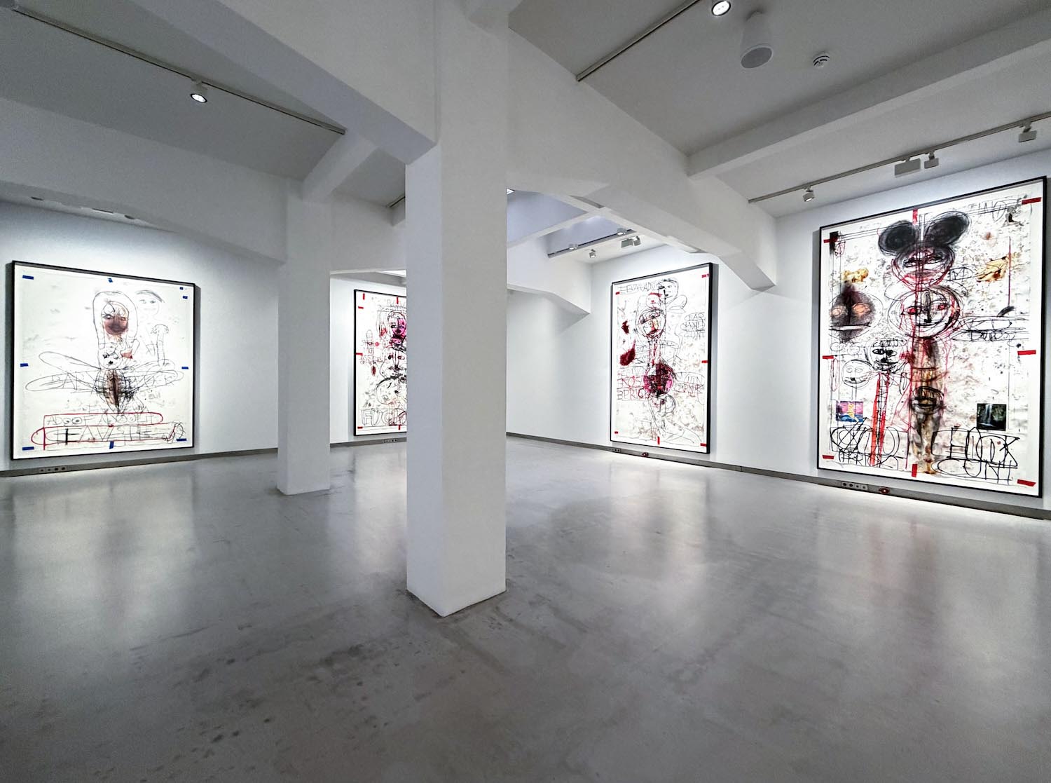 Las quince obras de gran formato que ocupan la sala capturan ese choque de perfiles. Los dibujos surgen de encuentros performativos entre Stangenberg y McCarthy, como residuos directos de la acción, cuya documentación en vídeo acompaña la exposición. Mediante trazos expresionistas, el californiano prioriza el proceso sobre la resolución estética. El papel recoge esa energía sin filtrar, compuesta de líneas abruptas, contornos deformados, manchas, huellas dactilares, escenas que parecen comprimidas en plena descomposición. Asoman también palabras e insultos, inscritos en el soporte como parte de la intervención.