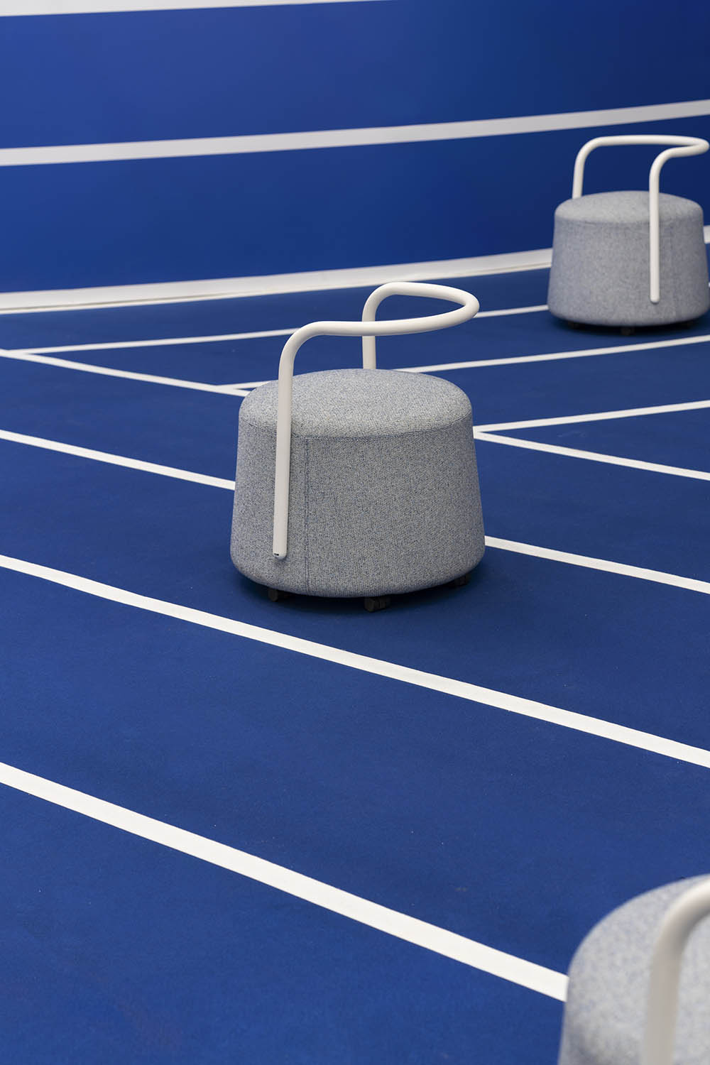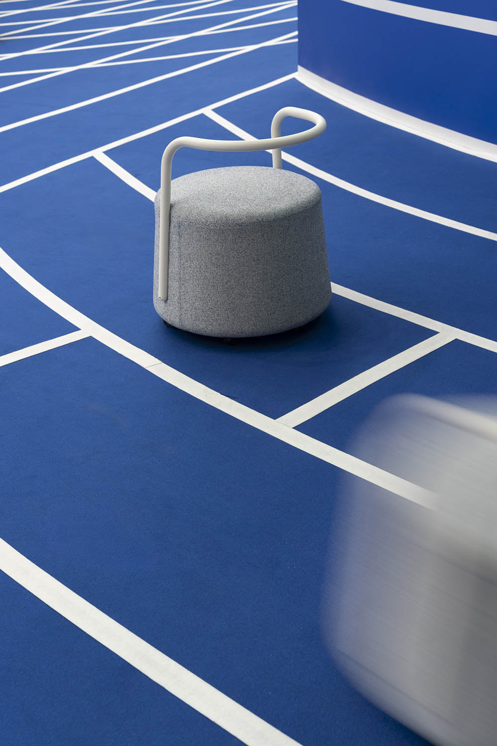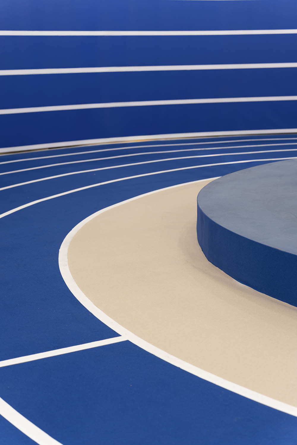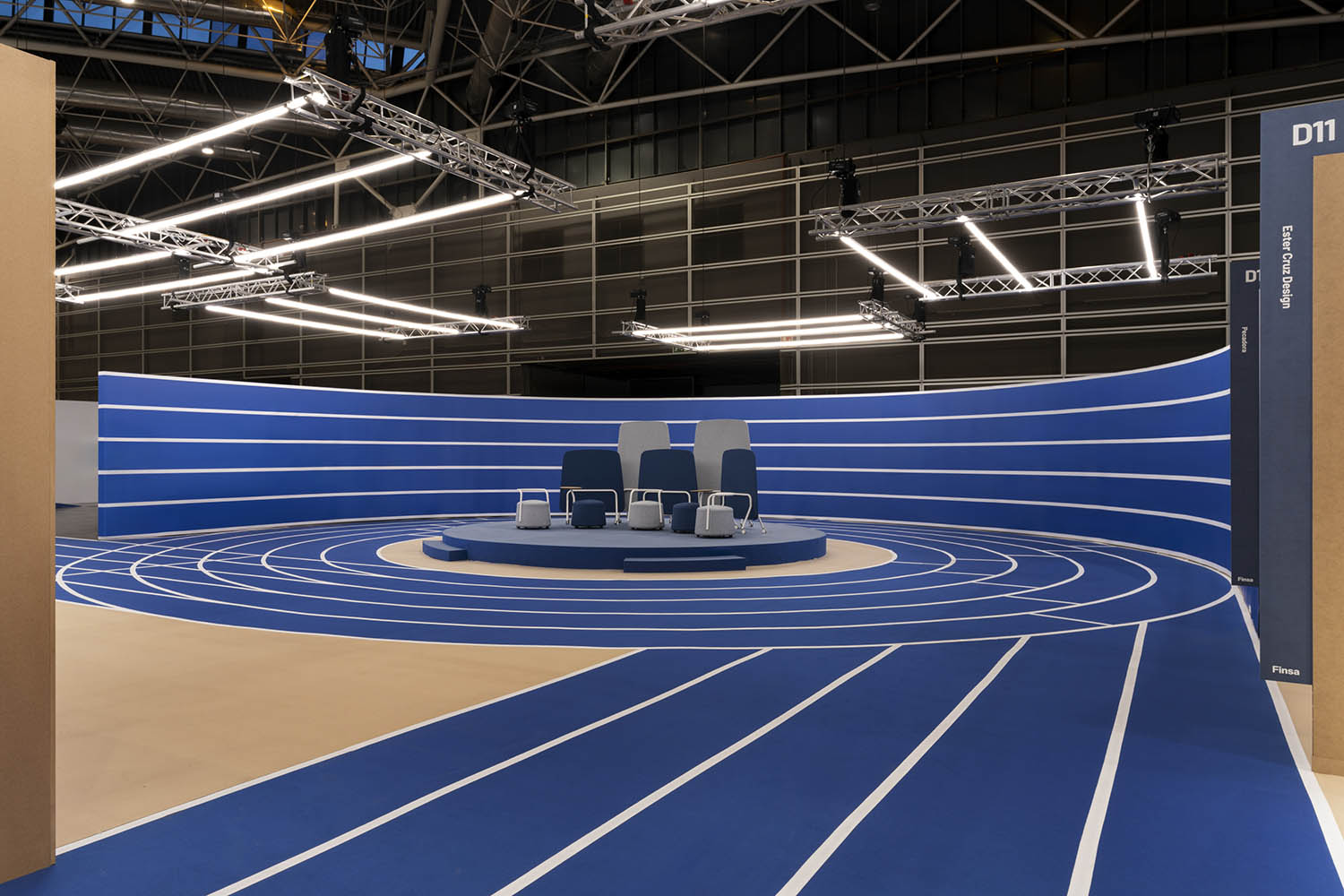 El diseñador José Manuel Ferrero presentó en la Feria Hábitat Valencia su proyecto para NUDE 2025 – Design in Motion. Una pista azul de atletismo que desarrollaba con radicalidad la idea del autor sobre cómo “el diseño necesita ritmo, constancia y visión a largo plazo”. Un planteamiento que, por un lado, pone de manifiesto la carga competitiva y deportiva de la profesión, a la vez que propone observar una inquietante perversión: su cansancio.