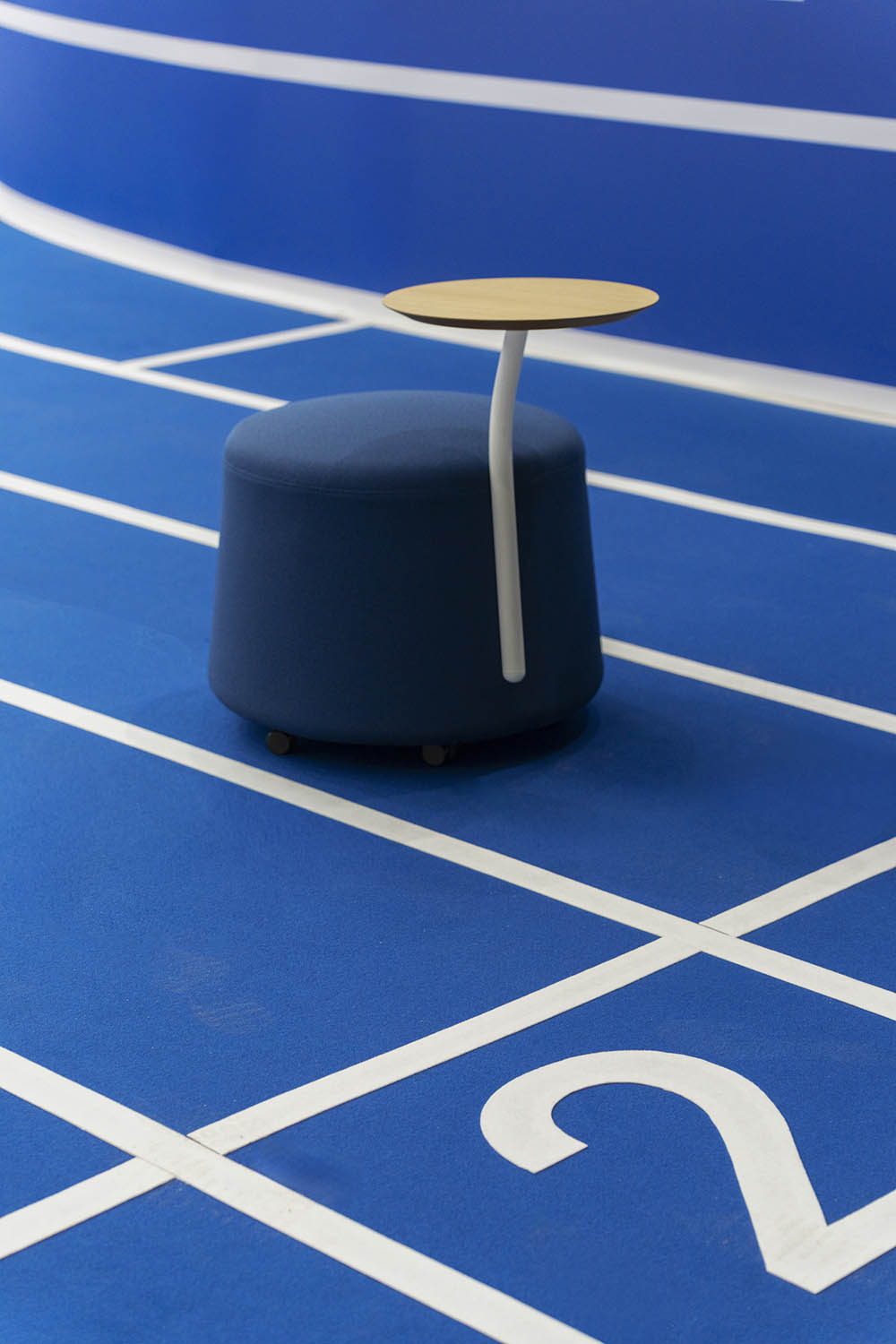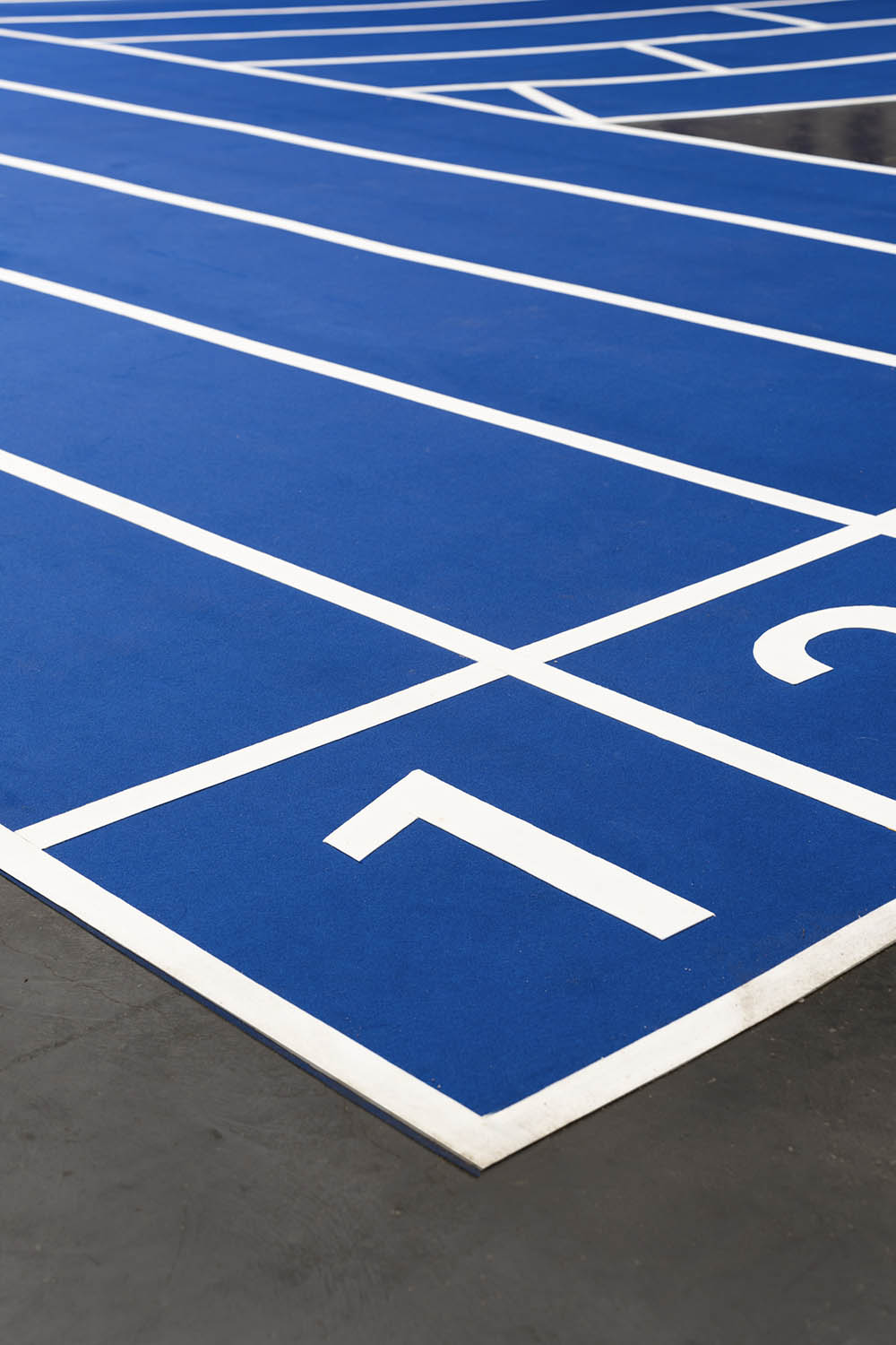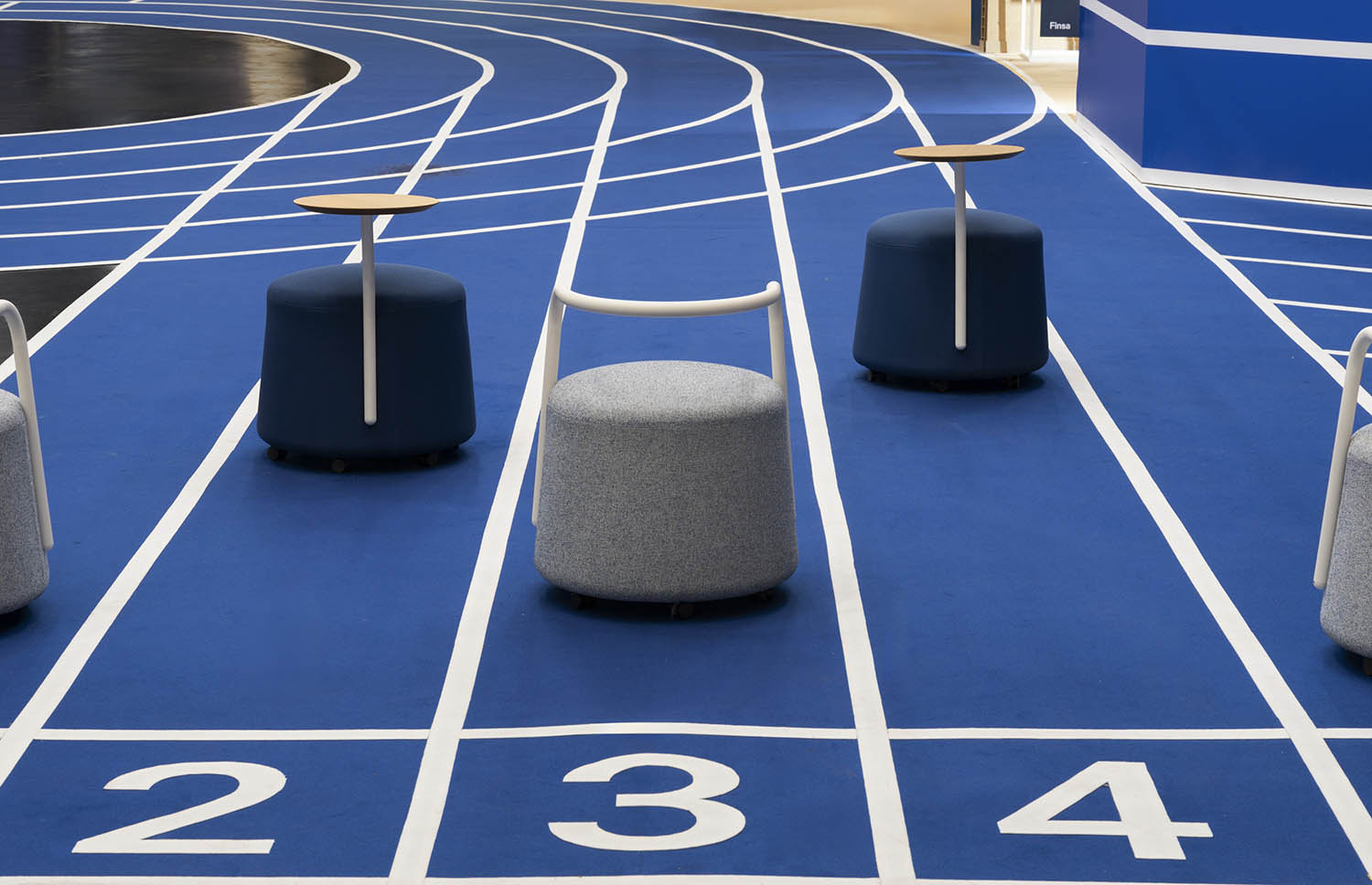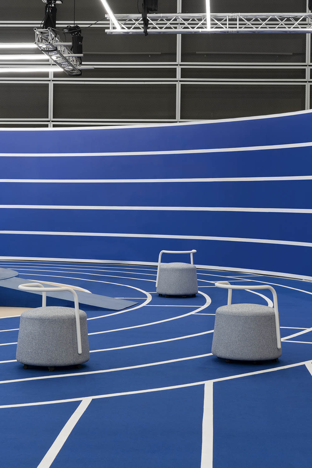 El diseñador José Manuel Ferrero presentó en la Feria Hábitat Valencia su proyecto para NUDE 2025 – Design in Motion. Una pista azul de atletismo que desarrollaba con radicalidad la idea del autor sobre cómo “el diseño necesita ritmo, constancia y visión a largo plazo”. Un planteamiento que, por un lado, pone de manifiesto la carga competitiva y deportiva de la profesión, a la vez que propone observar una inquietante perversión: su cansancio.