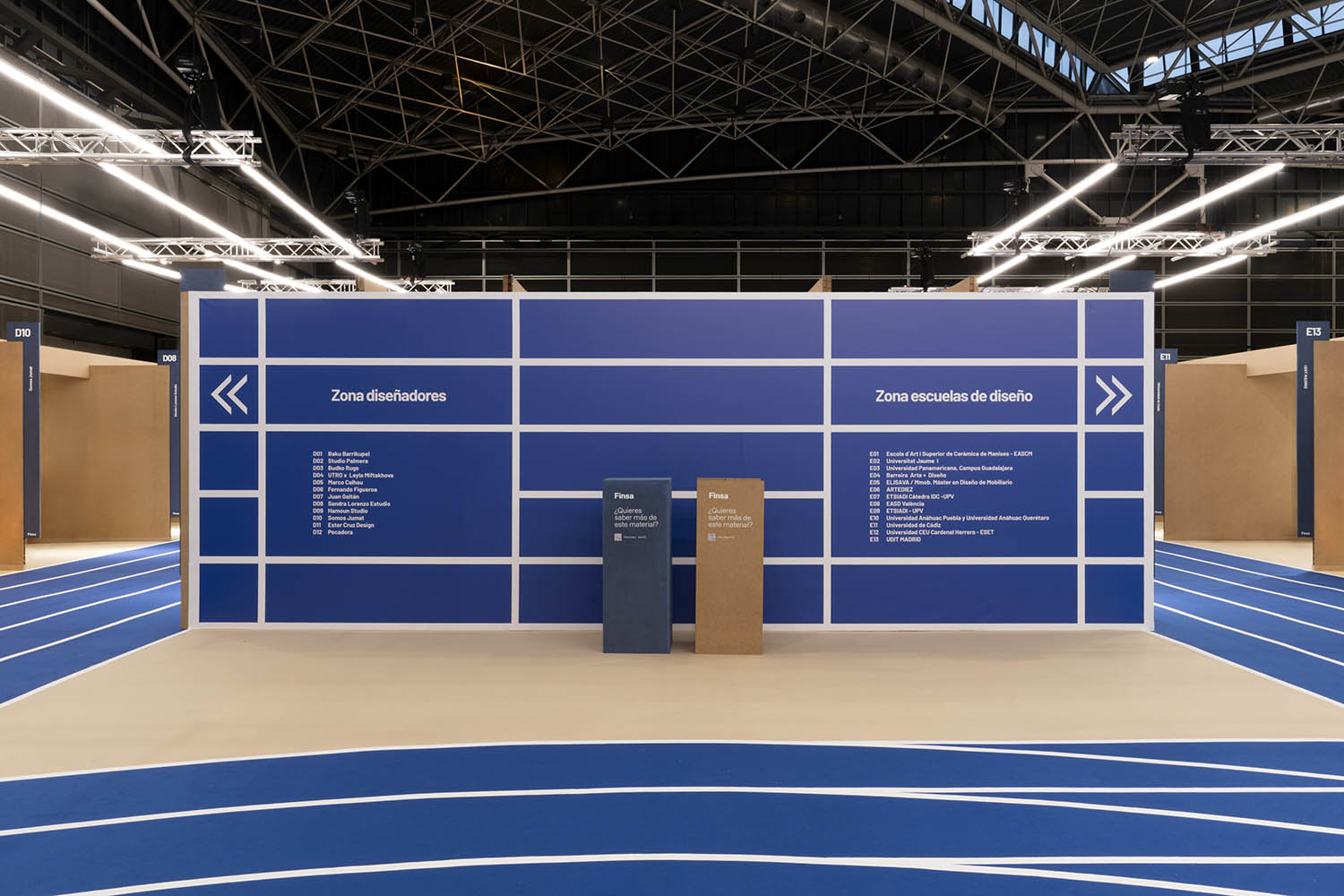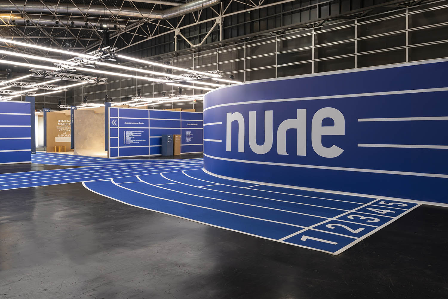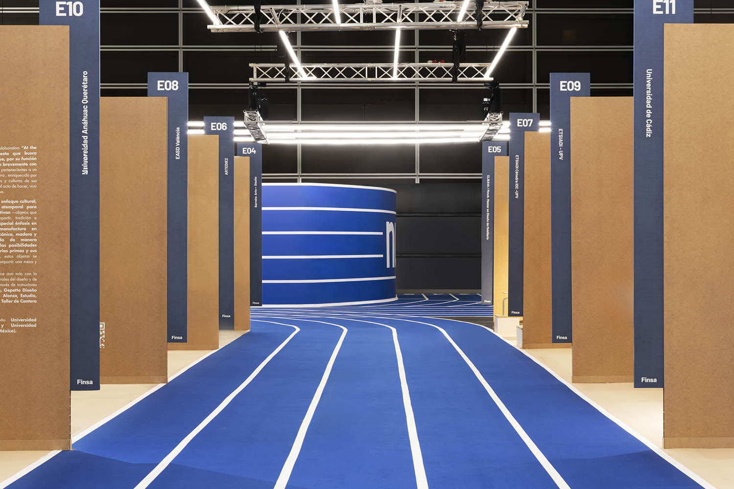 La escenografía de estudi{H}ac se inscribía en el marco de NUDE —dedicado al talento emergente dentro de la Feria Hábitat Valencia—, que este 2025 celebraba más de dos décadas como una de las plataformas más influyentes a nivel español y europeo. A través de un imaginario metafórico, José Manuel Ferrero se sirvió de la pista de atletismo para reivindicar la creación no como una carrera de velocidad, sino de resistencia.