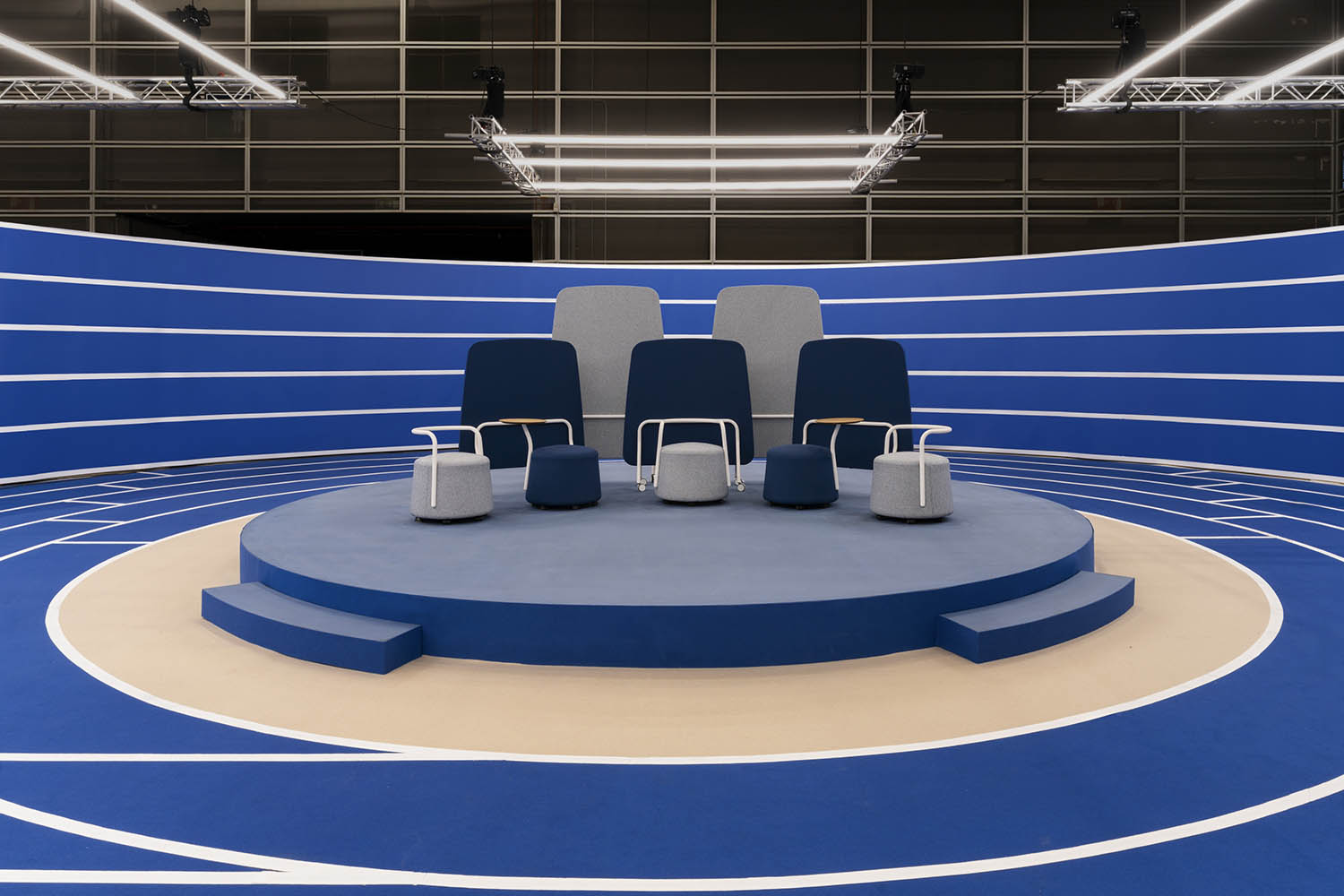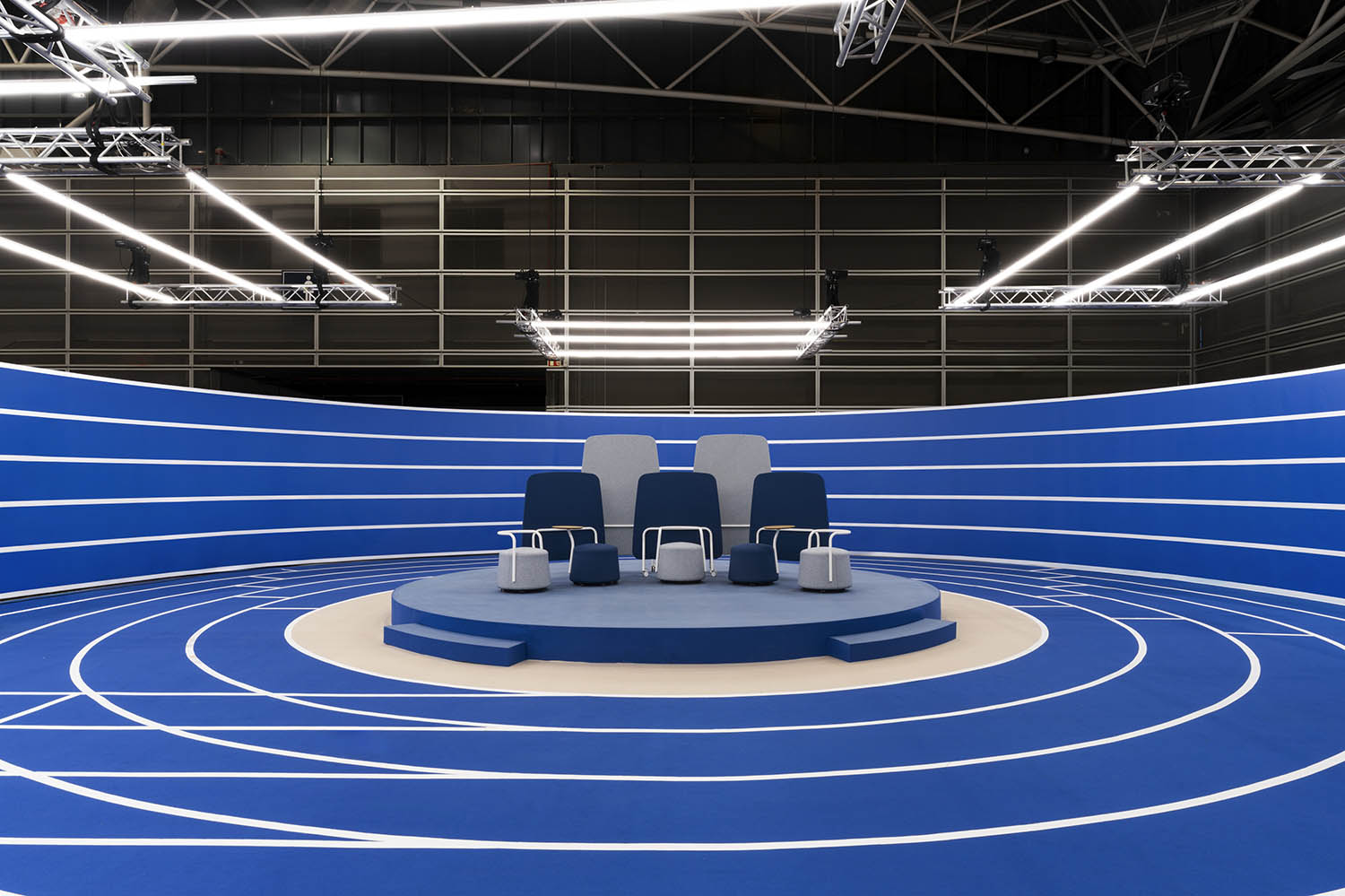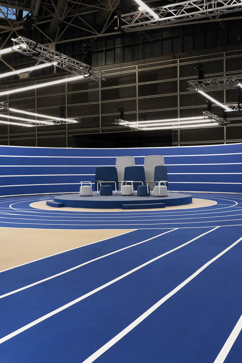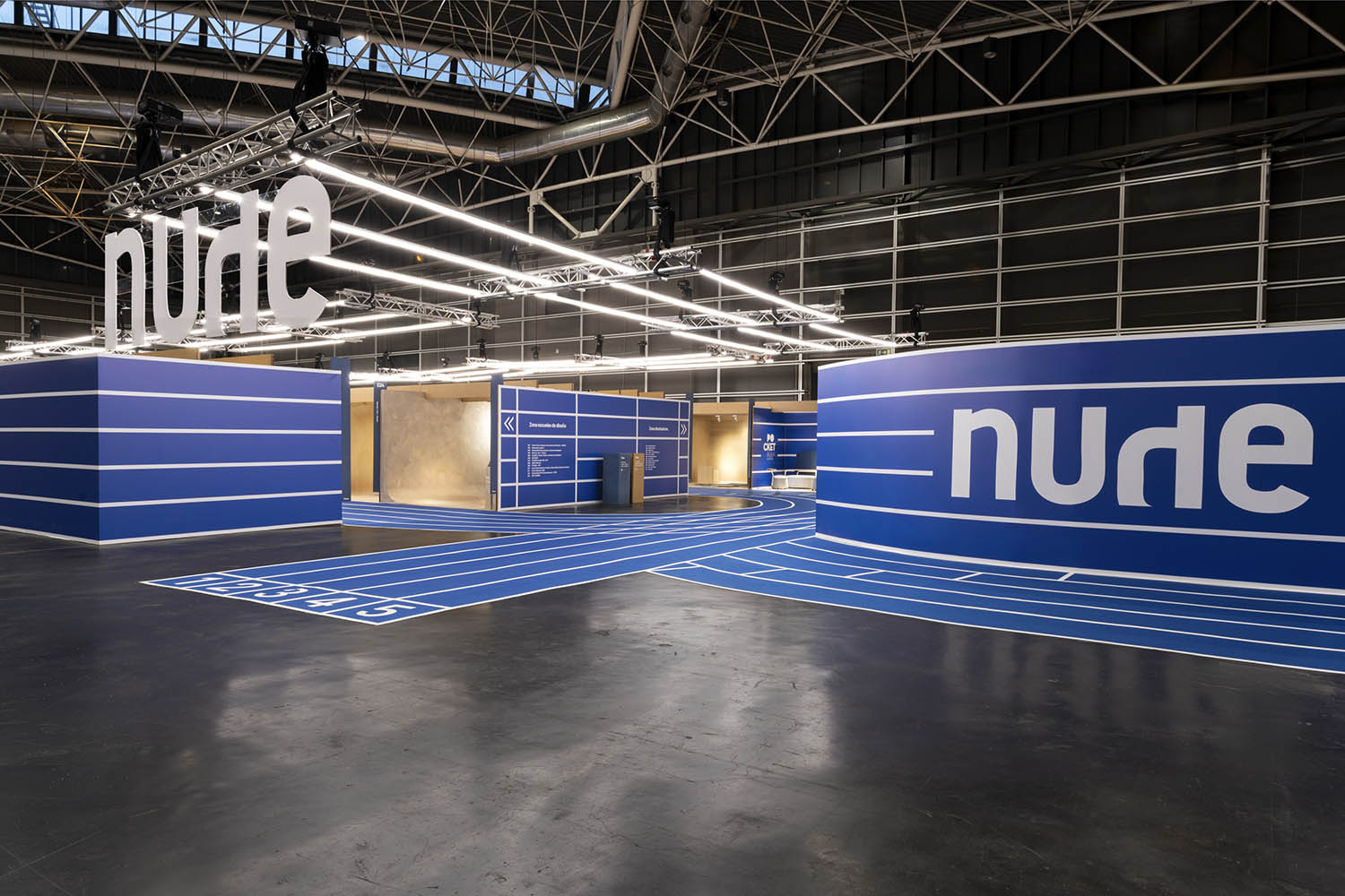 La escenografía de estudi{H}ac se inscribía en el marco de NUDE —dedicado al talento emergente dentro de la Feria Hábitat Valencia—, que este 2025 celebraba más de dos décadas como una de las plataformas más influyentes a nivel español y europeo. A través de un imaginario metafórico, José Manuel Ferrero se sirvió de la pista de atletismo para reivindicar la creación no como una carrera de velocidad, sino de resistencia.