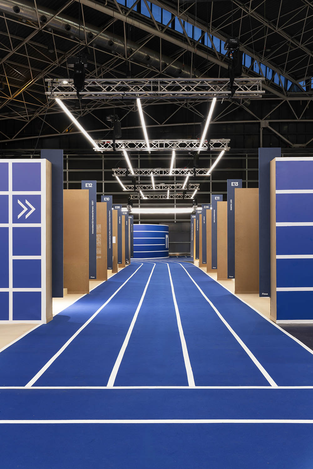 El dinamismo implícito de la pista recorría los aproximadamente 1500 m²: estructuras modulares, ensamblajes vistos y acabados honestos ponían el foco en la relación entre diseño y producción. Mientras que un amplio equipo de colaboradores conformaba la imagen final de la instalación: la iluminación flexible de CONALUX LED, los revestimientos de FINSA, el mobiliario de ACTIU y Andreu World, los pavimentos de Isidro Ruiz Córdoba o la gráfica y pintura de Montoro.