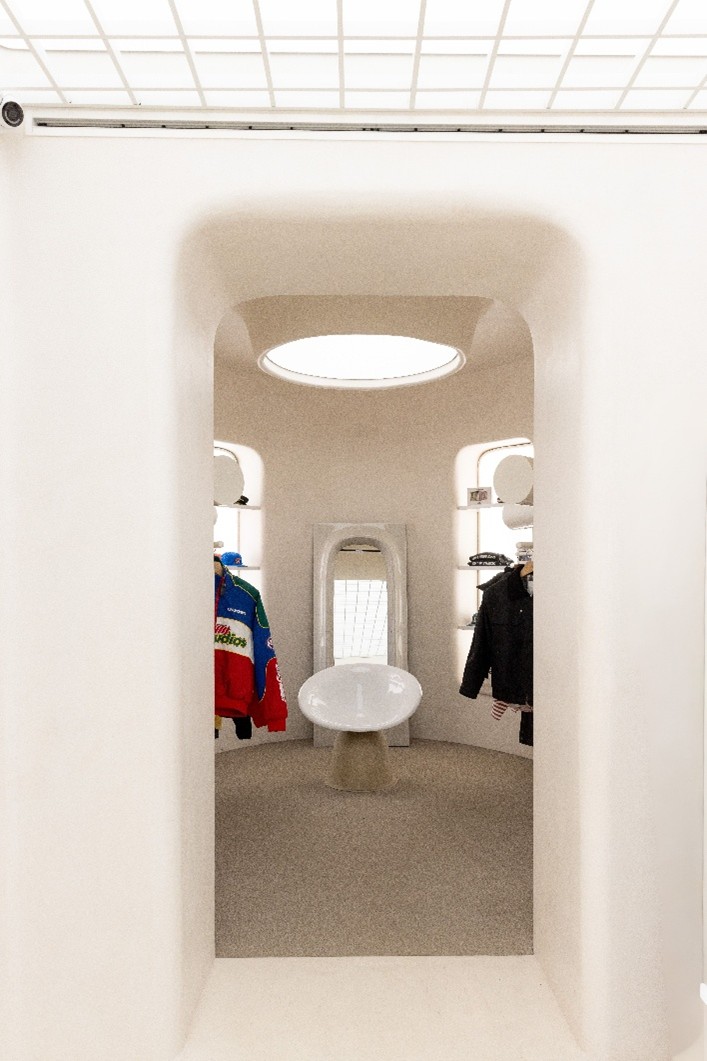 El establecimiento, diseñado por el estudio fundado por el arquitecto Marcos Anton, MABA Estudio, ocupa un local de 130 m² distribuidos en dos plantas. El proyecto se concibe como un espacio funcional y coherente con la identidad urbana de la marca, donde la implantación comercial y la experiencia del cliente se integran de manera estratégica. Las formas redondeadas y el juego de volumetrías construyen una atmósfera depurada, donde la neutralidad cromática cede el protagonismo al carácter streetwear de la marca.