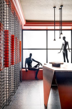 El mostrador, pieza central del espacio, es una escultura en hierro que evoca la técnica del origami. Junto con la fachada, conforman un conjunto que desafía las convenciones y sorprende al visitante.