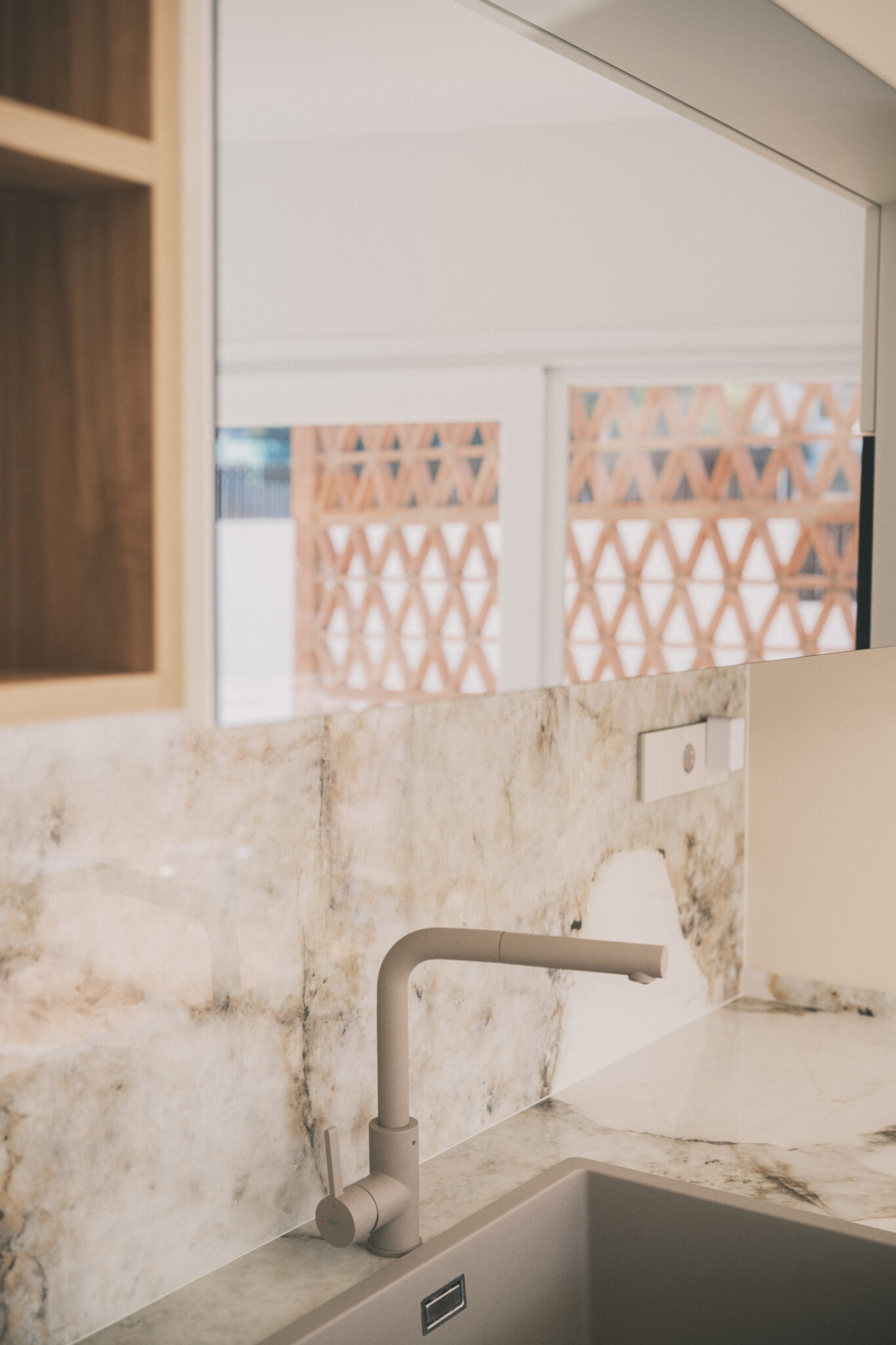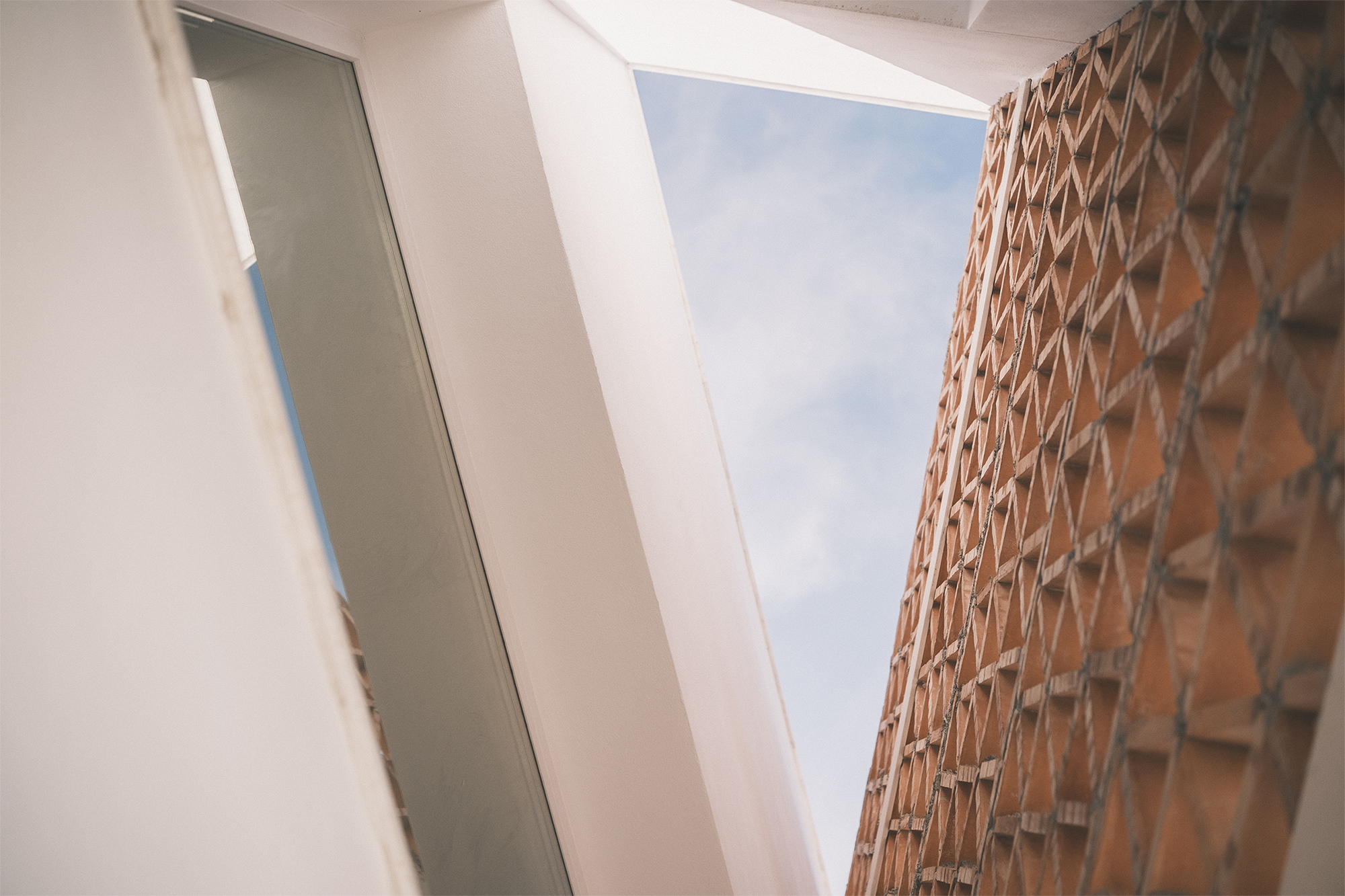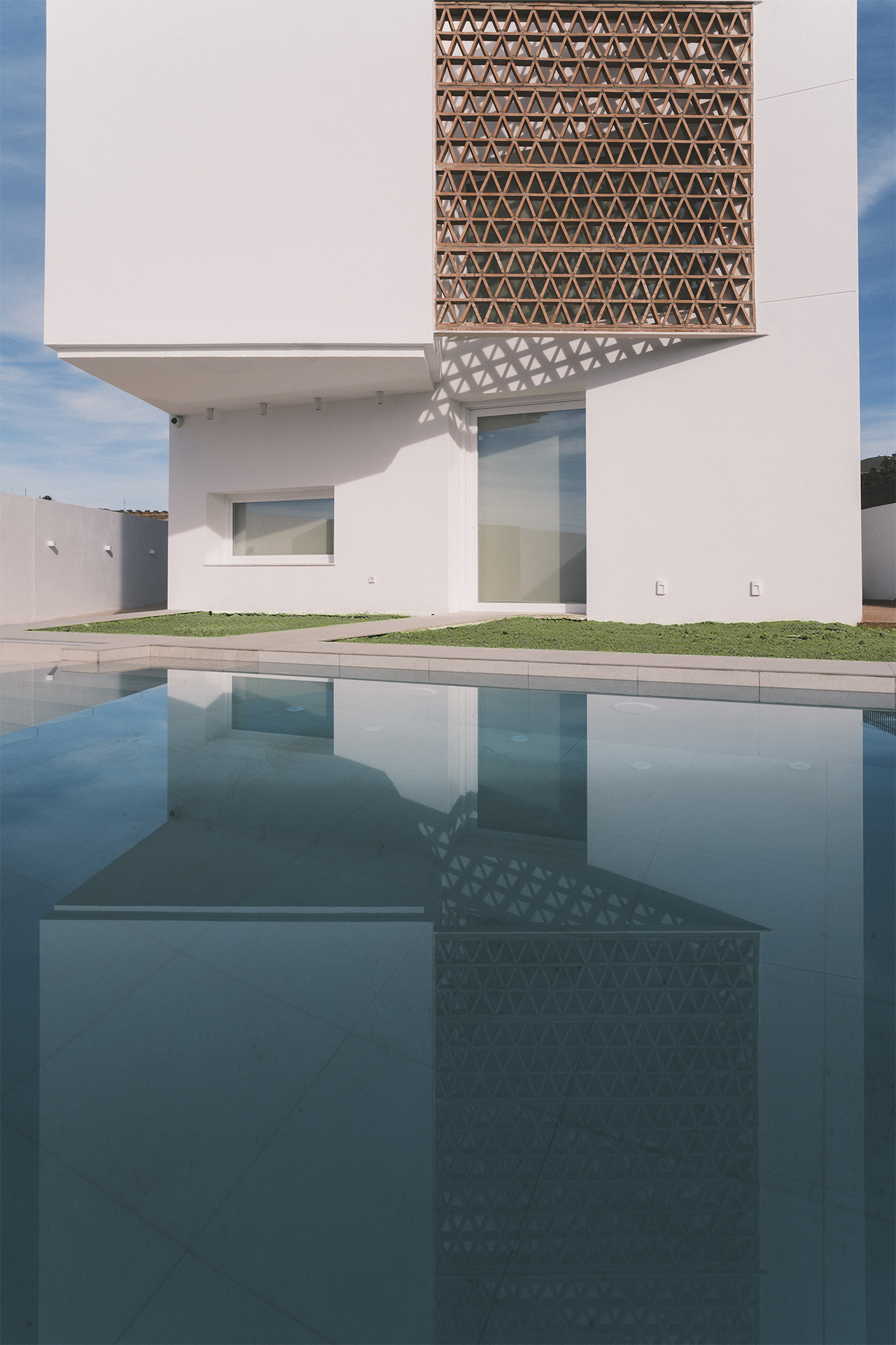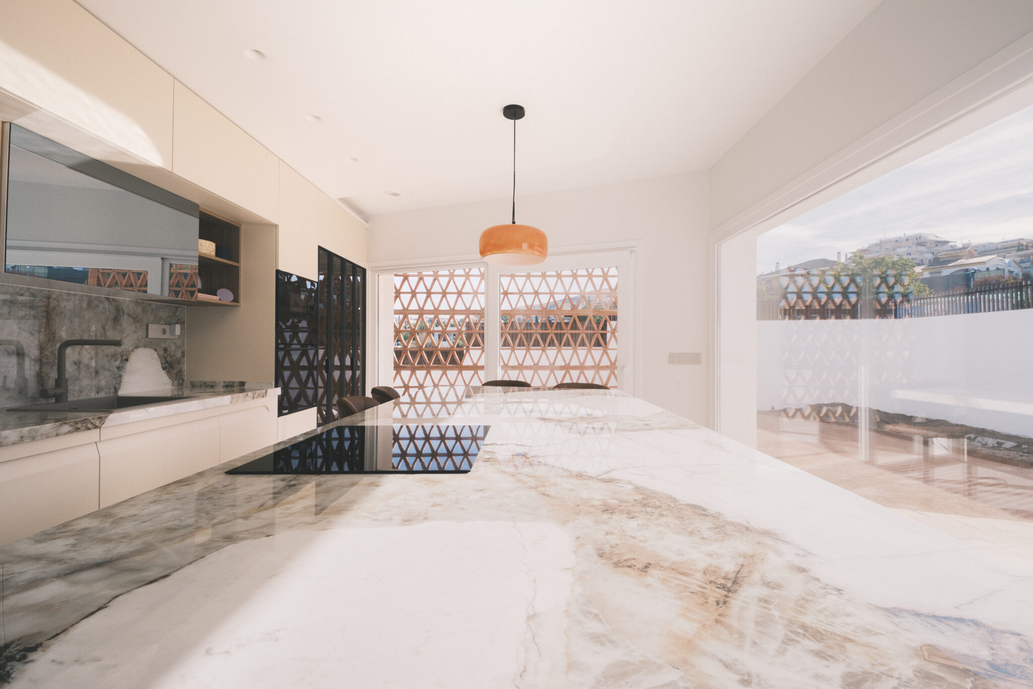 La luz se trabaja como un material más. Las celosías cerámicas, diseñadas ladrillo a ladrillo y ejecutadas a mano durante la obra, son uno de los elementos clave del proyecto. Un mismo patrón triangular se repite en tres puntos estratégicos: en la terraza de la cocina, en la parte superior del patio y en la doble altura del salón. Por la mañana, el dibujo aparece en la cocina; al mediodía, se desplaza al patio; por la tarde, entra en el salón.