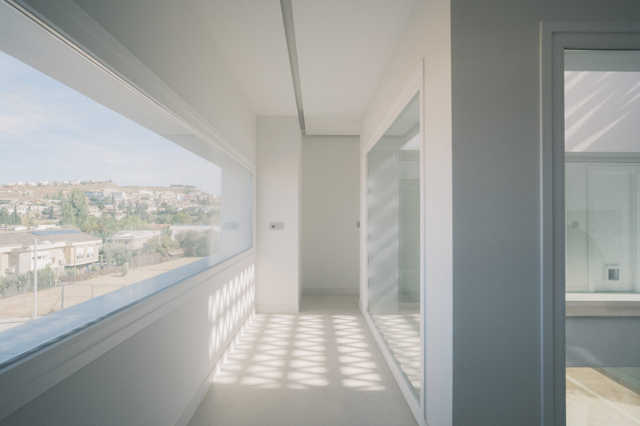Los espacios privados se organizan alrededor de esta vista, aprovechando la luz natural y el paisaje lejano mientras el patio y las celosías siguen controlando la radiación directa y las visuales más cercanas.