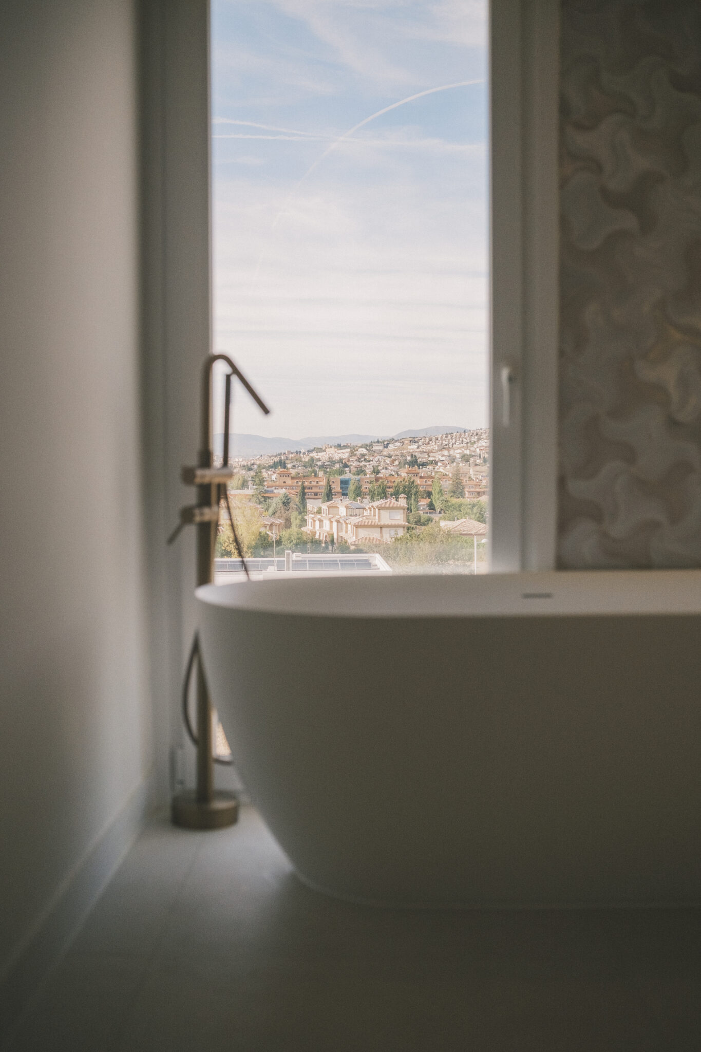 La planta primera alberga los dormitorios y un estudio de teletrabajo. El desembarco de la escalera se abre a un ventanal apaisado que enmarca el skyline de Granada y la silueta de la Alhambra, convirtiendo la subida diaria en un pequeño ritual de reconocimiento del lugar.