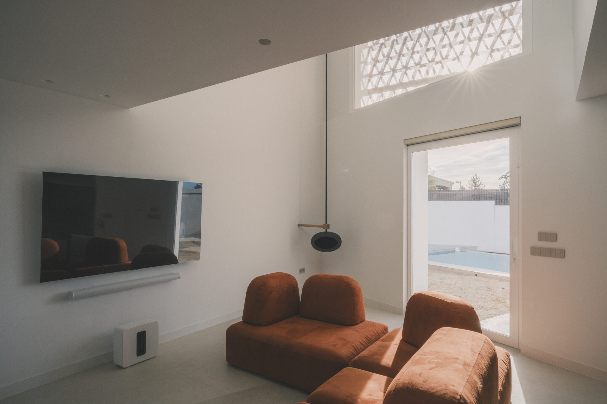 El salón de Casa Alma se abre al patio y al jardín oeste como una estancia pensada para el descanso y la contemplación. Aunque su superficie es contenida, la doble altura amplía la percepción del espacio y refuerza la relación con la luz, que entra tamizada a través de la celosía y va transformando la atmósfera a lo largo del día. Un gran sofá en tono terracota y una chimenea de bioetanol articulan este ambiente sereno, concebido para disfrutar del tiempo doméstico desde la calma y la continuidad con el exterior.