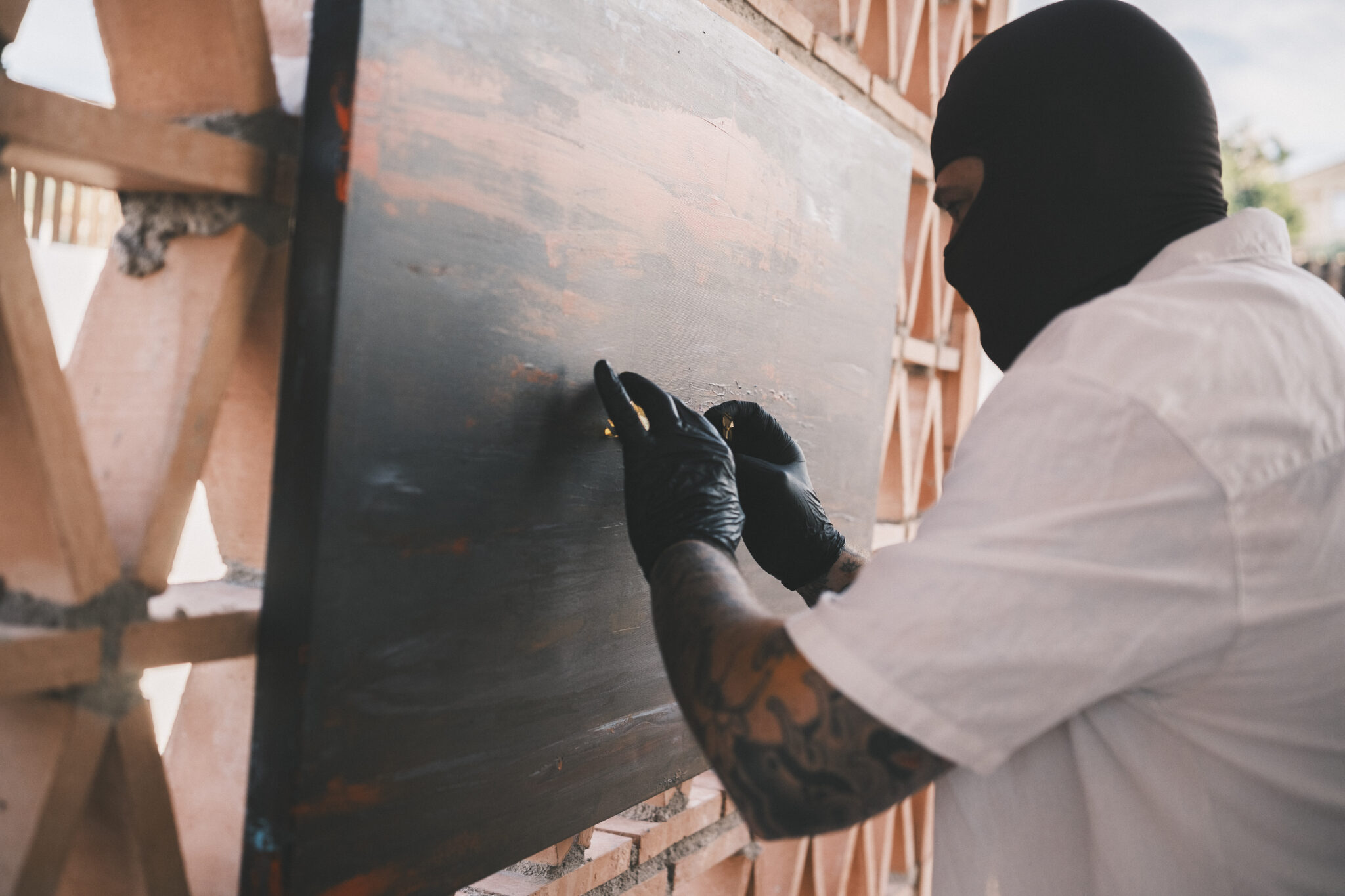 La acción consistió en que los participantes depositaran pequeñas láminas de oro sobre el lienzo mientras el artista guiaba el proceso. Más tarde, los propios propietarios retiraron el exceso con un pincel hasta dejar aparecer una fina línea dorada.