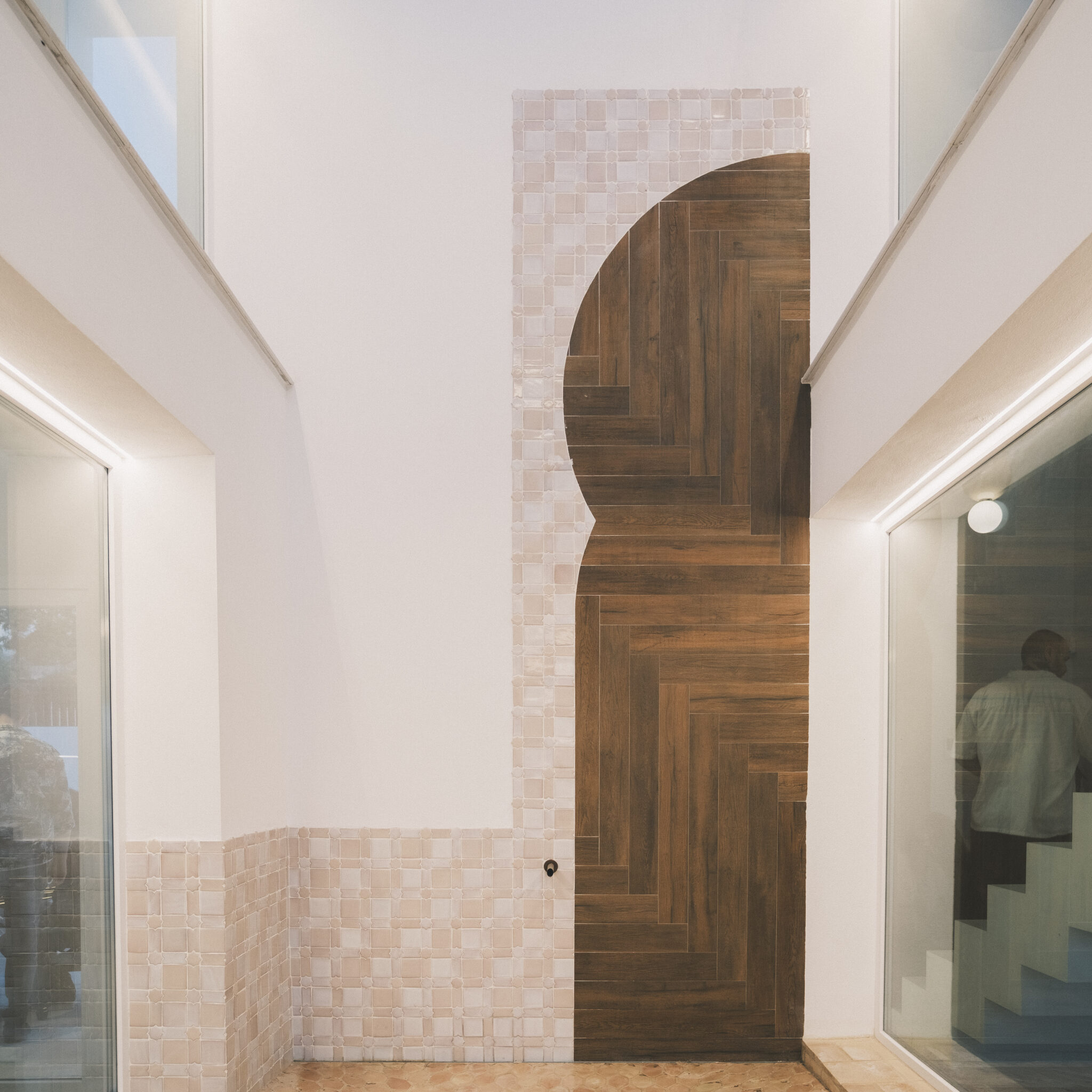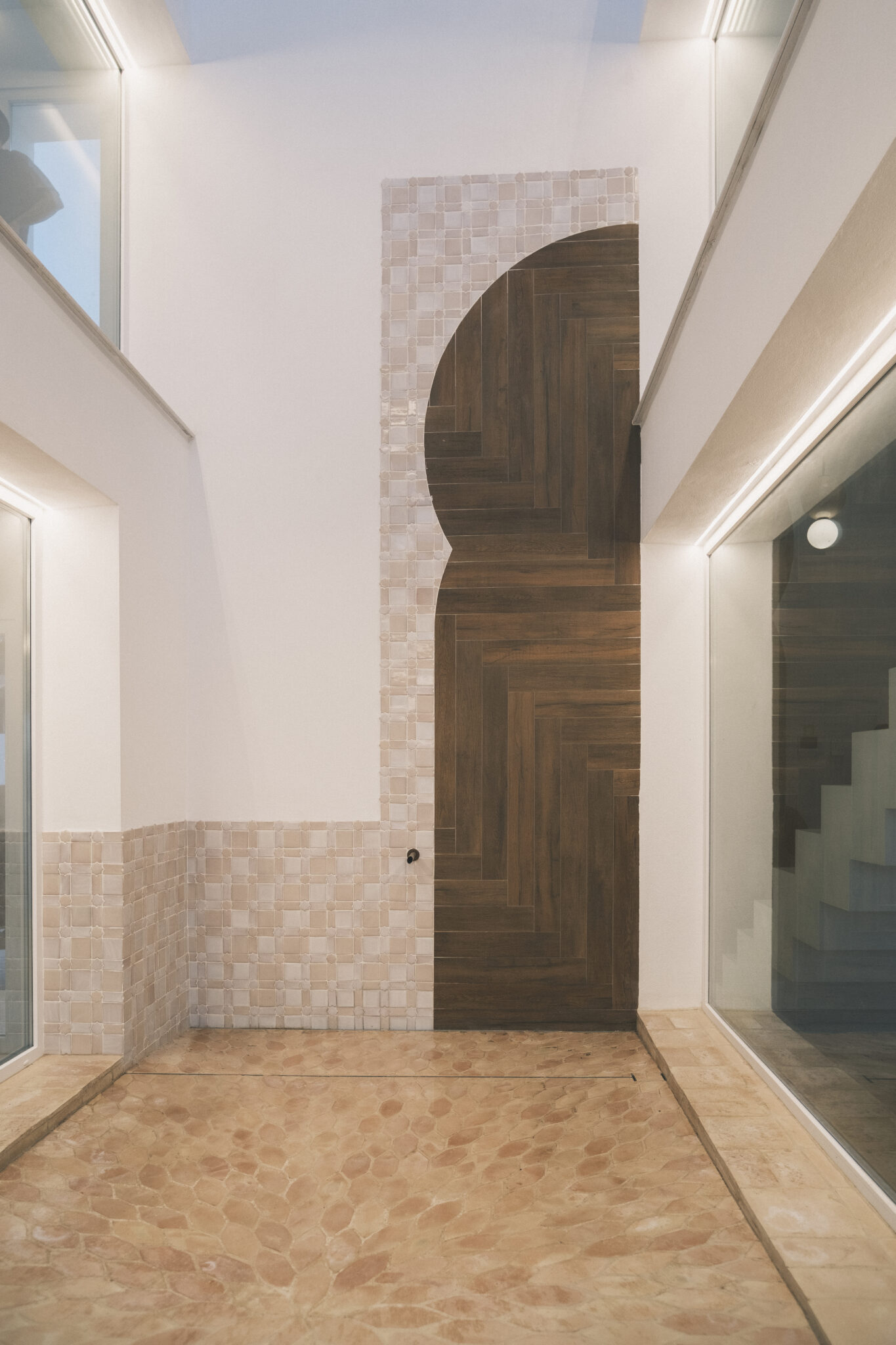 El acceso se produce a través de una falsa puerta realizada a medida. Su ligero retranqueo genera profundidad y un punto de misterio antes de entrar. En el interior aparecen azulejos artesanales con patrones históricos reinterpretados en una gama de colores más actual, y recursos tomados de la vega granadina, como las tramas de los secaderos, traducidas aquí en celosías cerámicas que controlan la luz y filtran las visuales.