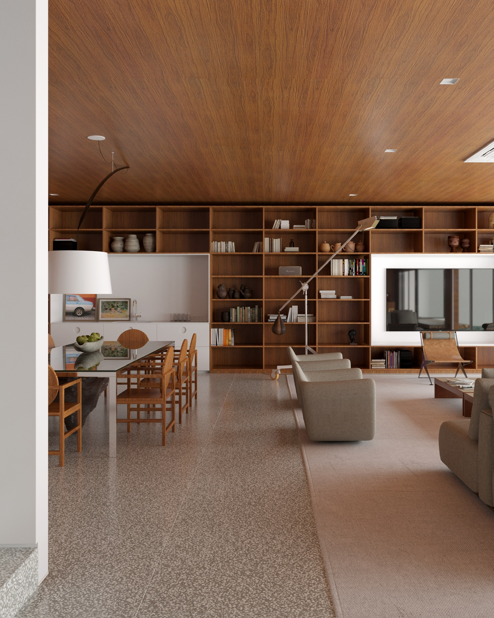 El mobiliario firmado, en su mayoría nacional, aporta geometría, textura y brasilidad, característica distintiva del Estudio Cara. La mesa de comidas rápidas fue desarrollada exclusivamente para este proyecto, estableciendo una conexión material con la mesa de comedor principal.