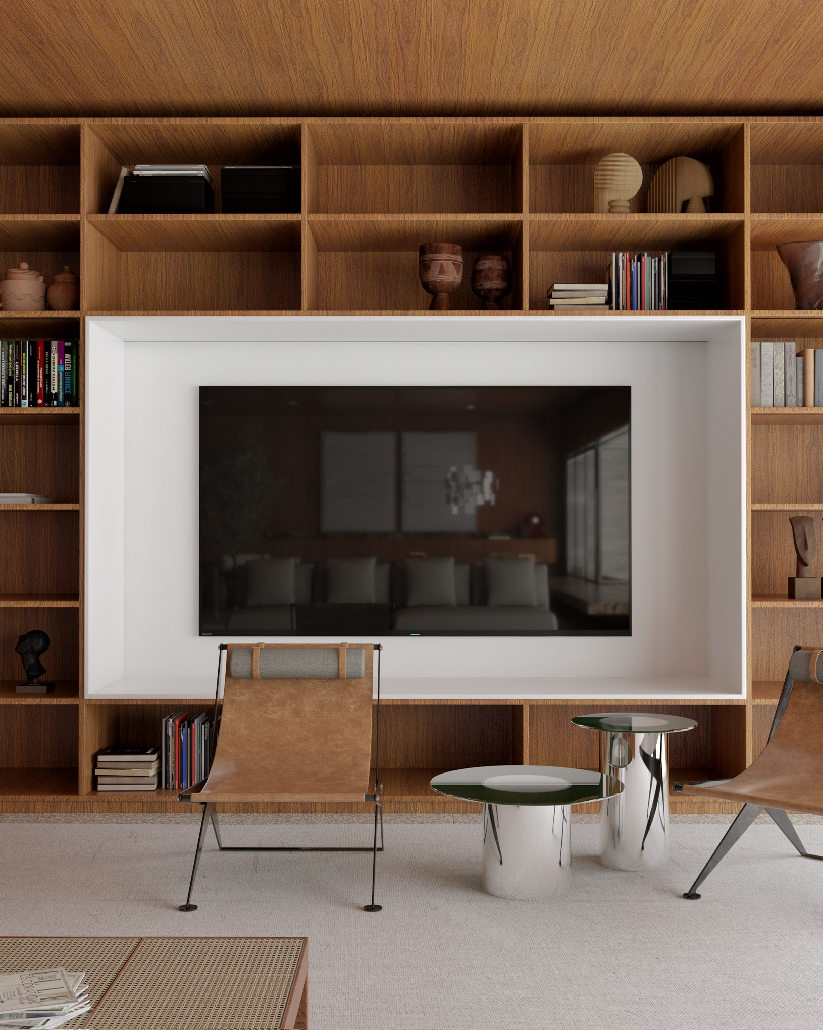 La estantería es el elemento central del proyecto y uno de los puntos más importantes de toda la intervención. Conecta cocina, sala de televisión y comedor de forma sutil: el área húmeda de la cocina y el panel del televisor son módulos o nichos del mismo mueble. Todos los nichos reciben iluminación para valorizar la colección de los clientes, desempeñando un papel fundamental en el proyecto de iluminación del piso.