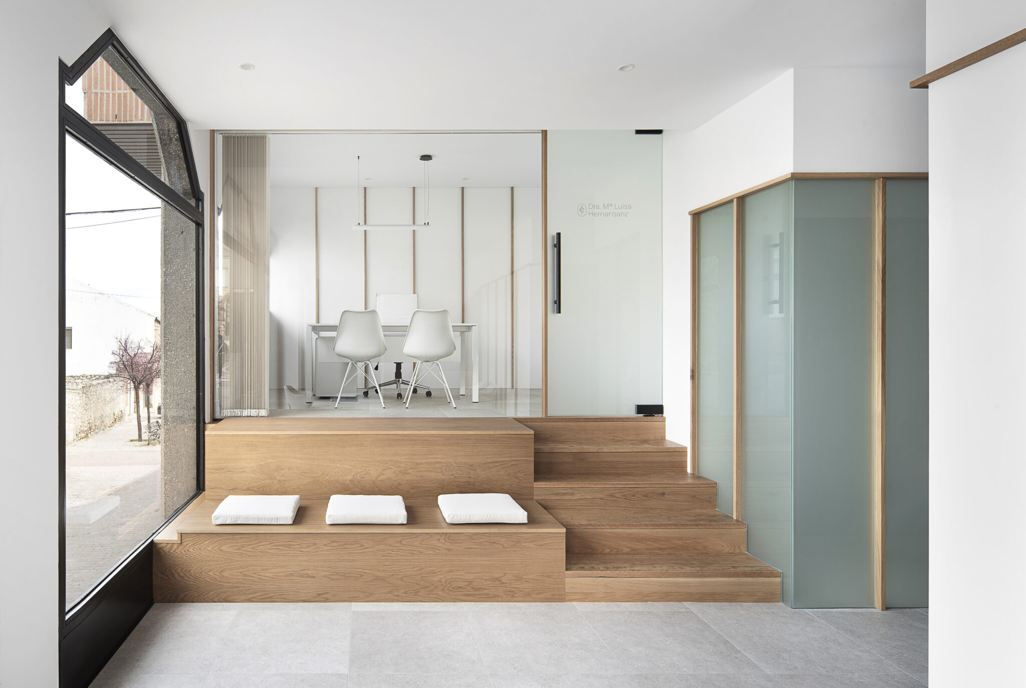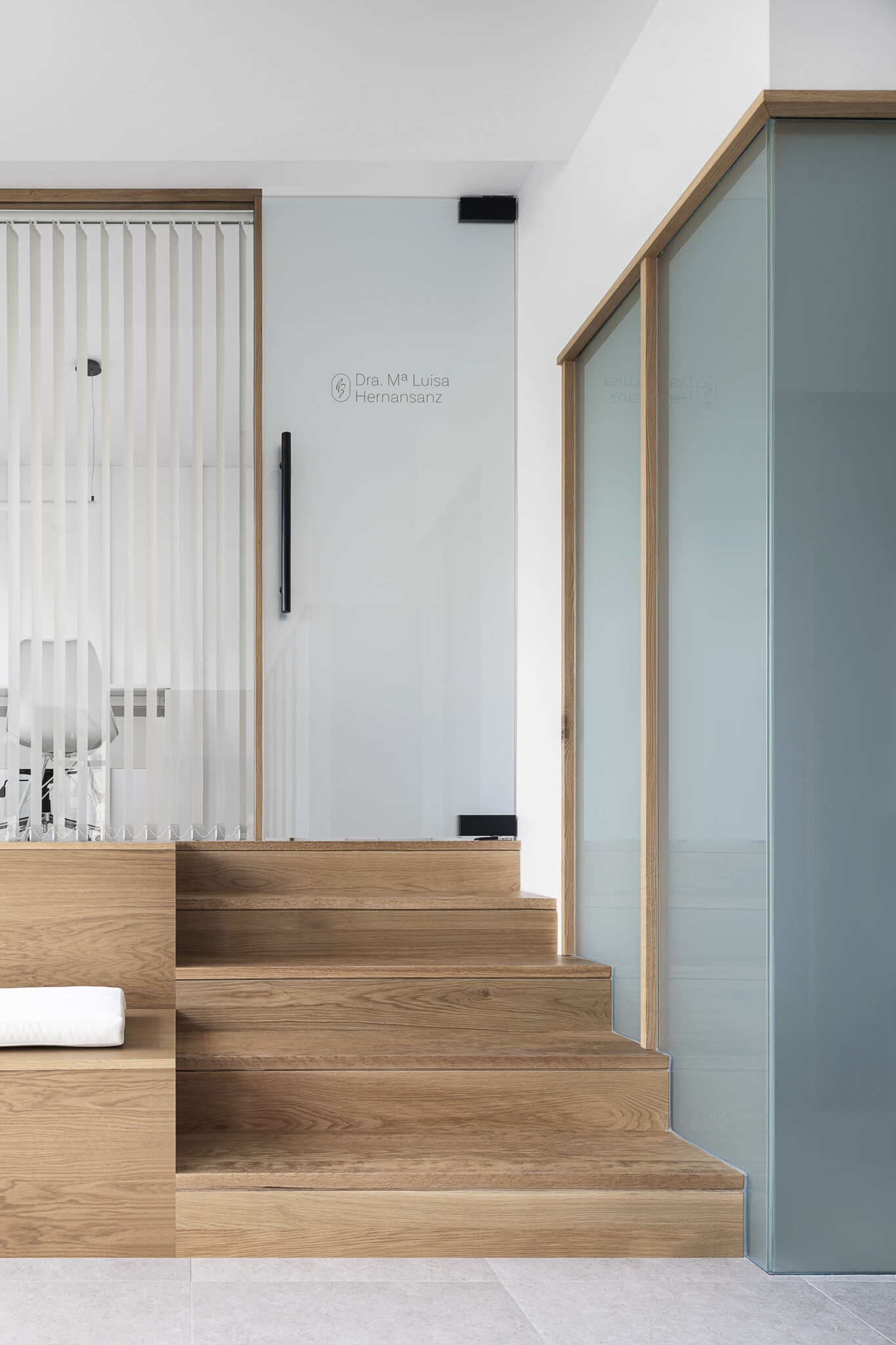 La madera de roble es otro de los materiales clave del proyecto. Se emplea en el revestimiento de listones que modula y delimita las estancias privadas, aportando calidez y continuidad al conjunto. También está presente en elementos funcionales y decorativos como el mueble separador entre recepción y sala de espera, así como en las escaleras de acceso al despacho, que se transforman en un graderío y zona de asiento. Sobre este volumen de roble, un espejo ahumado estratégicamente colocado en recepción amplía visualmente el espacio y aporta sofisticación.